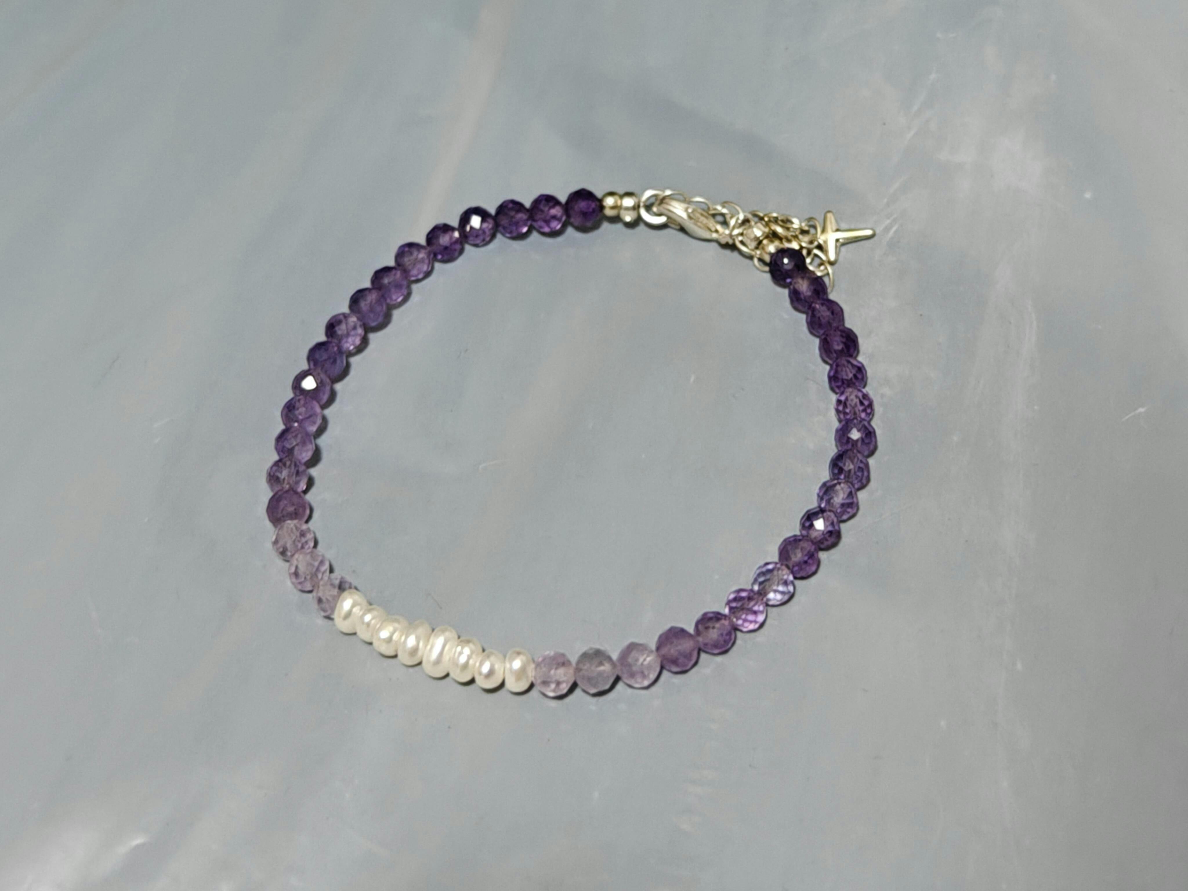 アジサイ園にインスパイアされたこのブレスレットは、きらめくファセットカットのアメジストビーズが、動くたびに柔らかな光を捉えます。中央のバロックパールが有機的な質感を添え、2月の誕生石が、毎日の装いに清らかさ、穏やかさ、そして力強さをもたらします。