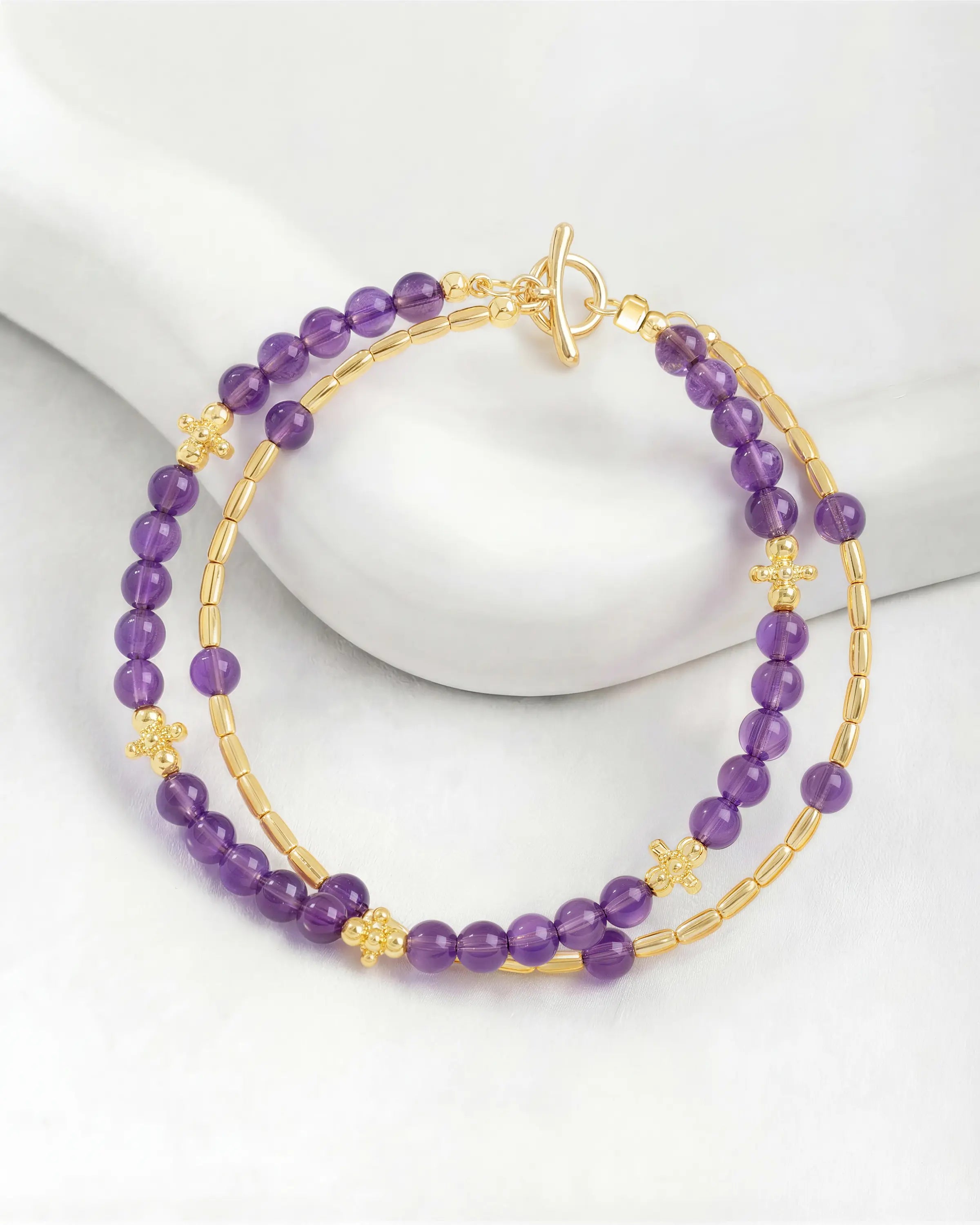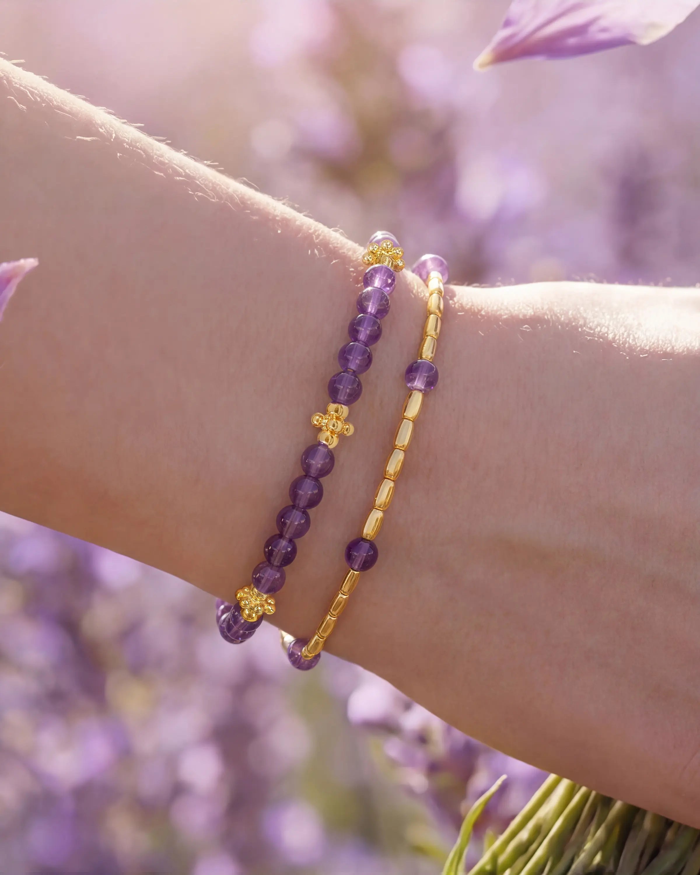 Effortless elegance in a single click. This duo-chain bracelet interweaves gold beads with 4mm Amethyst in a rhythmic sequence, giving you a perfectly curated, tangle-free layered look. While the violet hue awakens your Intuition, Amethyst brings a sense of Inner Peace—the ideal companion for a quiet afternoon lost in a book or a starlit dinner date.
