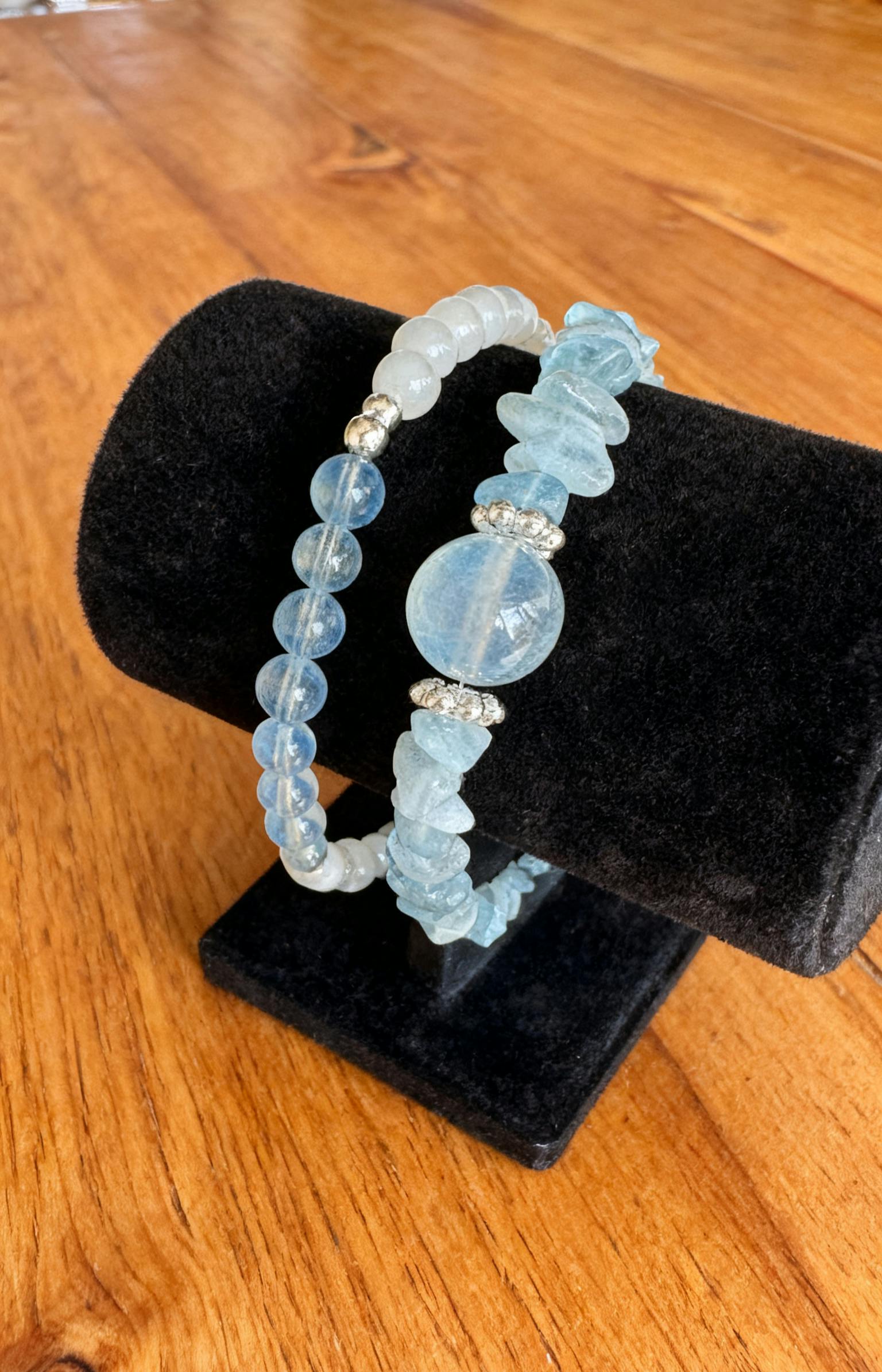 海の波にインスピレーションを得たこのビーズブレスレットは、アクアマリンとムーンストーンを交互にあしらい、柔らかで流れるような模様を描き出しています。3月の誕生石であるアクアマリンは、明晰さと穏やかさをもたらし、ムーンストーンはバランス感覚と直感力を高めます。日々の穏やかさを彩る、優雅な一品です。