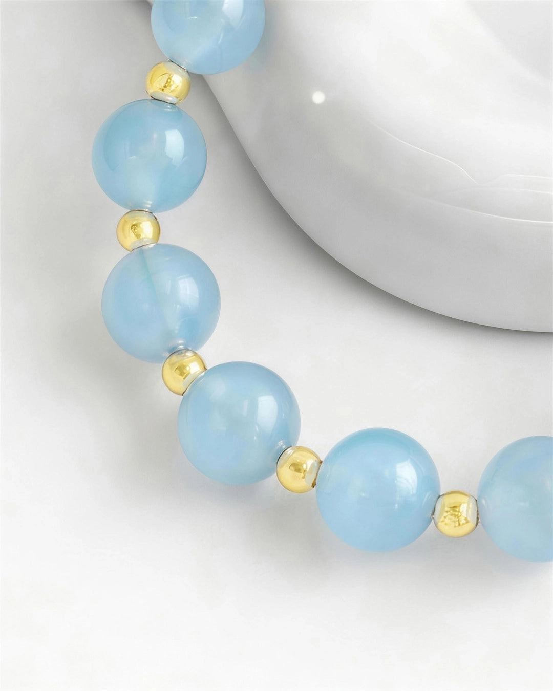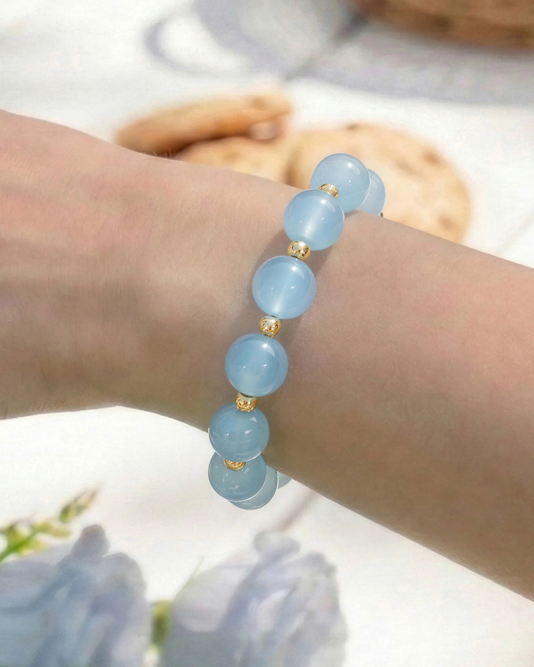 A cooling touch for a hectic mind. Like a dip in the ocean on a hot summer day, the crystal-clear blue of these Aquamarine beads instantly washes away stress. Interspersed with rhythmic gold spacers, this bracelet captures the fluidity of water, offering a serene escape from the noise and bringing a wave of tranquility to your wrist.