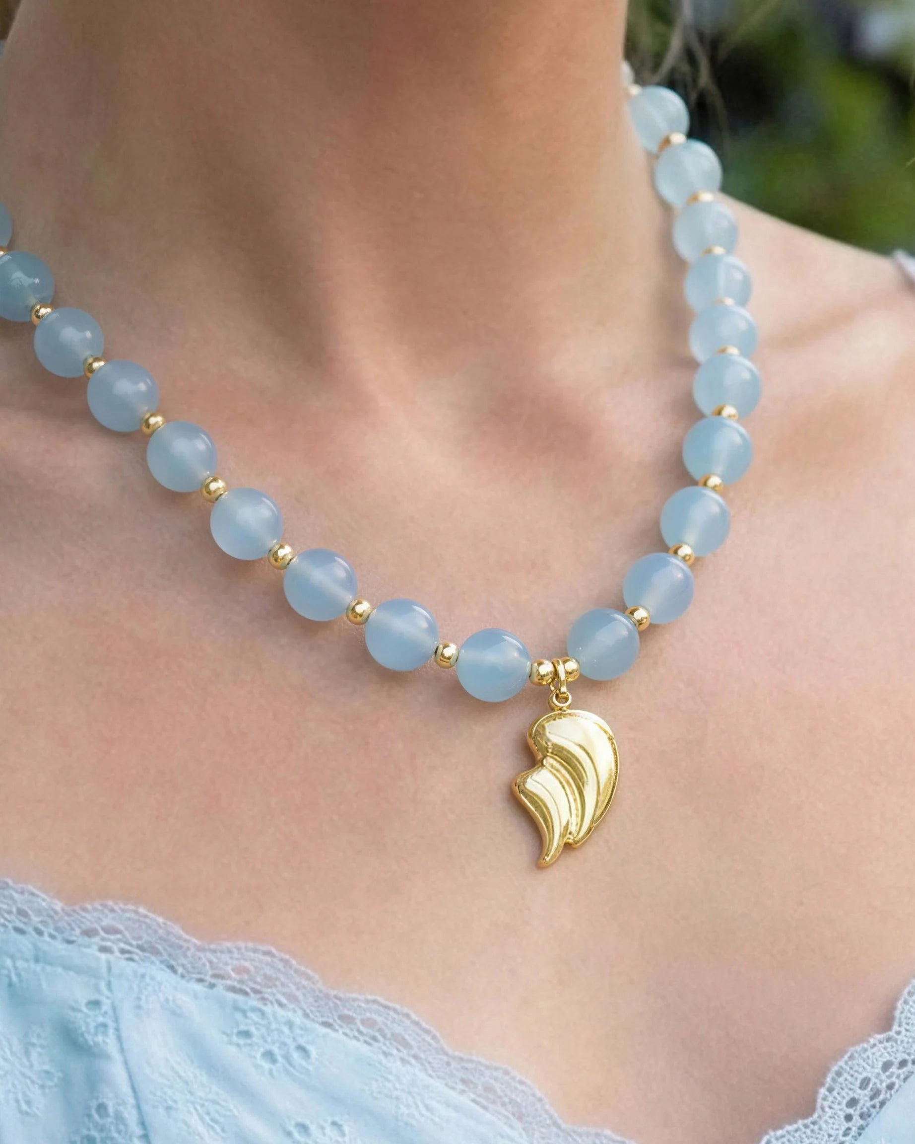 A cooling breeze for a hectic day. Like diving into fresh water, the translucent blue of these 10mm Aquamarine beads offers an immediate visual reset when the world feels too loud. Anchored by the fluid golden teardrop, this necklace is your reminder to soften your shoulders and breathe—whether you are powering through a high-stakes meeting or simply unwinding with a glass of wine by the window at sunset.