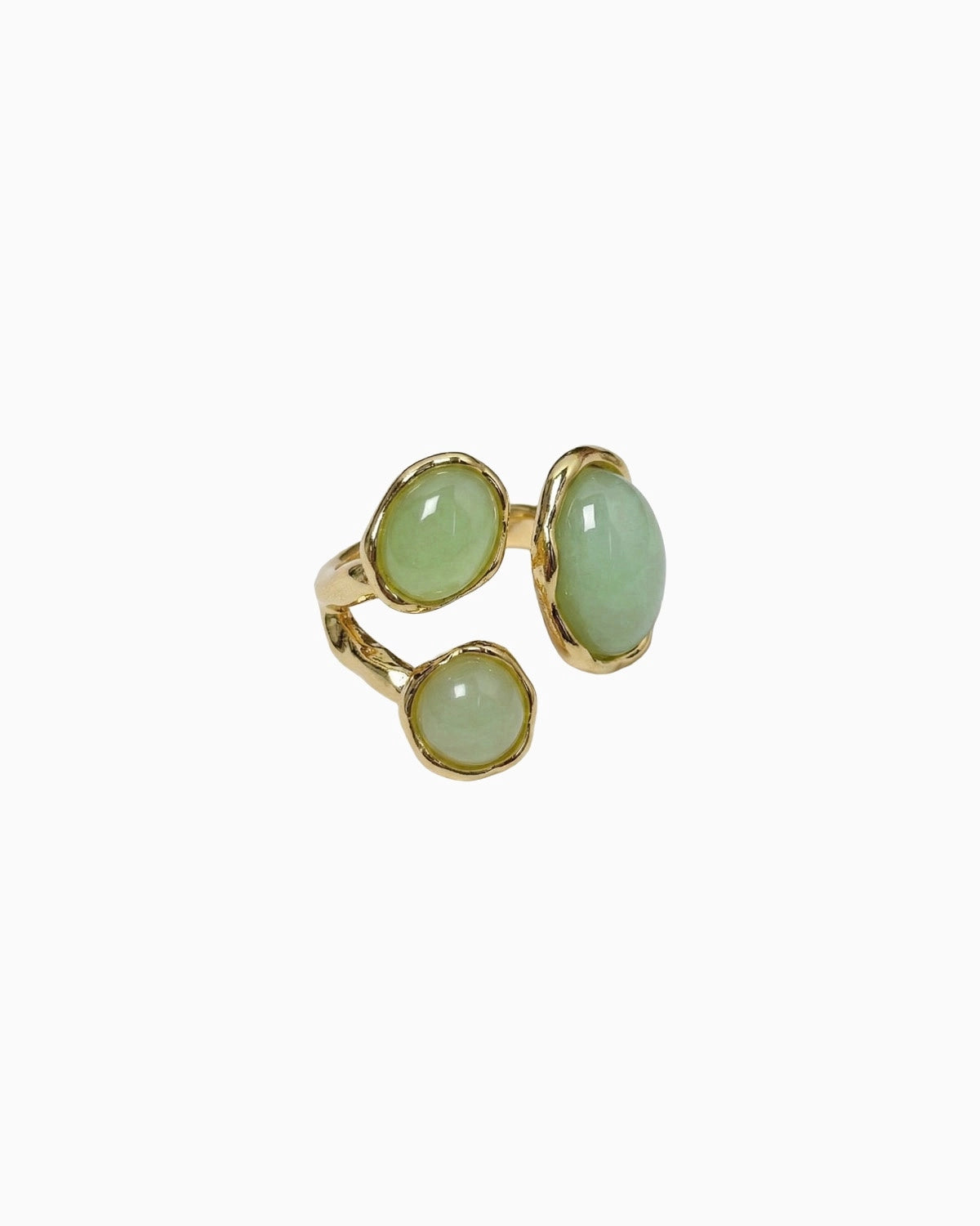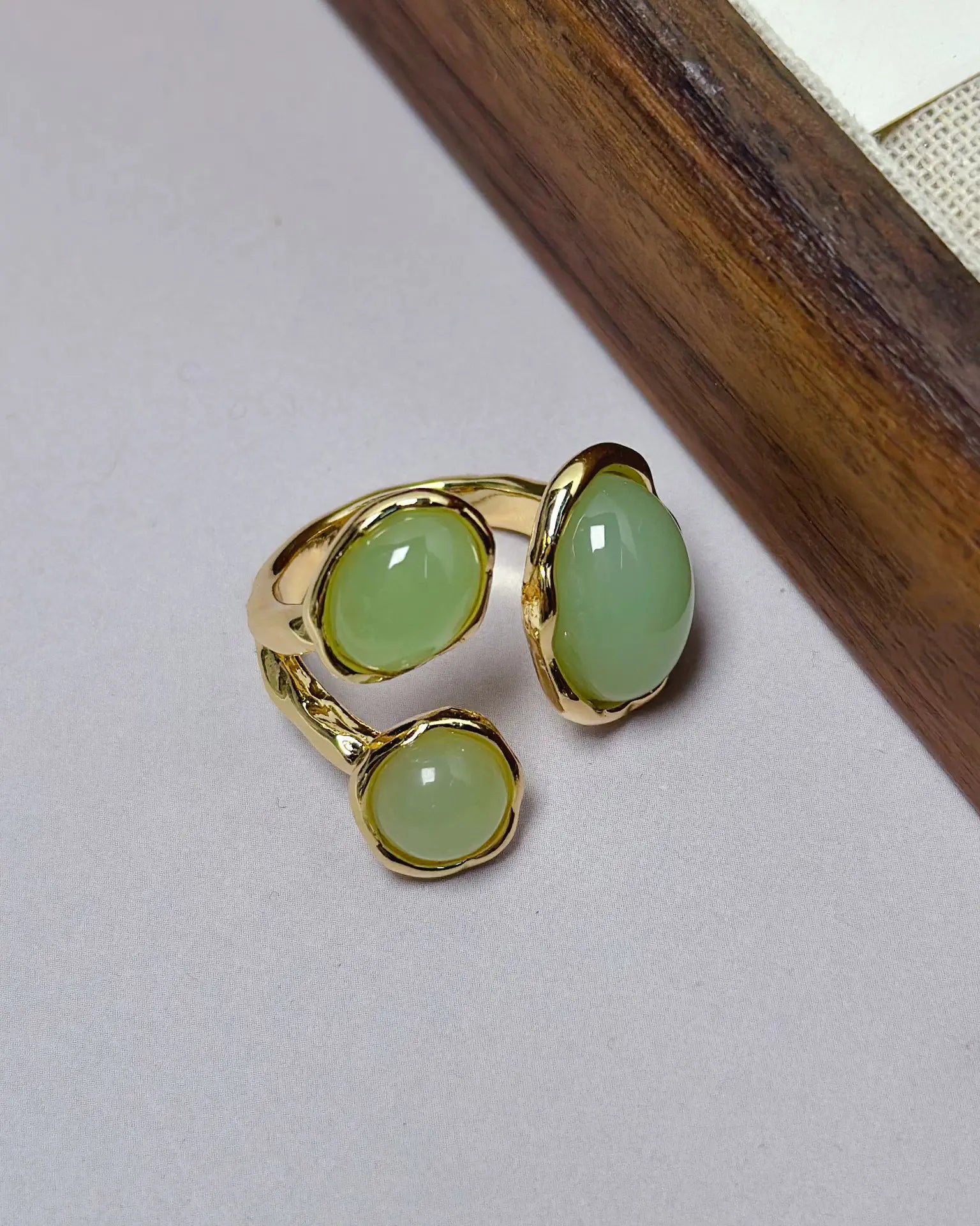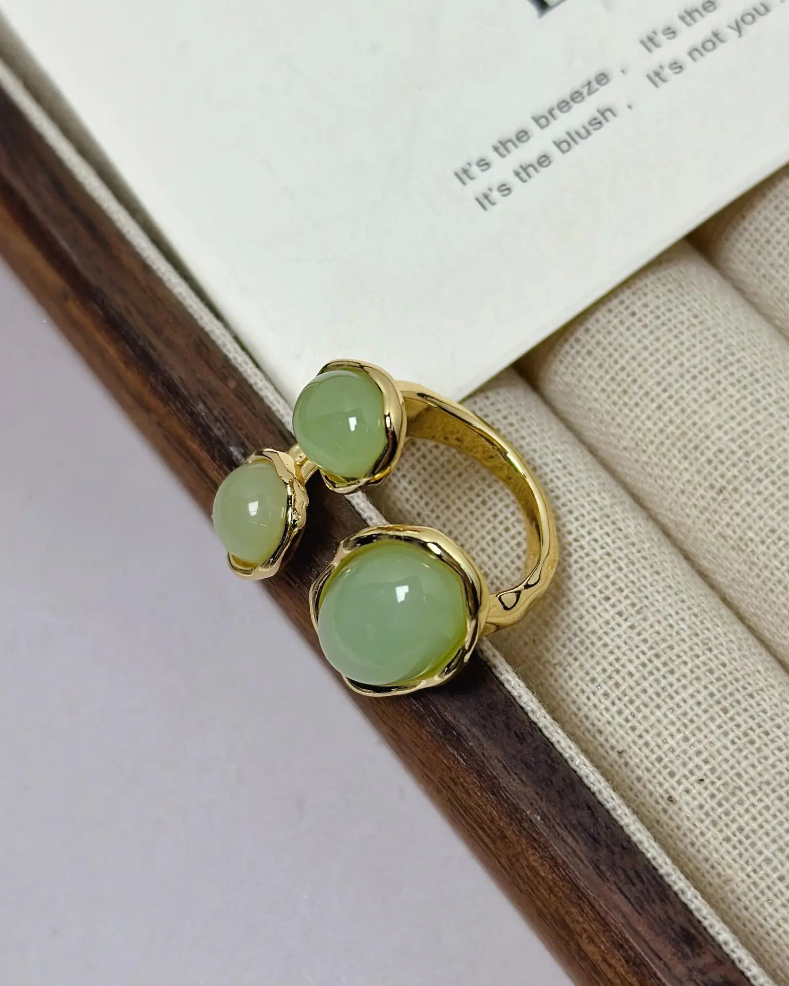 マラカイトの再生のエネルギーに根ざしたこのオープンリングは、二つの輝く涙型の石が優美なシンメトリーに向かい合うように配置されています。渦巻く緑の模様は、動きと深みの自然なハーモニーを生み出し、変容と揺るぎない自信を象徴しています。