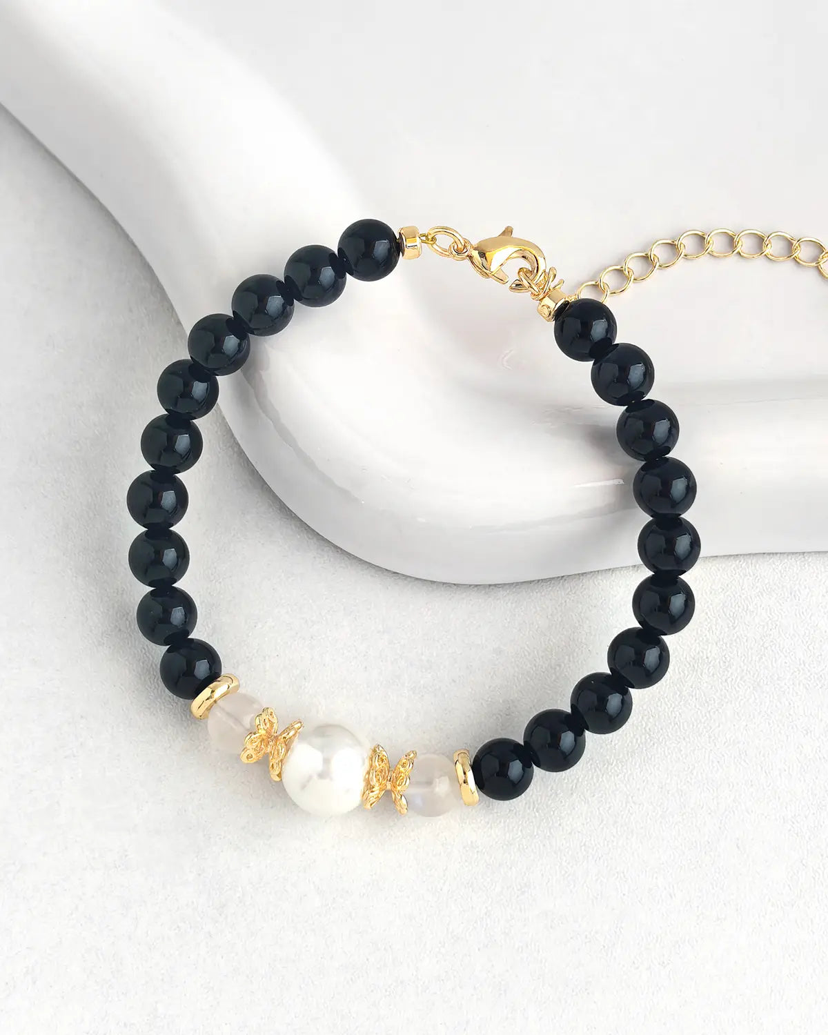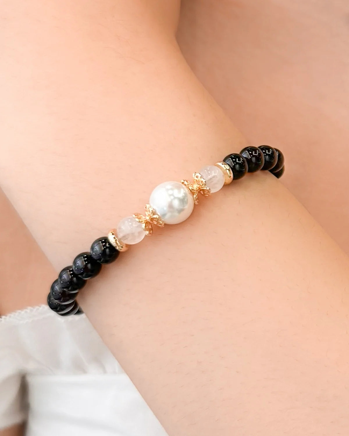 月光蝶にインスパイアされた、このハンドクラフトのブレスレットは、6mmのファセットカットブラックオニキス(ブラックアゲートとも呼ばれます)、7mmのムーンストーンのアクセント、そして輝く10mmのパールをセンターピースとして組み合わせています。18Kゴールドメッキの925スターリングシルバーのディテールで仕上げられ、勇気と静かな優雅さが調和し、毎日身に着ける価値のある逸品です。