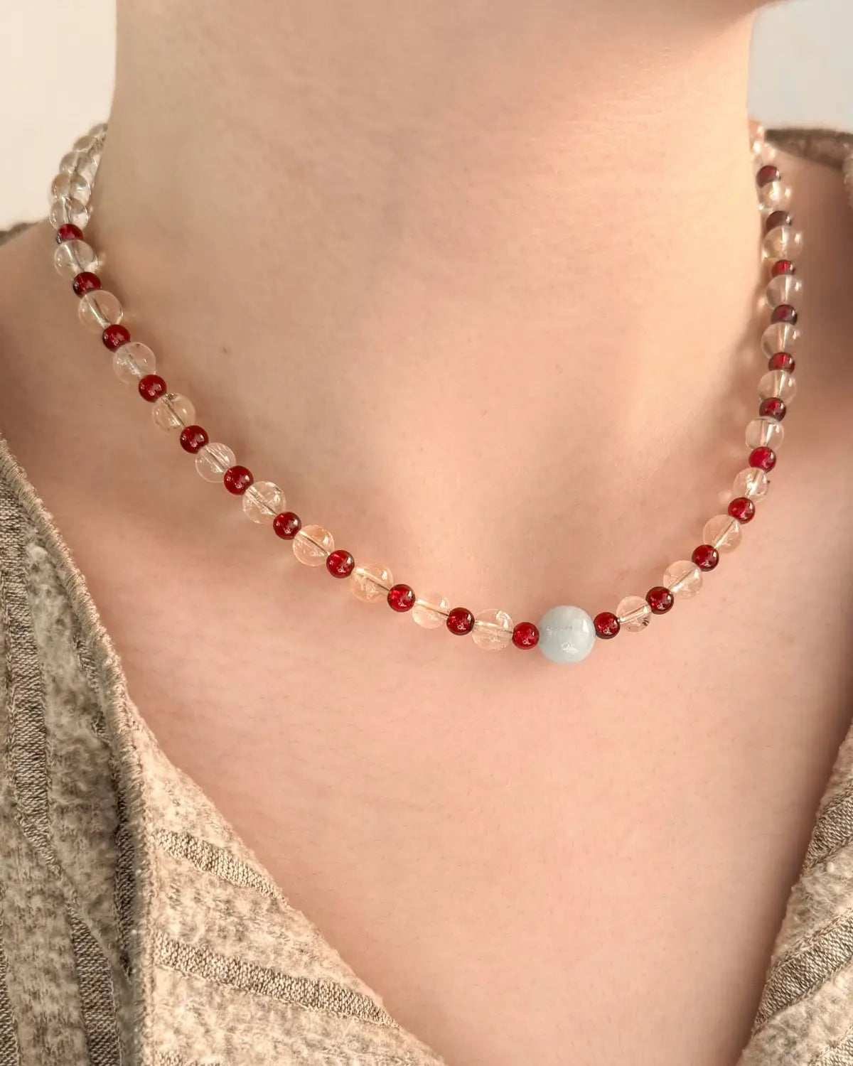 ビーチに沈む黄金の夕日にインスパイアされた、手作業で編まれたこのネックレスは、温かみのあるシトリンと深みのあるガーネットのビーズに、14Kゴールドメッキのスターリングシルバーのディテールがアクセントとしてあしらわれています。ひとつひとつのビーズが自然の美しさを映し出し、毎日のスタイルに豊かさ、喜び、そして勇気をもたらします。