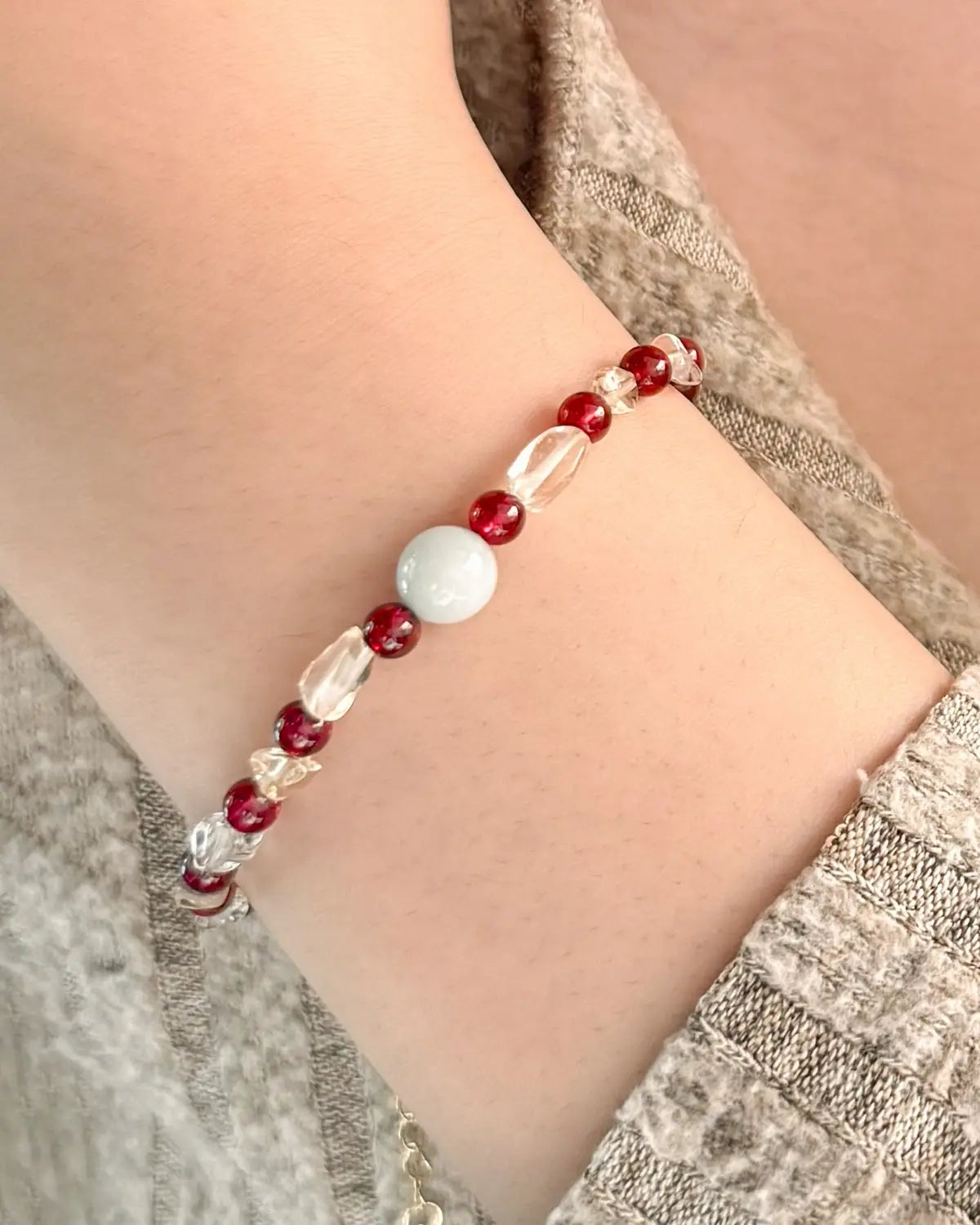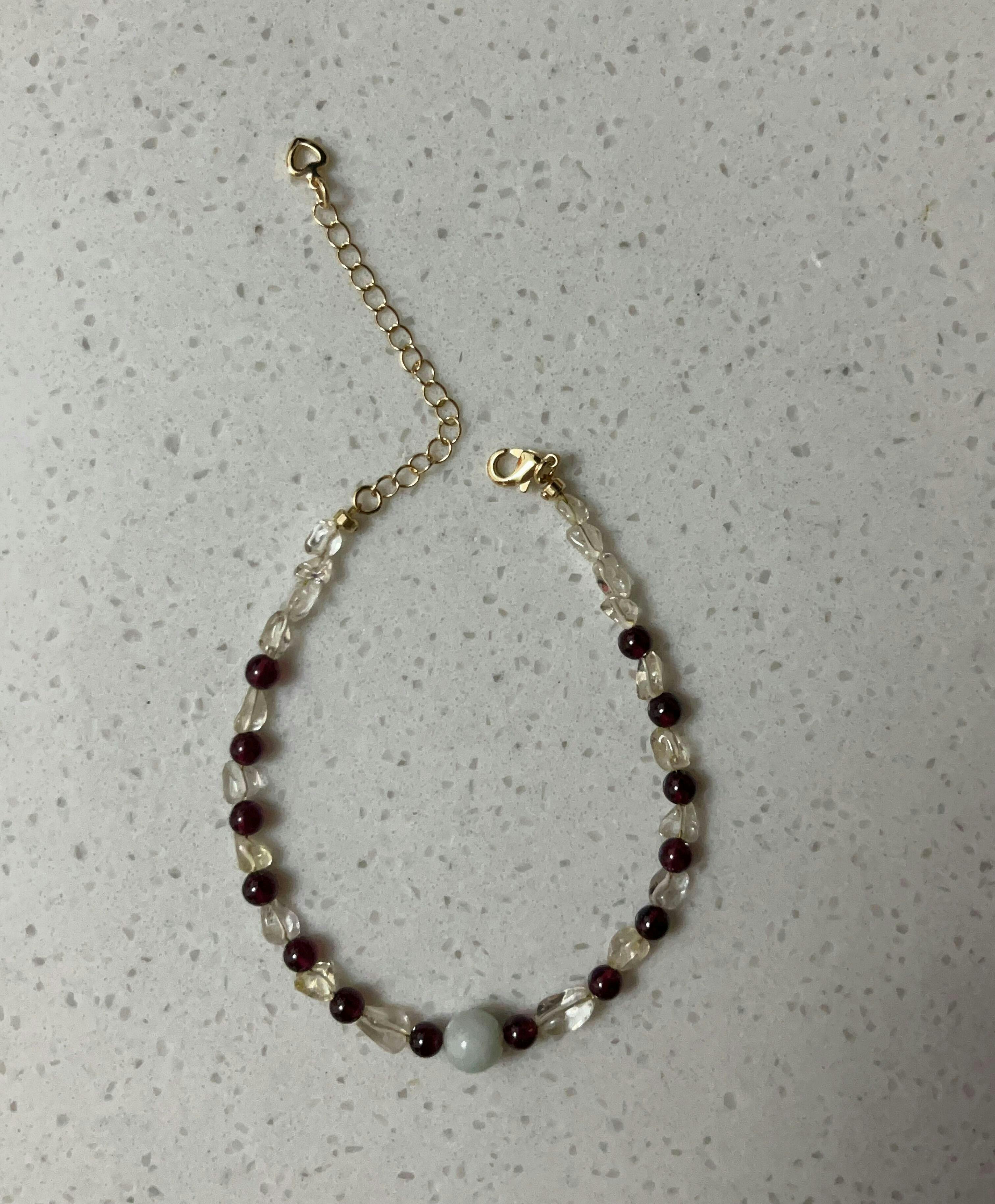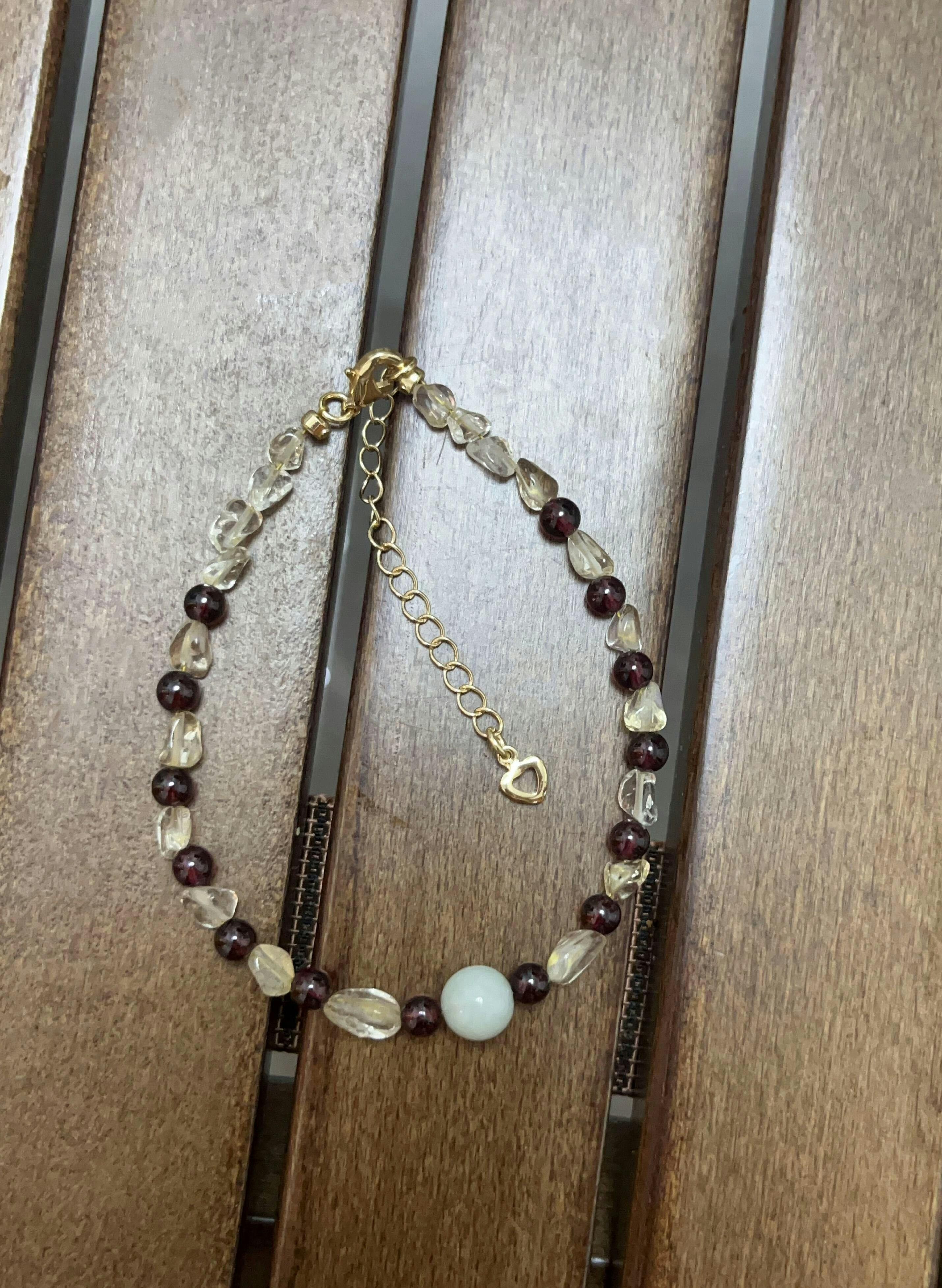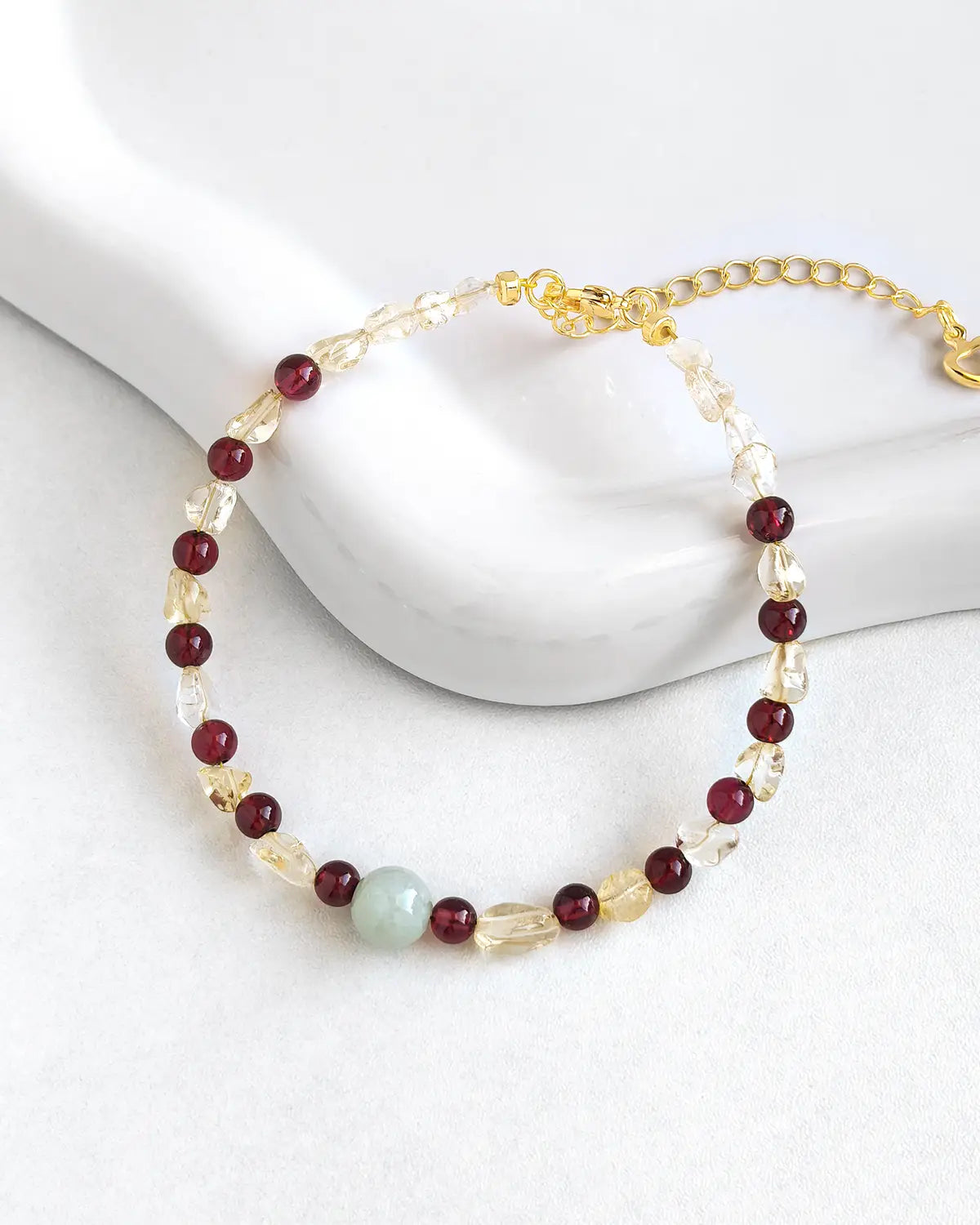 このブレスレットは、4~6mmの不規則なシトリンと4mmのラウンドガーネットのビーズを連ね、中央に3mmの翡翠のビーズをあしらったデザインです。太陽のようなシトリンと情熱的なガーネットが織りなす流麗な模様は、毎日のスタイルに明るい温かさと確かな力強さをもたらします。