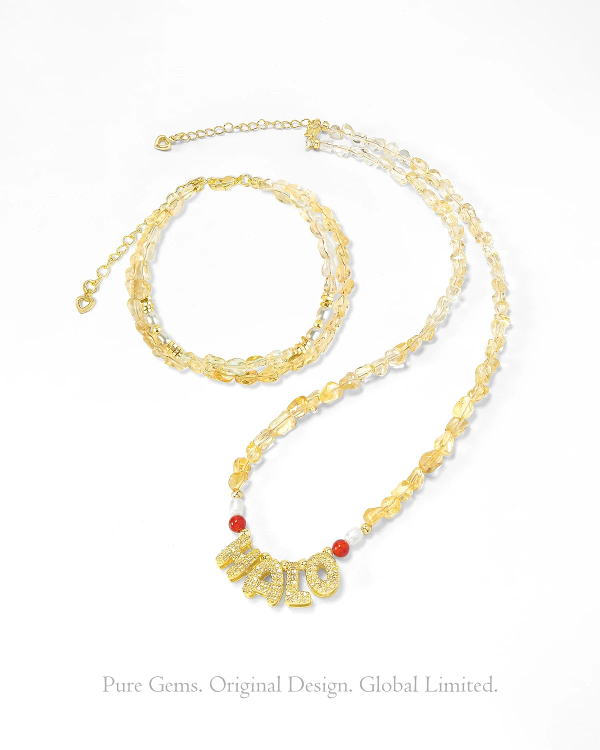太陽の黄金色の輝きにインスパイアされたこの宝石セットは、天然シトリン、レッドアゲート、そしてパールを組み合わせました。ビーズネックレスにはHALOチャームが施され、重ね付けしたブレスレットは深みと輝きを添えています。エネルギー、自信、そして高揚感あふれる力強さを体現しています。