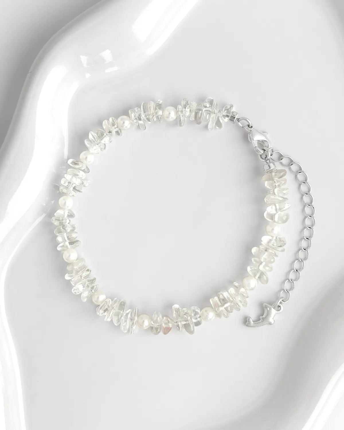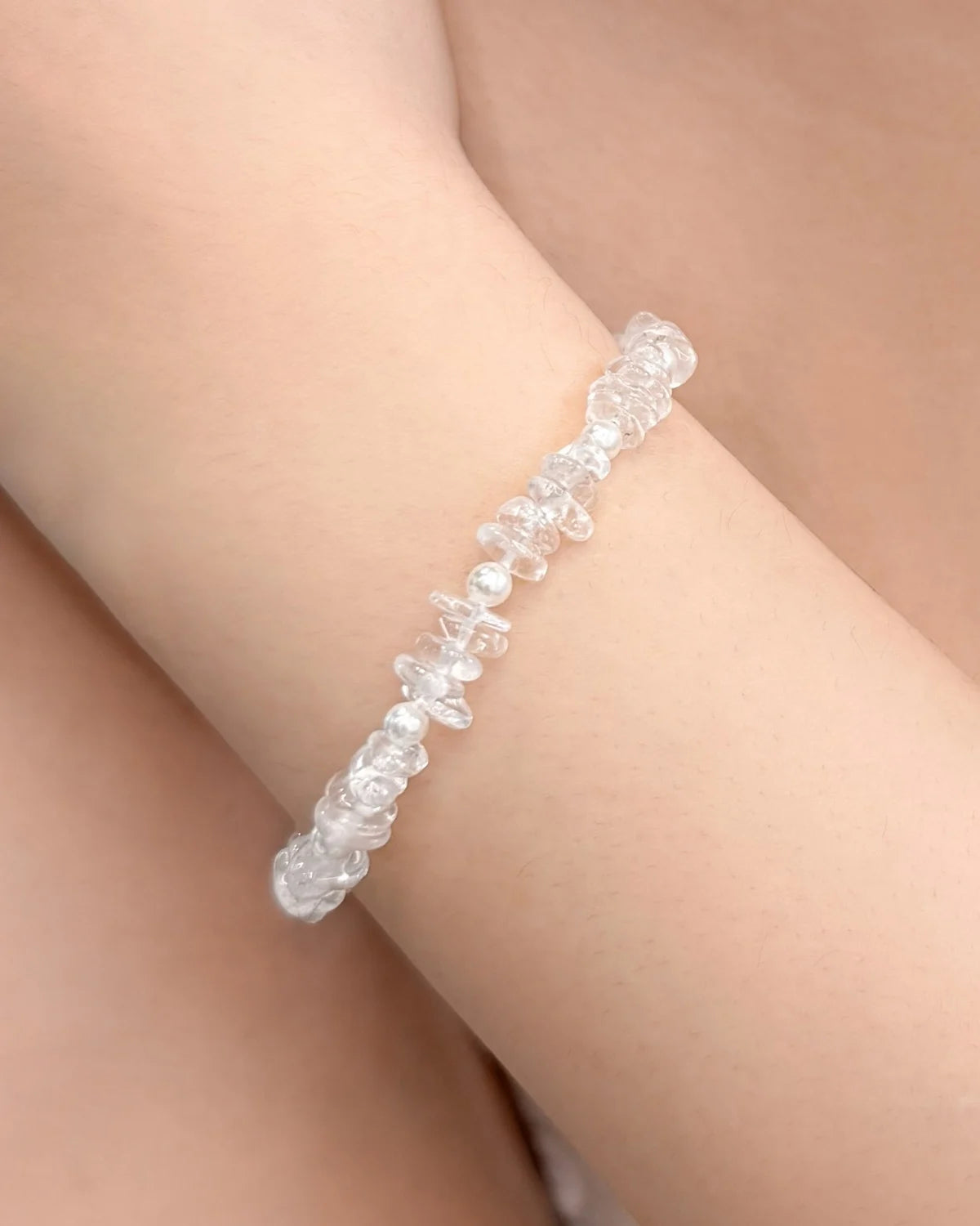 クリスタルの花瓶に咲いた白いチューリップにインスピレーションを得たこのブレスレットは、不規則な透明クォーツビーズに柔らかなパールをあしらい、4月の誕生石のありのままの美しさを捉えています。透明感と輝きを増幅させることで知られるこのブレスレットは、毎日の装いにバランスと軽やかさ、そして静かな力を与えてくれます。