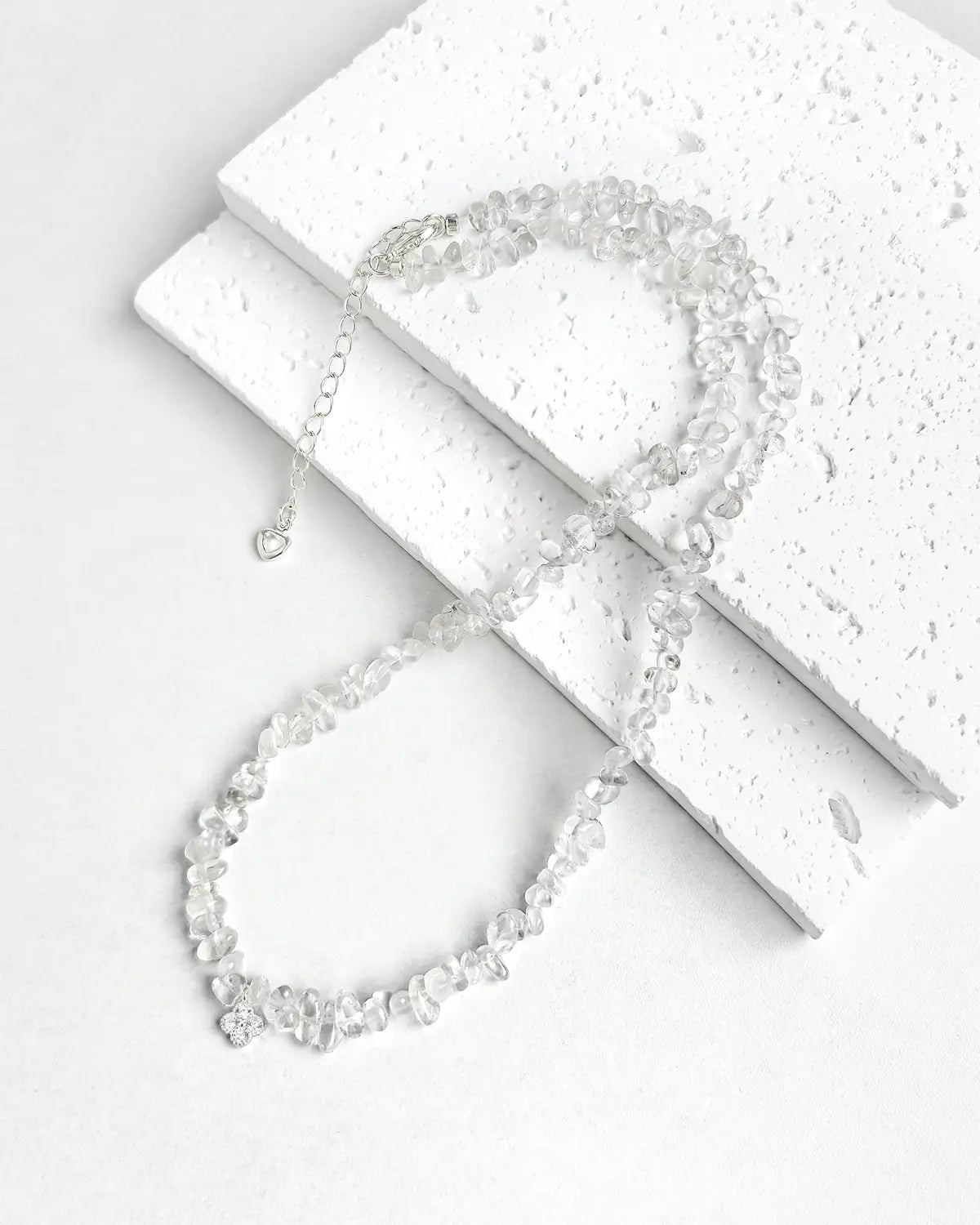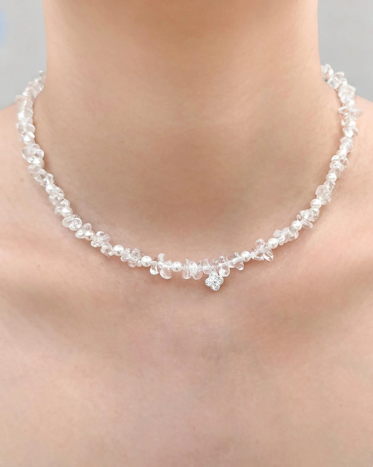 クリスタルの花瓶に咲いた白いチューリップにインスピレーションを得たこのネックレスは、4~5mmの不規則なクリアクォーツビーズと繊細な淡水パールを組み合わせ、透明感と優雅さが繊細に流れるような輝きを放ちます。925スターリングシルバーの四つ葉のクローバーチャームがアクセントとなり、4月の誕生石であるクローバーは、希望、調和、そして穏やかなエネルギーを呼び起こします。