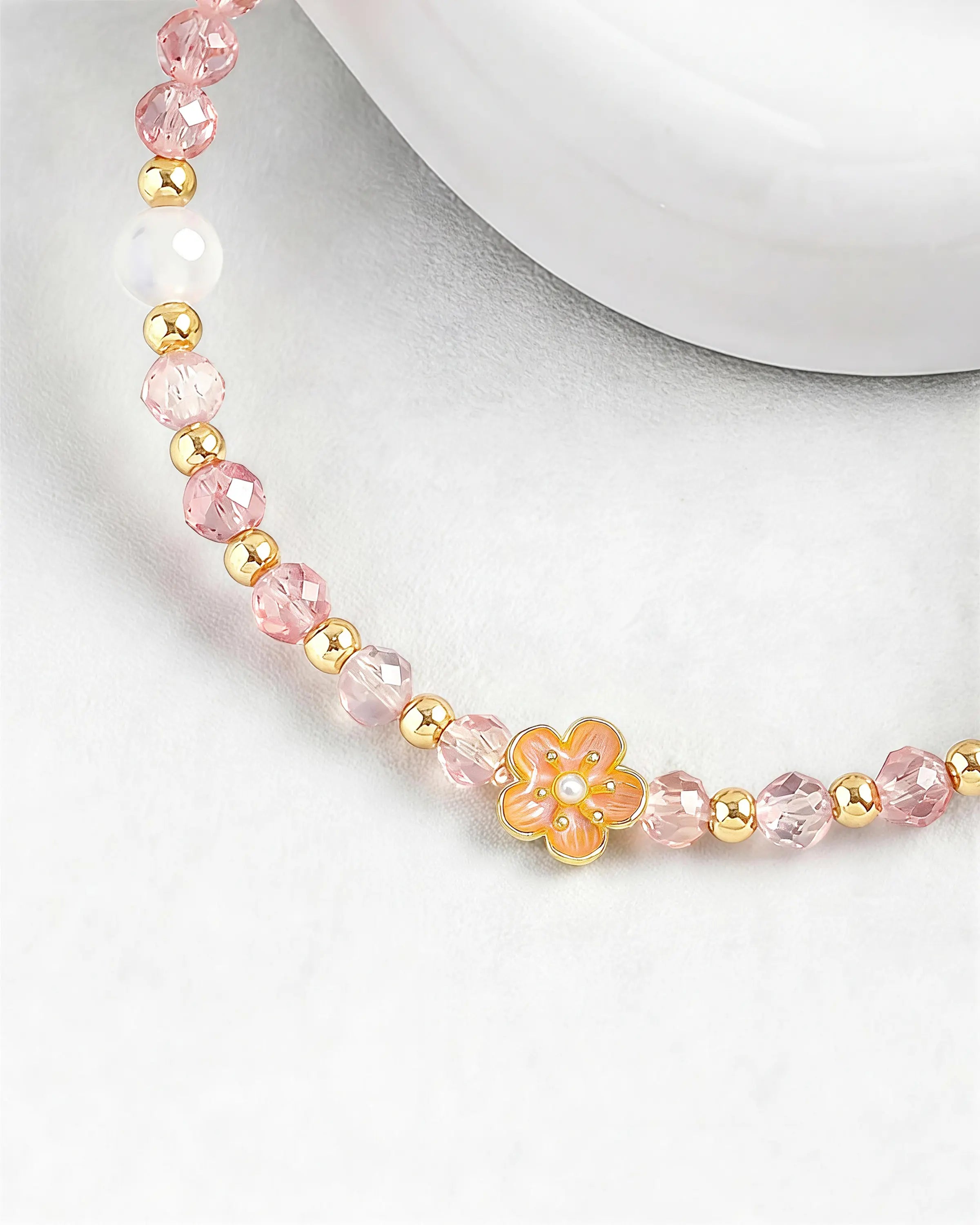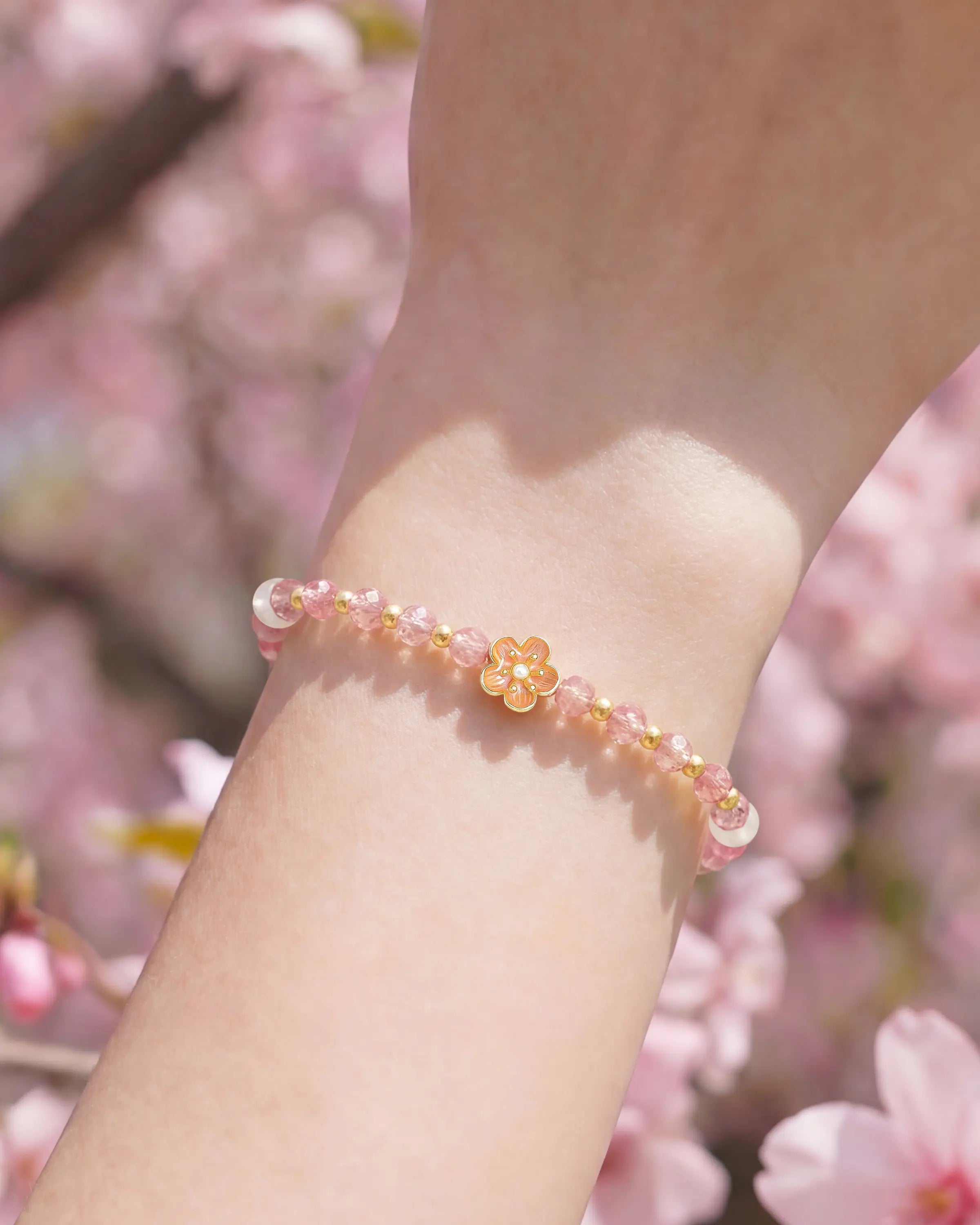 A touch of spring romance for your everyday style. This sweet strand features faceted Strawberry Quartz beads that glisten with soft pink hues, leading to a petite enamel flower charm. The tiny pearl center adds a delicate glow, while gold accents warm the rosy stones. Worn close to your pulse, it acts as a gentle reminder to embrace your softer side, bringing a sense of warmth and self-love to your daily routine.