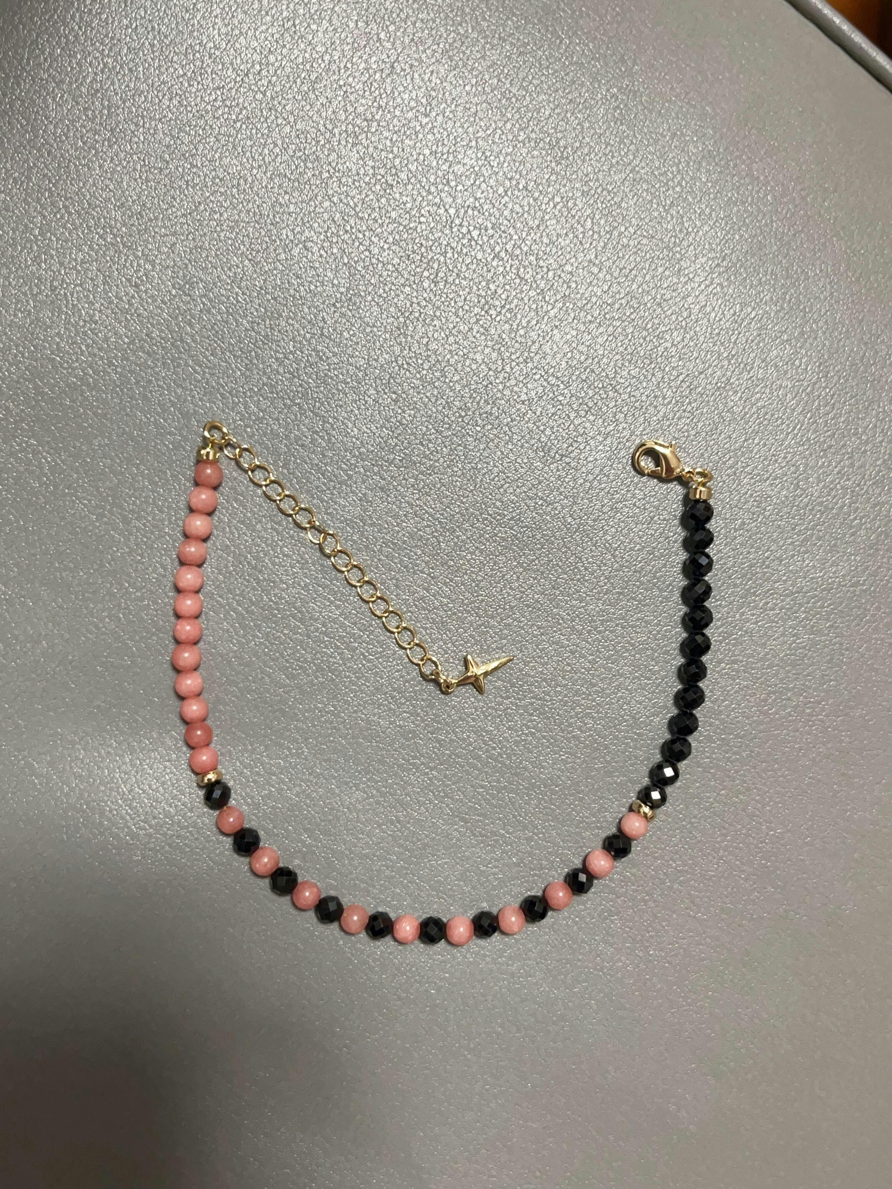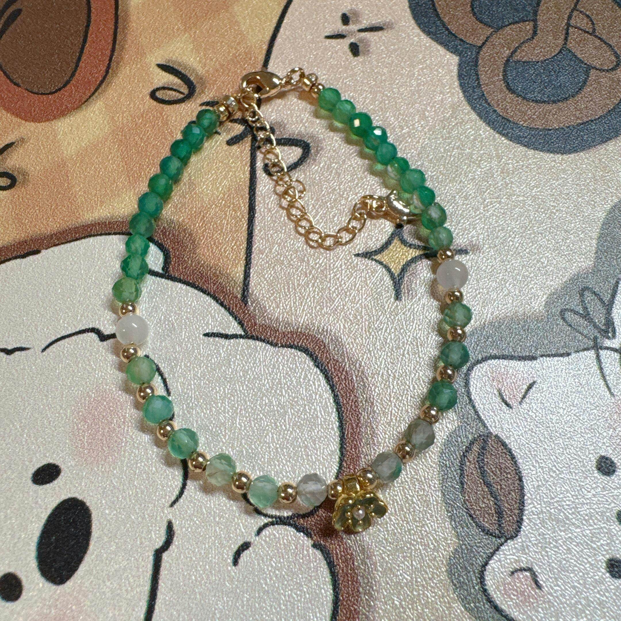 花をモチーフにしたこのシリーズのブレスレットは、5Aグレードのファセットカットのジェムストーンビーズを贅沢に使用し、中央には繊細な14Kゴールドメッキのフラワーチャームをあしらっています。ゴールドのマイクロスペーサーと輝くムーンストーンのアクセントが、それぞれのブレスレットに深みと輝きを添えています。