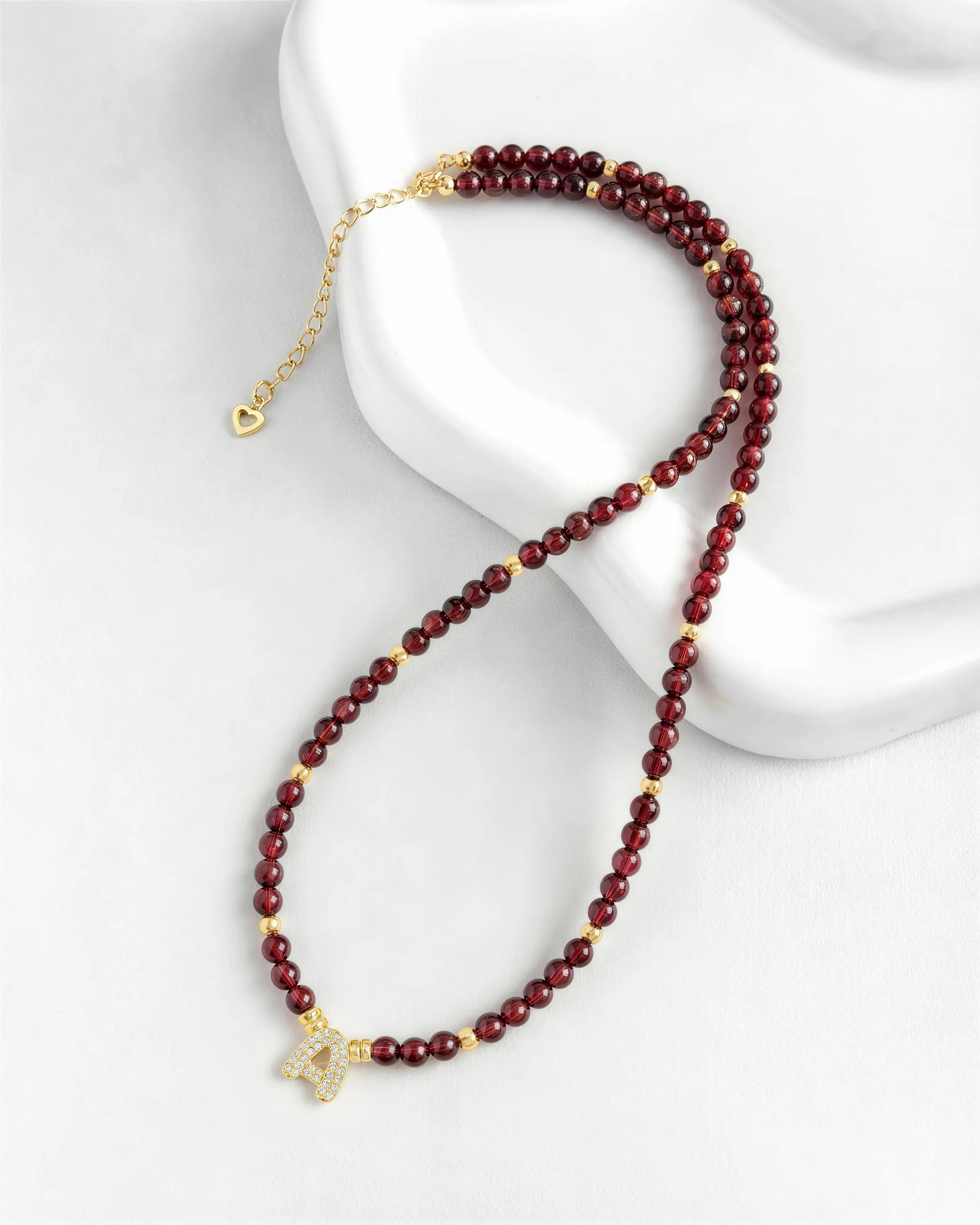 温かみと大胆さを併せ持つガーネットビーズネックレス。直径4mmの深紅のガーネットをあしらい、18金メッキのスペーサーでアクセントを添えています。中央にあしらわれたガーネットビーズが、さりげないエレガンスを添えています。1月の誕生石であるガーネットは、勇気と心からの情熱を呼び起こします。