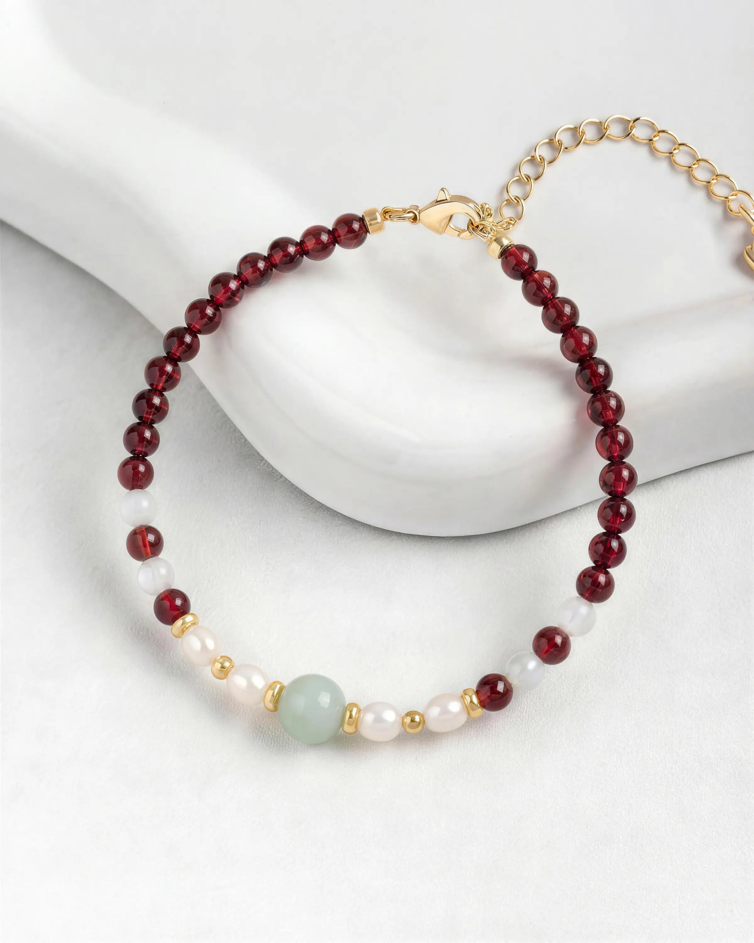 Each bead seems to hold its own world of color and light; the single jade in the center feels like a heartbeat, a calm green between warm garnet and dreamy moonstone. It's my quiet daily talisman.