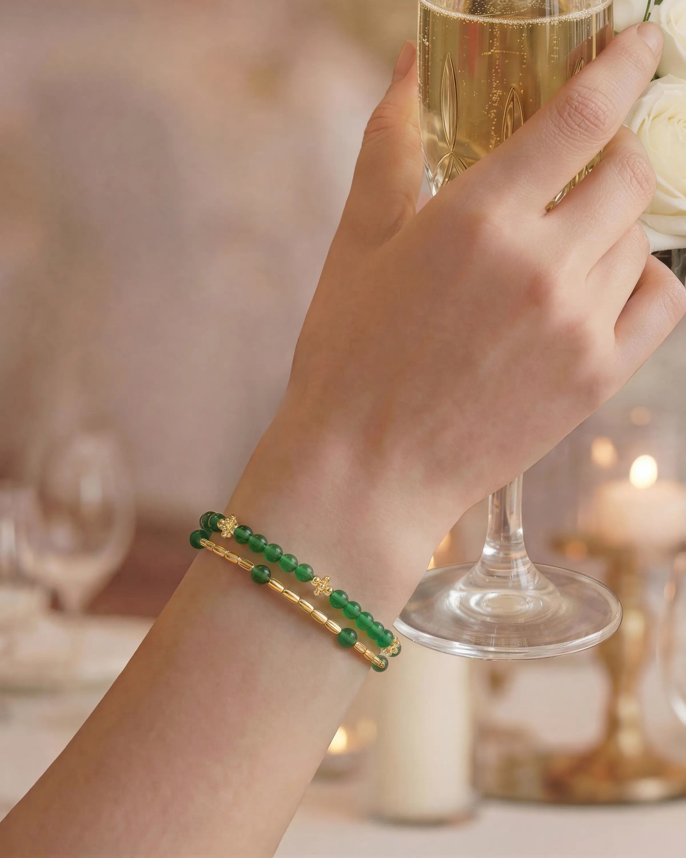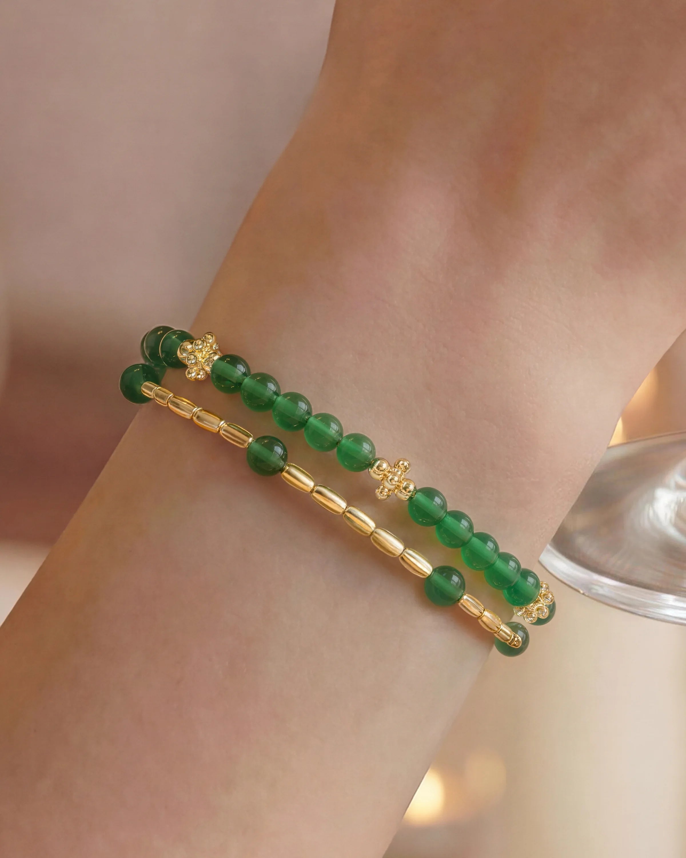 A visual fresh start for your jewelry stack. This duo-chain bracelet interweaves gold beads with leafy 4mm Green Agate in a rhythmic sequence, delivering a curated, layered look with the ease of a single piece. While the verdant hue invites Harmony, Green Agate is known for promoting Stability and growth. One effortless click of the signature toggle clasp secures your style, whether you’re heading to a morning meeting or a peaceful afternoon tea.