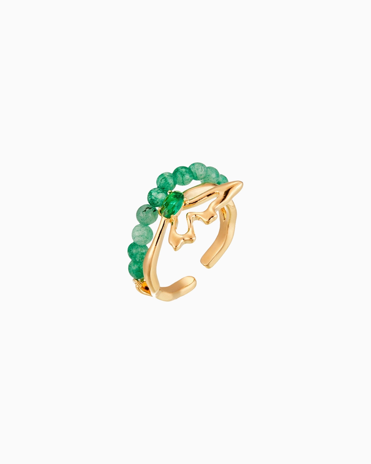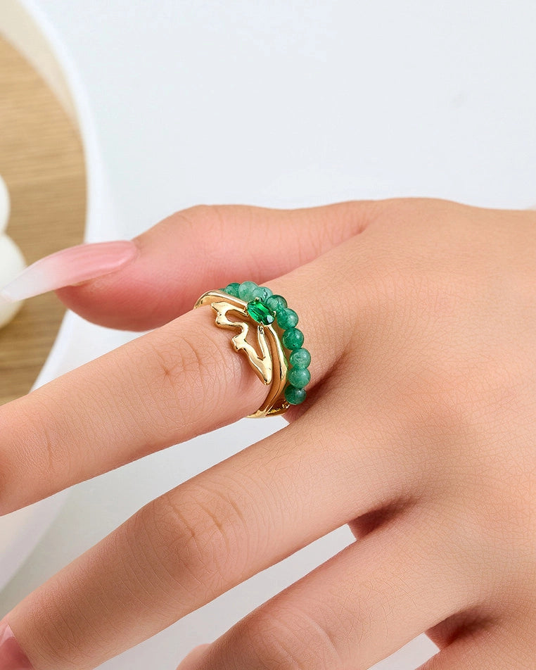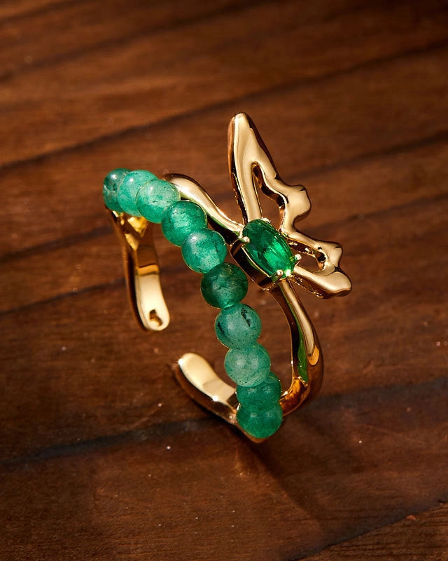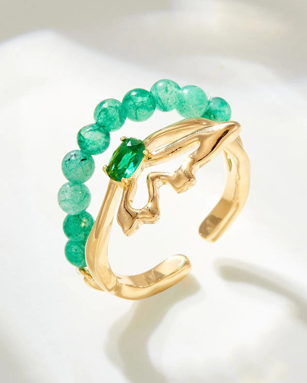 マラカイトの再生のエネルギーに根ざしたこのオープンリングは、二つの輝く涙型の石が優美なシンメトリーに向かい合うように配置されています。渦巻く緑の模様は、動きと深みの自然なハーモニーを生み出し、変容と揺るぎない自信を象徴しています。
