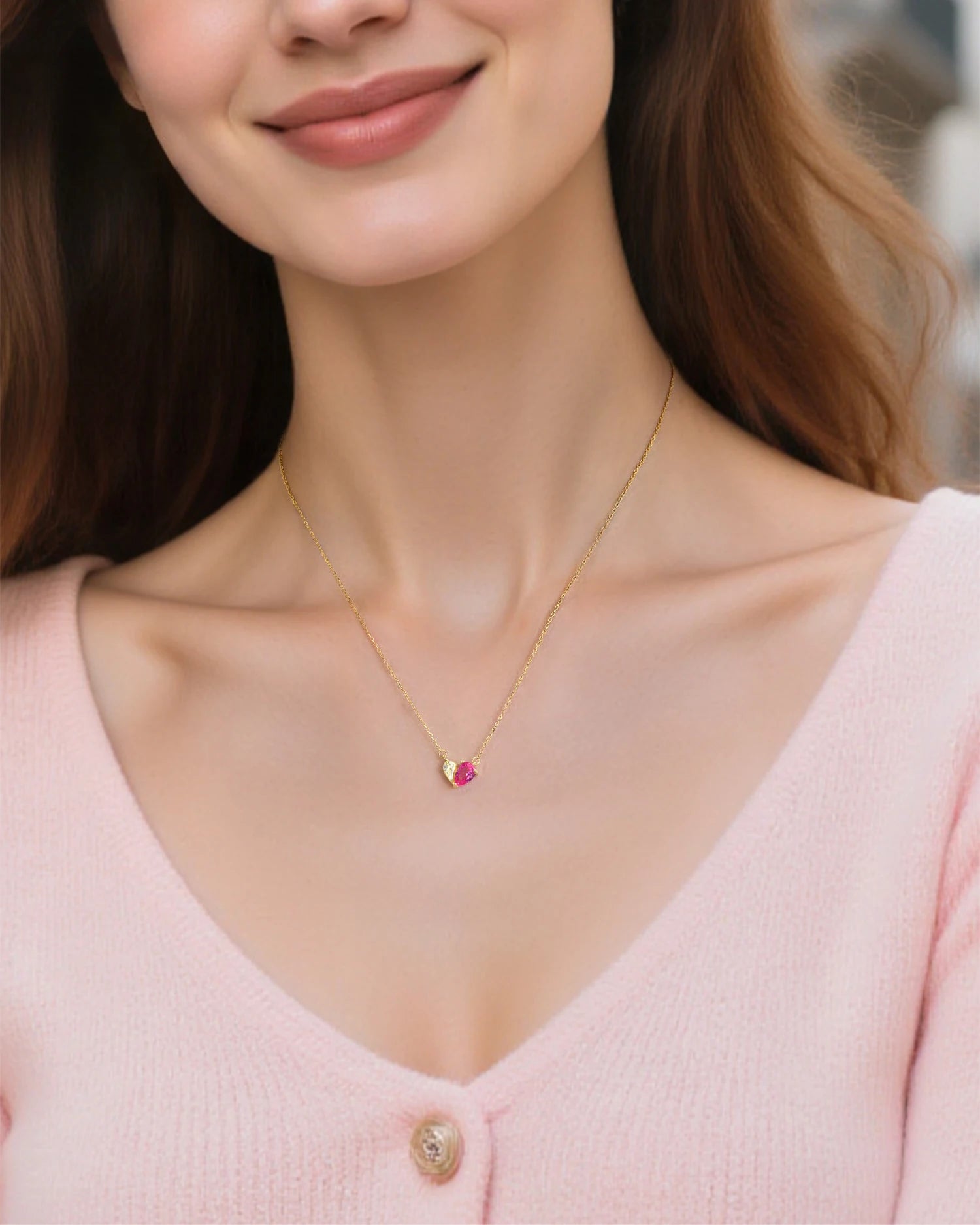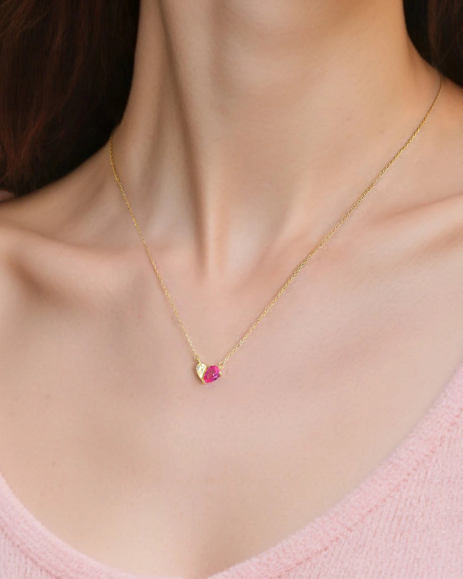 片側には柔らかなピンクのクリスタル、もう片側にはきらめくゴールドをあしらった、繊細なハート型のペンダントネックレス。14Kゴールドメッキのスターリングシルバーで仕立てられ、愛と献身を体現するこのネックレスは、贈り物にも、どんな装いにもロマンチックな雰囲気を添えるのに最適です。
