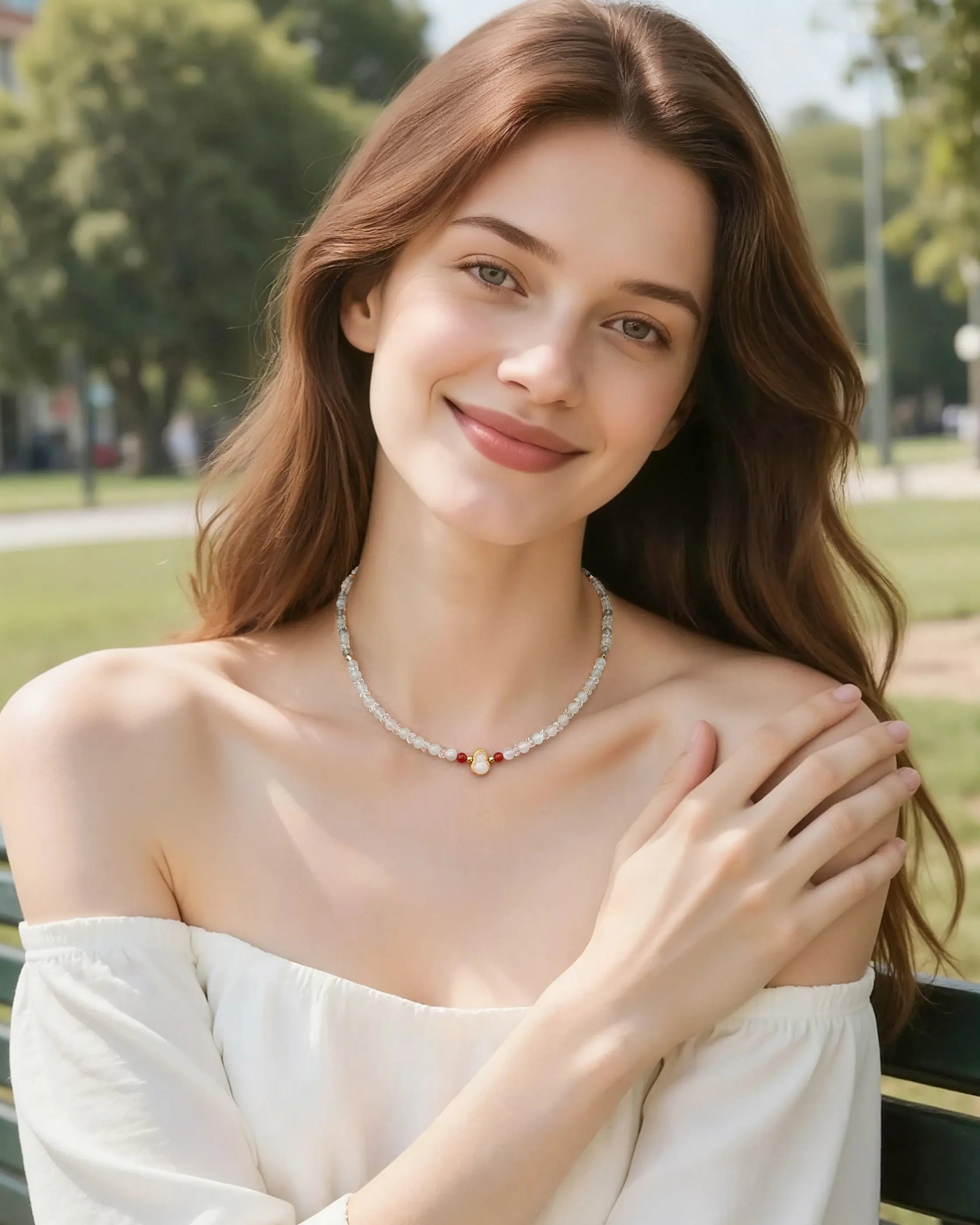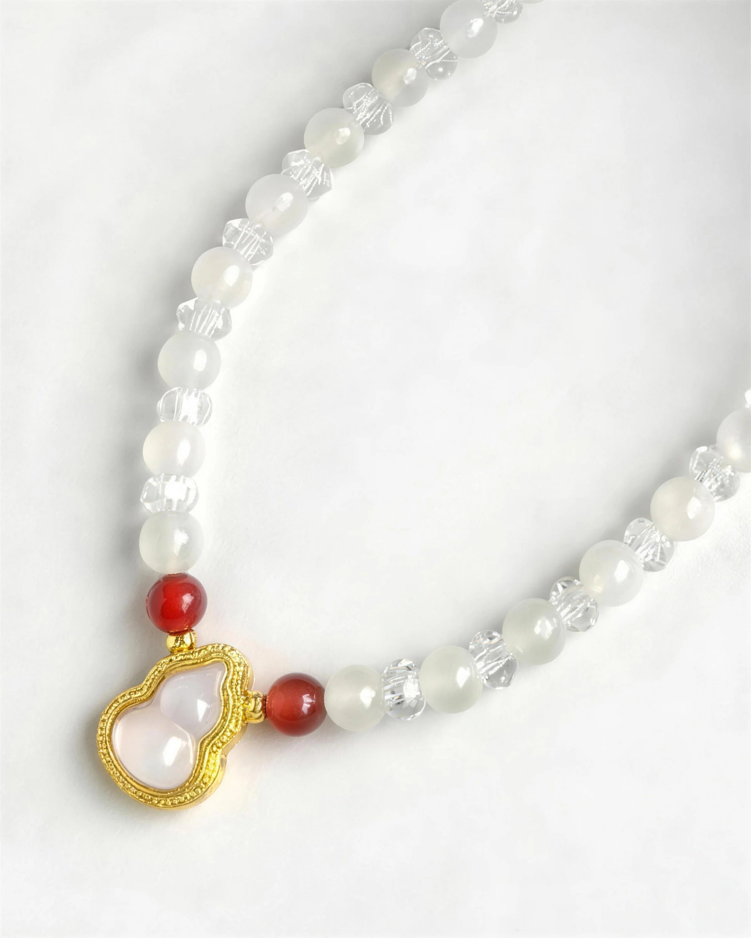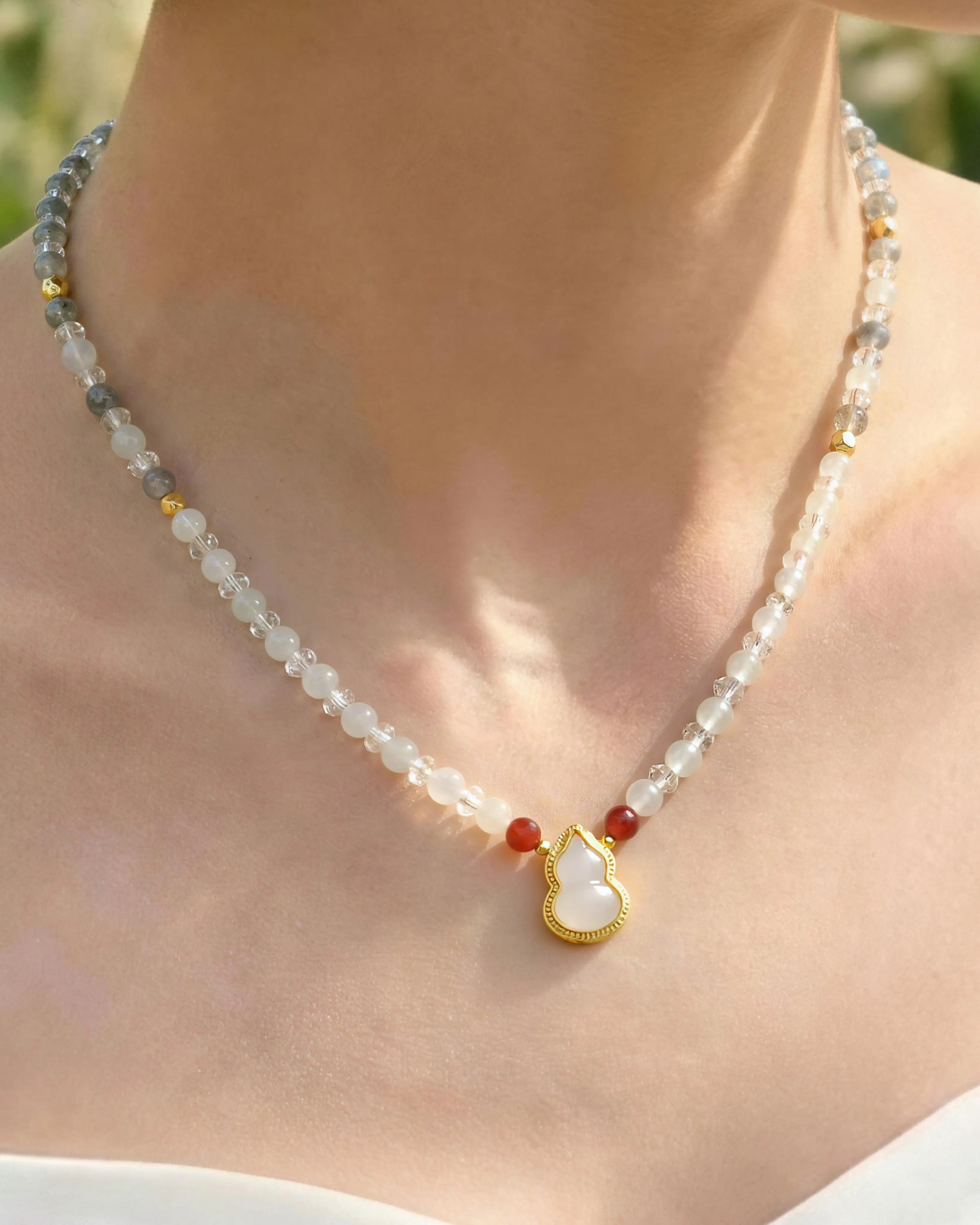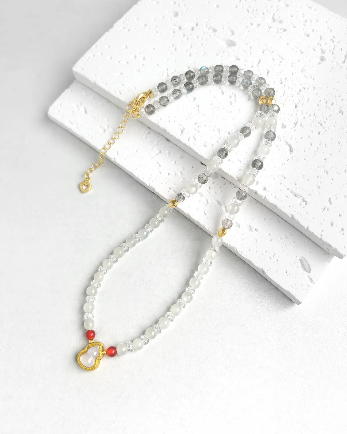 明晰さとマインドフルネスにインスピレーションを得た、ハンドメイドのビーズネックレス。グレームーンストーンとクリアクォーツのビーズを交互にあしらい、ひょうたん型のスペーサーと、中央上部に2つのレッドアゲートビーズをあしらっています。925スターリングシルバーの留め具に、14Kと18Kゴールドメッキのアクセントビーズをあしらっています。