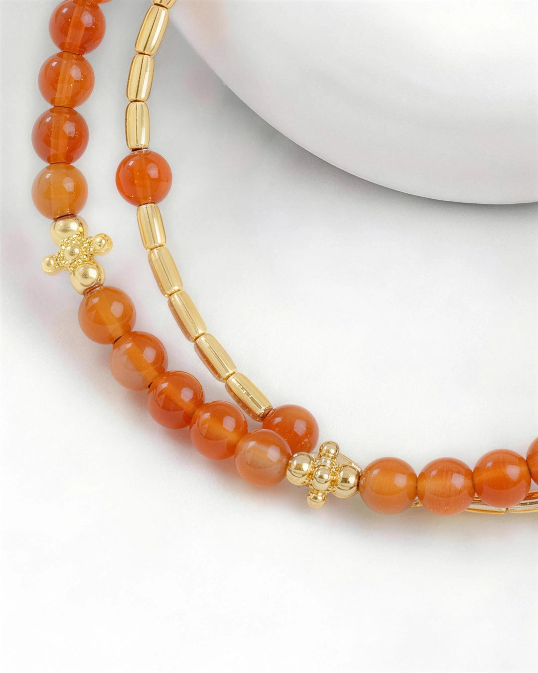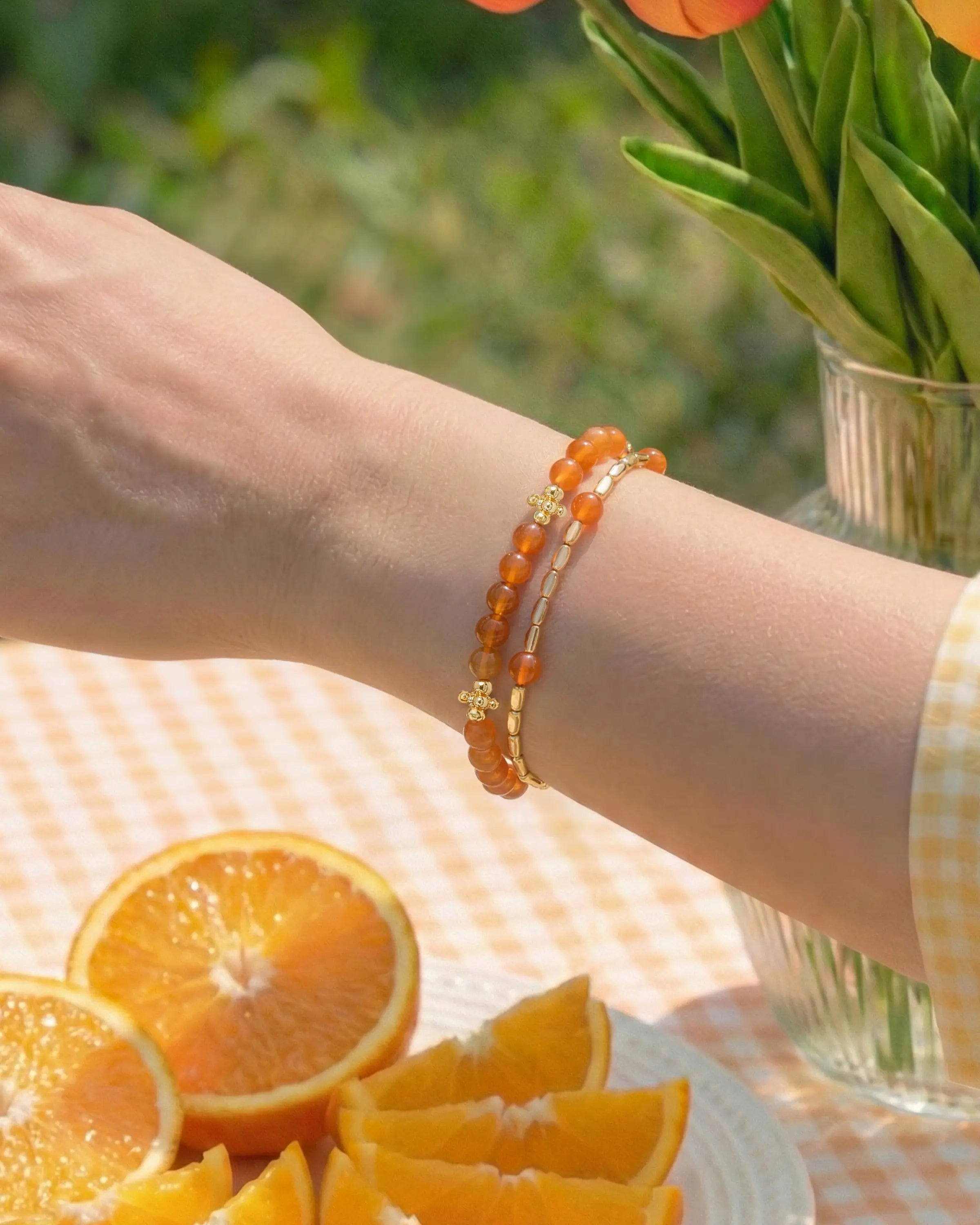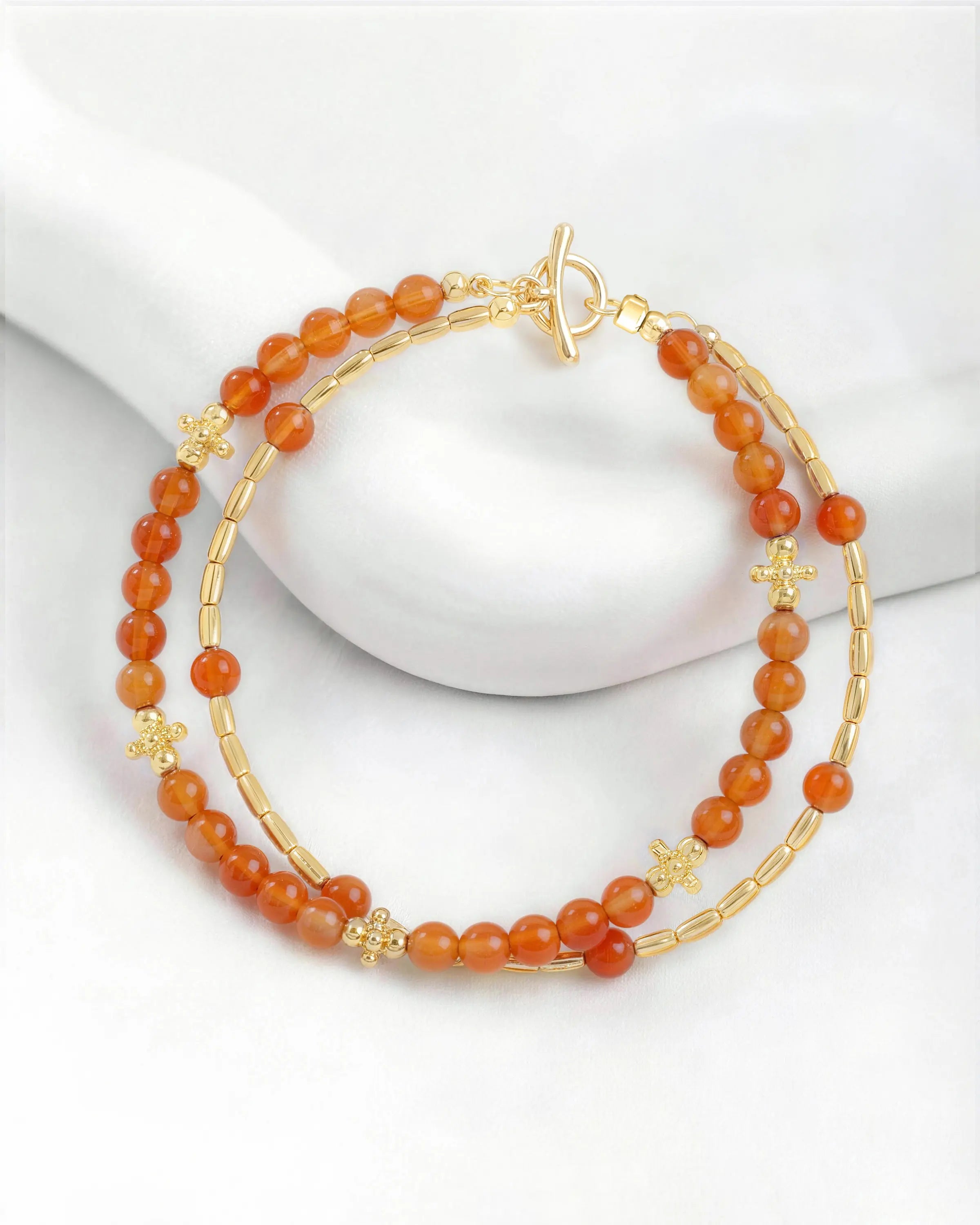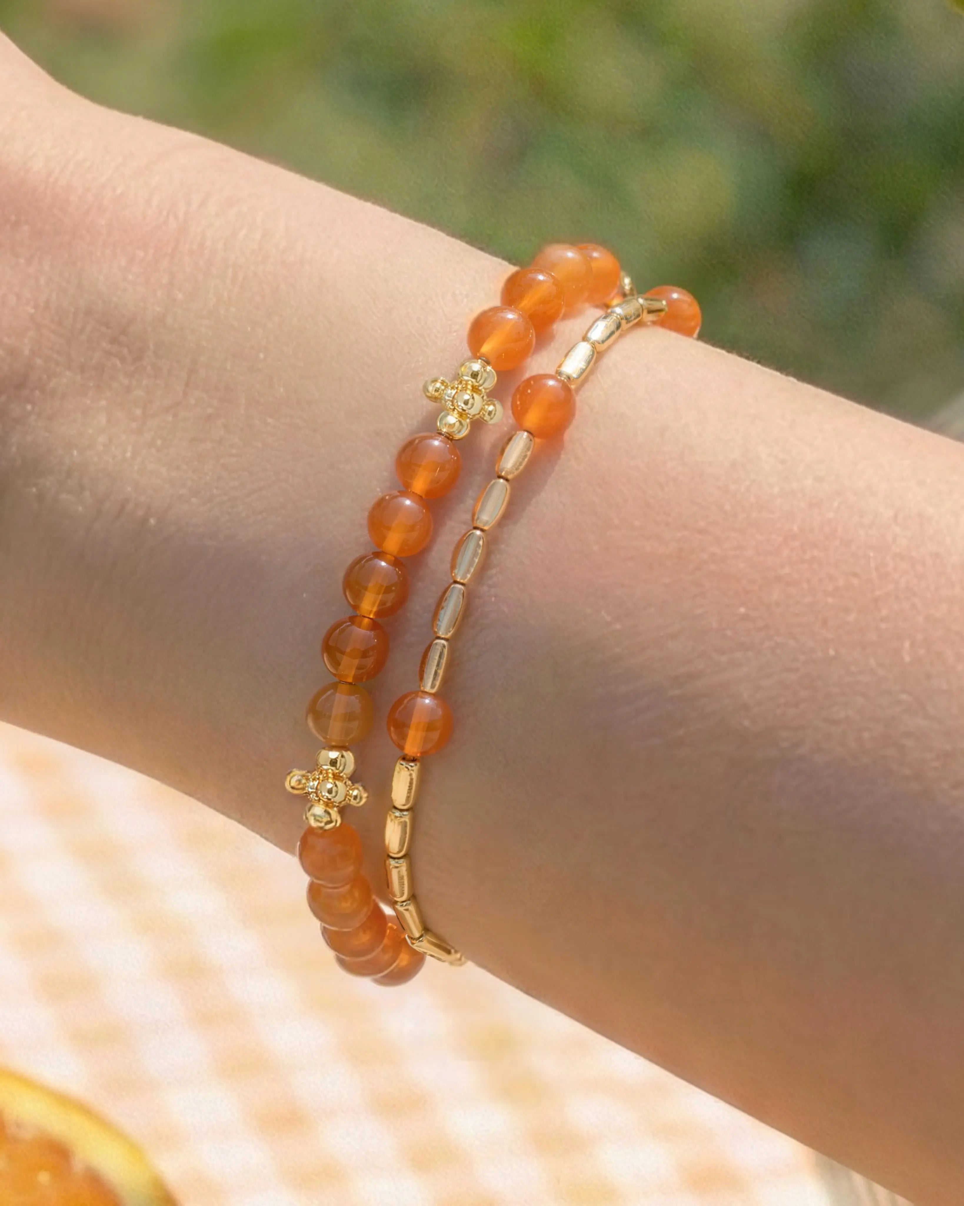 Radiate warmth wherever you go. This duo-chain bracelet interweaves gold beads with 4mm Orange Agate in a sun-drenched sequence, providing a curated layered look with the simplicity of a single piece. While the vibrant hue sparks Creativity, Orange Agate is known for its Warmth and balancing energy. Secured by a signature gold toggle clasp, it's your perfect accessory for golden hour cocktails or a sun-filled morning brunch.