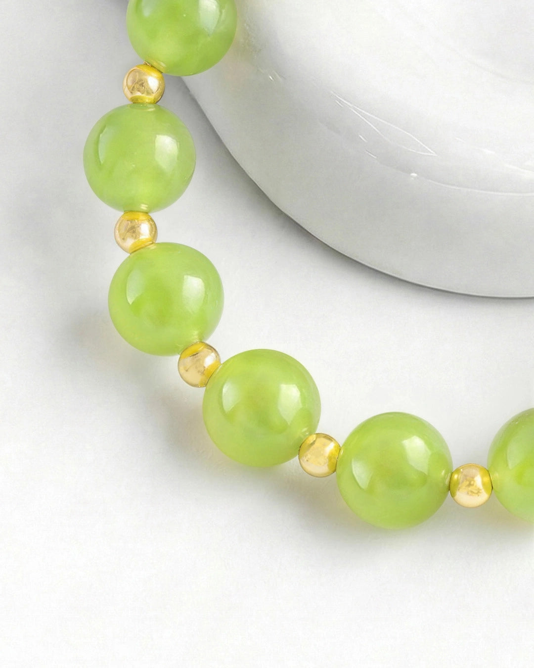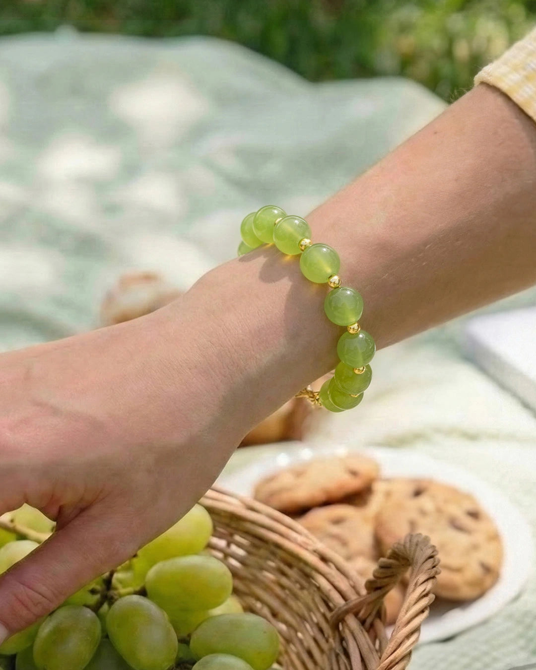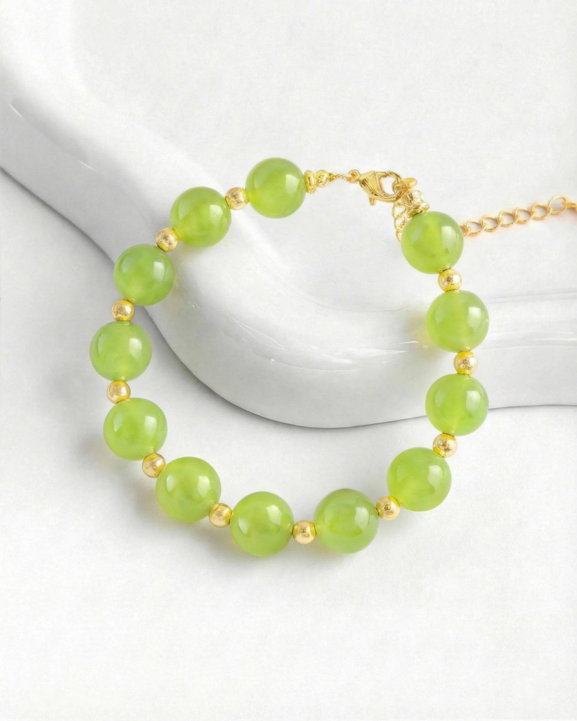A dewy morning for your wrist. With its ethereal, misty green glow, Prehnite looks like peeled grapes or drops of lagoon water frozen in time. This "Stone of Unconditional Love" offers a cooling energy that soothes the heart. Interspersed with rhythmic gold spacers, the translucent beads catch the light softly, creating a personal sanctuary of calm amidst the noise of the day.