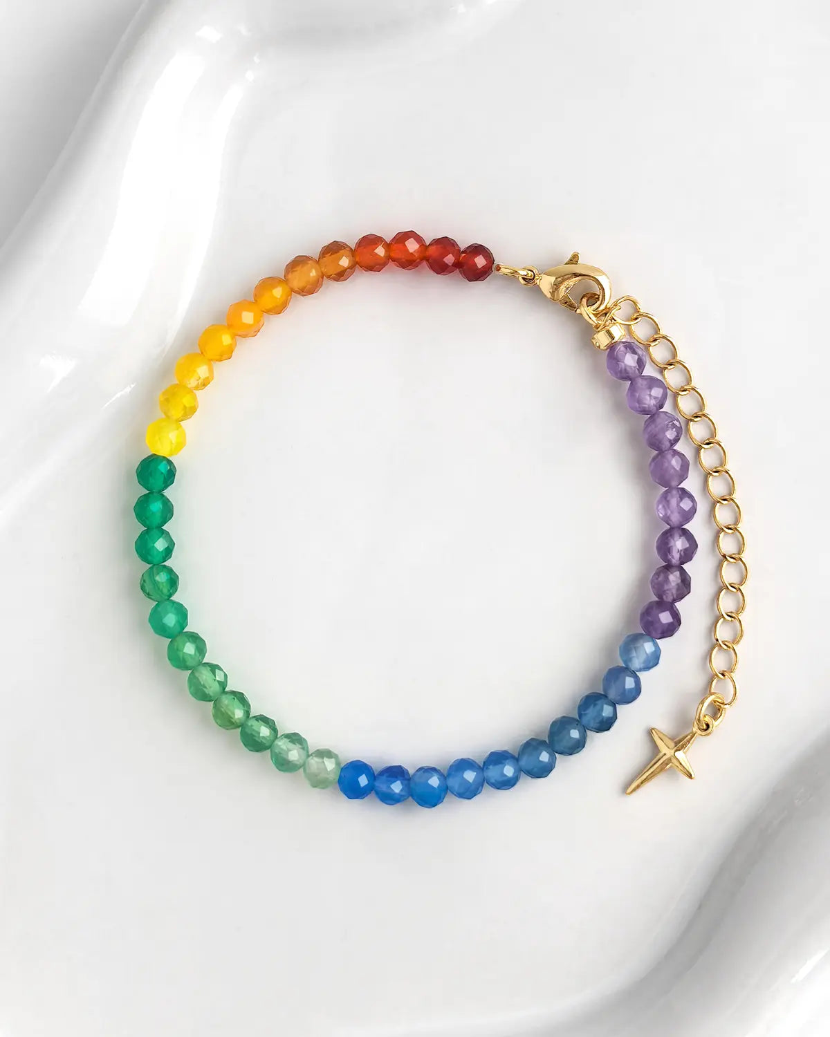鮮やかなレインボーアゲートに繊細なアメジストのアクセントを添えた、生き生きとしたブレスレット。豊かな色彩と静謐さが絶妙なバランスを生み出します。ファセットカットのビーズが光を捉え、色彩の融合が気分を高め、安定したエネルギーへと導きます。重ねづけにも、単体でもお使いいただけるこのブレスレットは、どんな瞬間にも寄り添い、喜びに満ちたパートナーとなるでしょう。