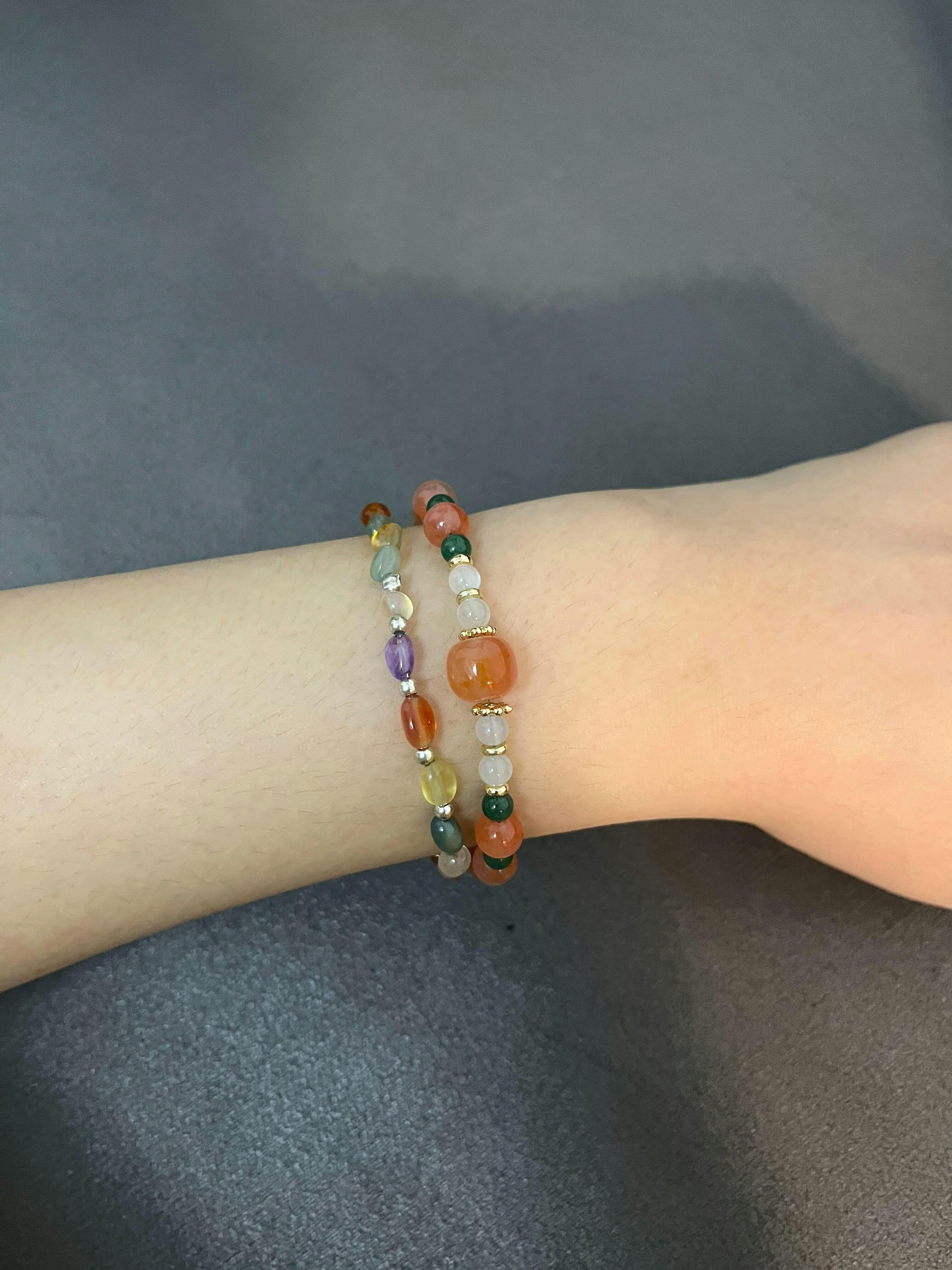 森の朝霧にインスパイアされたこのビーズブレスレットは、4~6mmのレッドアゲートと不規則なフローライトのミックスビーズを組み合わせ、14Kホワイトゴールドメッキのスペーサーとエクステンダーで仕上げました。レッドアゲートは情熱と活力を、フローライトは透明感を与え、愛と喜びを表現します。