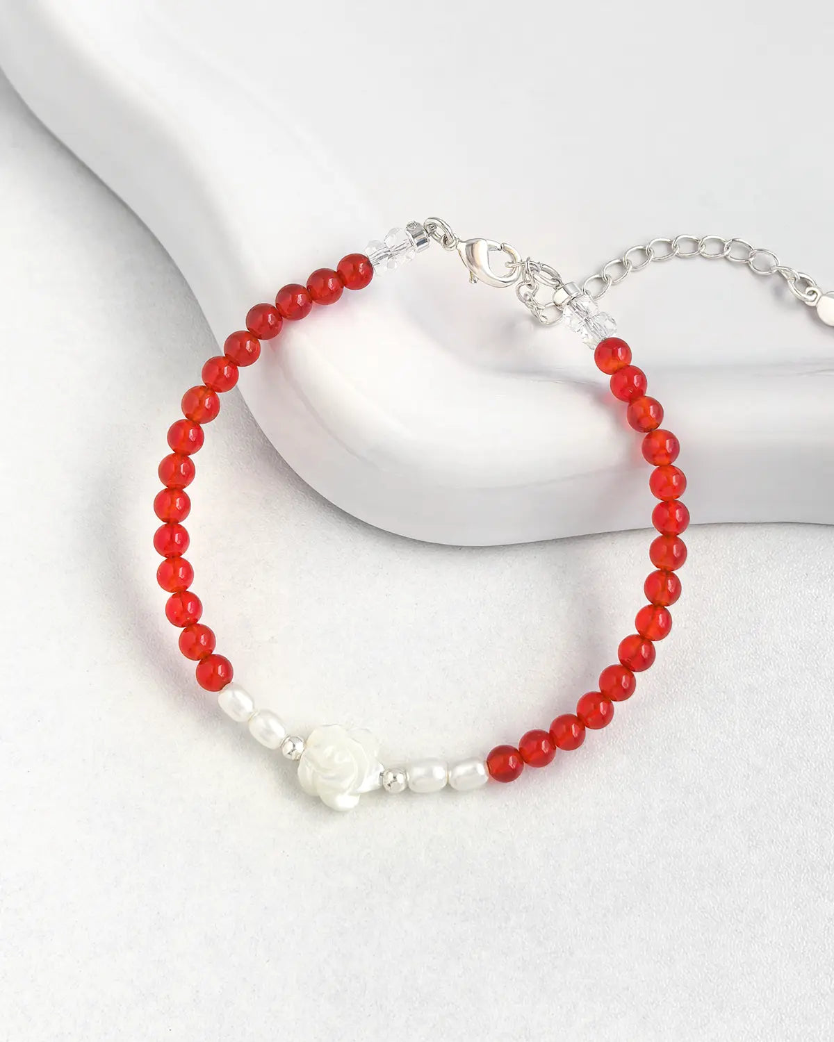 天然真珠をアクセントにした4mmのAAAレッドアゲートビーズを手作業で編み上げたブレスレット。センターピースには10mmの花飾り、輝きを保つ金メッキ銅製スペーサー、そして両端にファセットカットのクリアクォーツビーズをあしらっています。勇気と癒しの力強いエネルギーにインスパイアされたこのブレスレットは、エレガントさと意味を兼ね備え、毎日身につけられる逸品です。