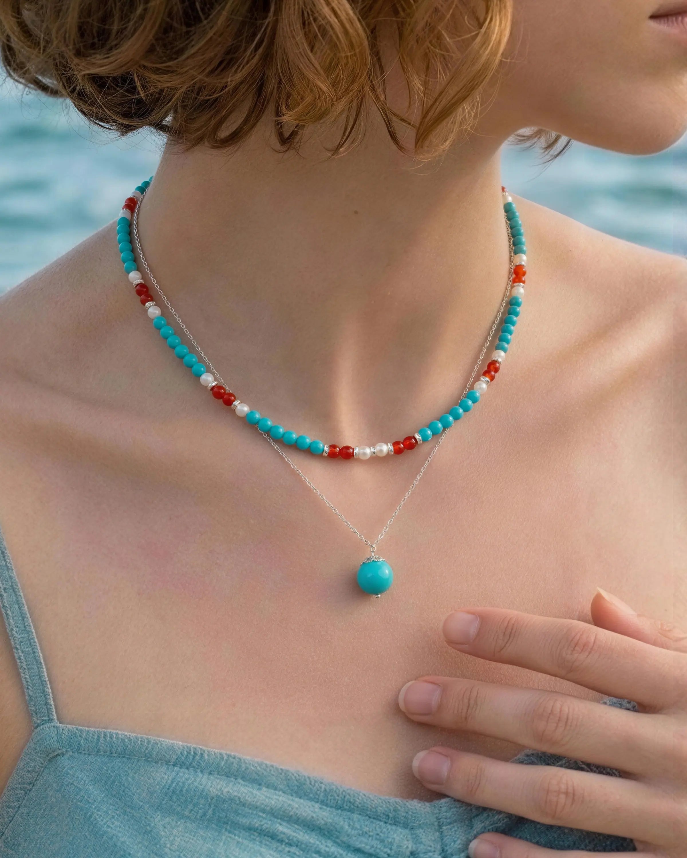 ターコイズとカーネリアンの光に照らされた北極の氷にインスパイアされた、スターリングシルバーのネックレスセット。10mmのターコイズペンダントを、洗練されたシルバー999のチェーンにセット。ターコイズ、レッドアゲート、柔らかなパールのビーズストランドがあしらわれています。12月の誕生石であるターコイズは守護と平和を象徴し、レッドアゲートは勇気と地に足のついたエネルギーを与えてくれます。重ねづけにも、単体でもお使いいただけます。