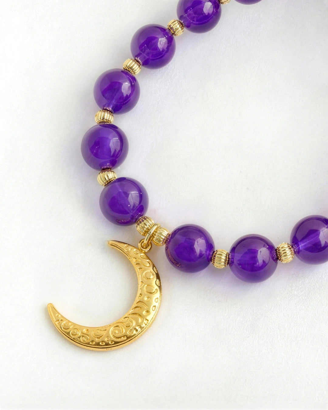 A fragment of the midnight sky resting against your skin. The deep, royal violet of these 10mm Amethyst beads invites a sense of profound mystery and calm. Paired with the textured crescent moon pendant—a timeless symbol of cycles and renewal—this necklace becomes your evening companion, perfect for a night of quiet introspection or adding a touch of celestial magic to a gallery opening.