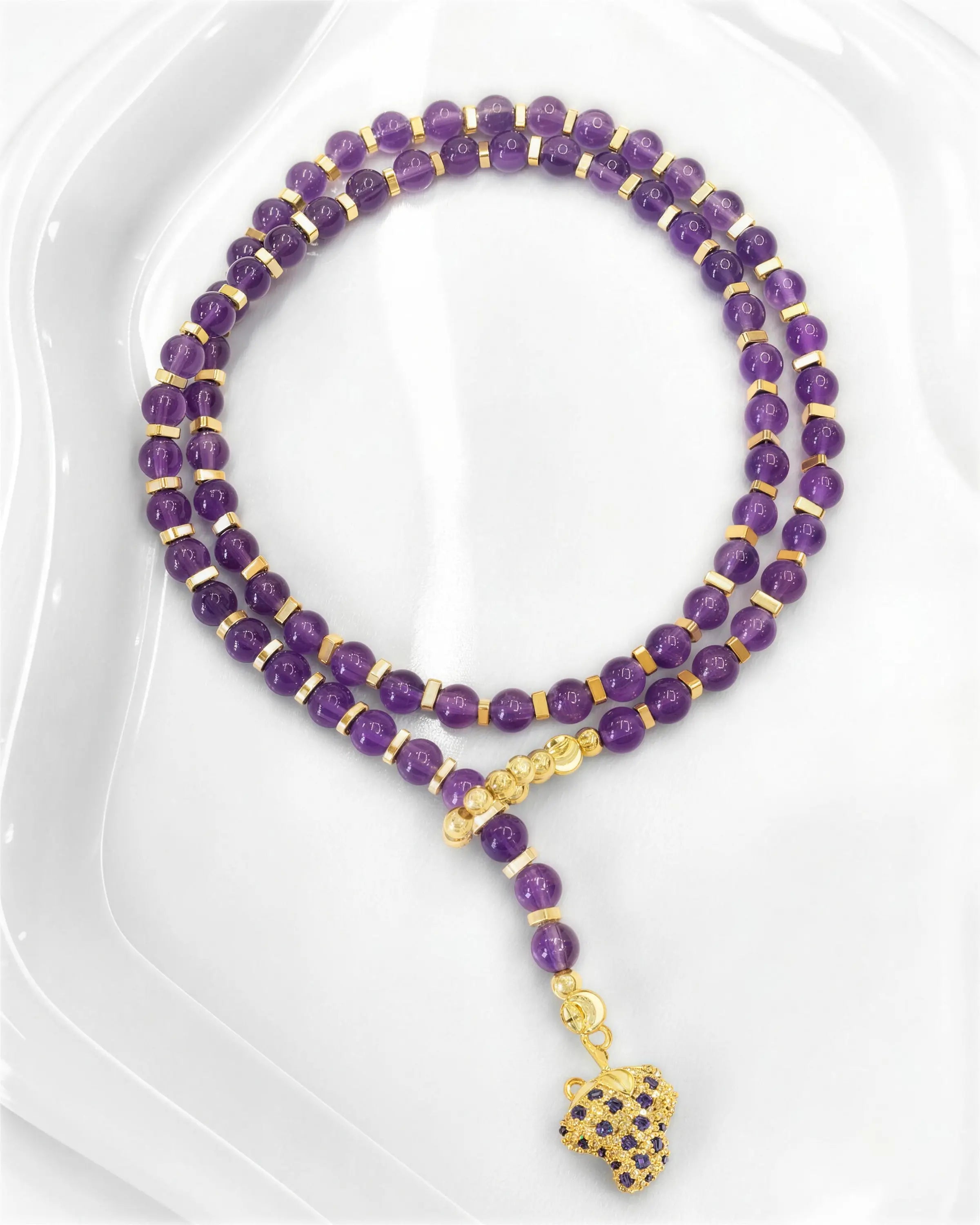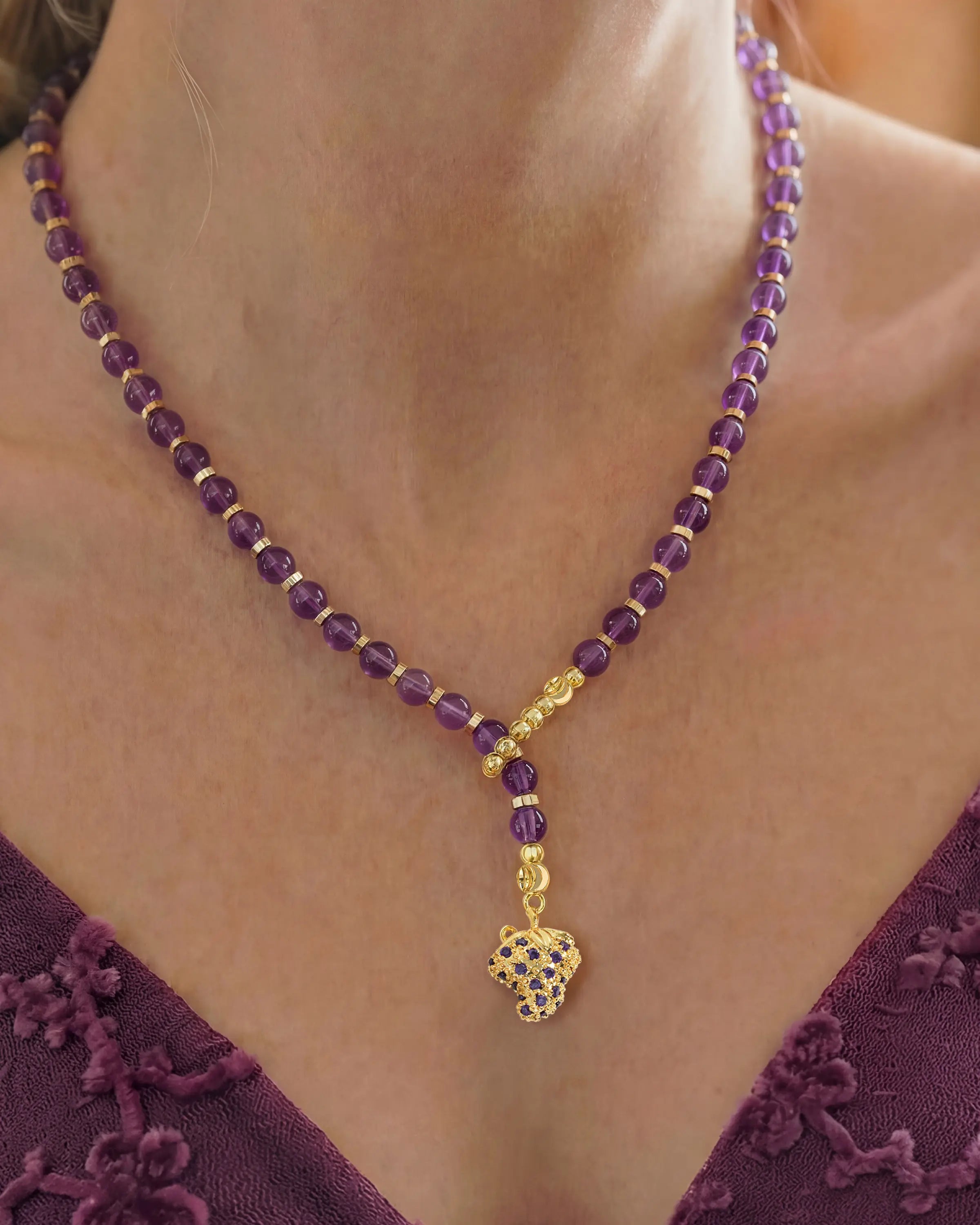 The amethyst beads are vibrant and smooth, while the gold grape pendant adds elegance. The birthstone beads make it unique and personal. It fits beautifully and feels luxurious. A perfect gift for someone special or a treat for yourself.