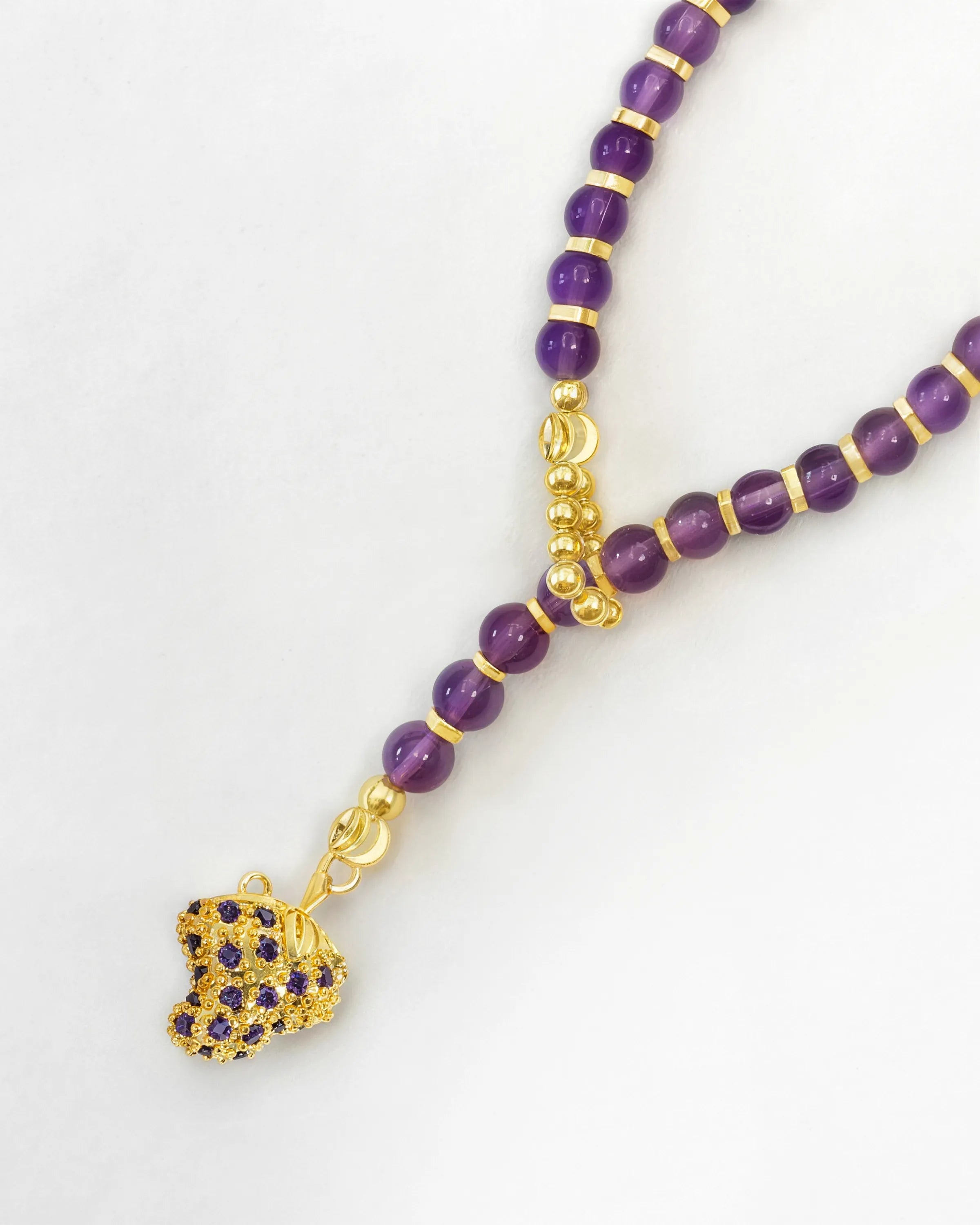 The elongated Y-silhouette creates a graceful line that moves with you. Smooth amethyst and warm gold spacers rest gently against the skin, offering a steady, comforting weight. A grounded companion that brings a sense of calm to your morning moments.