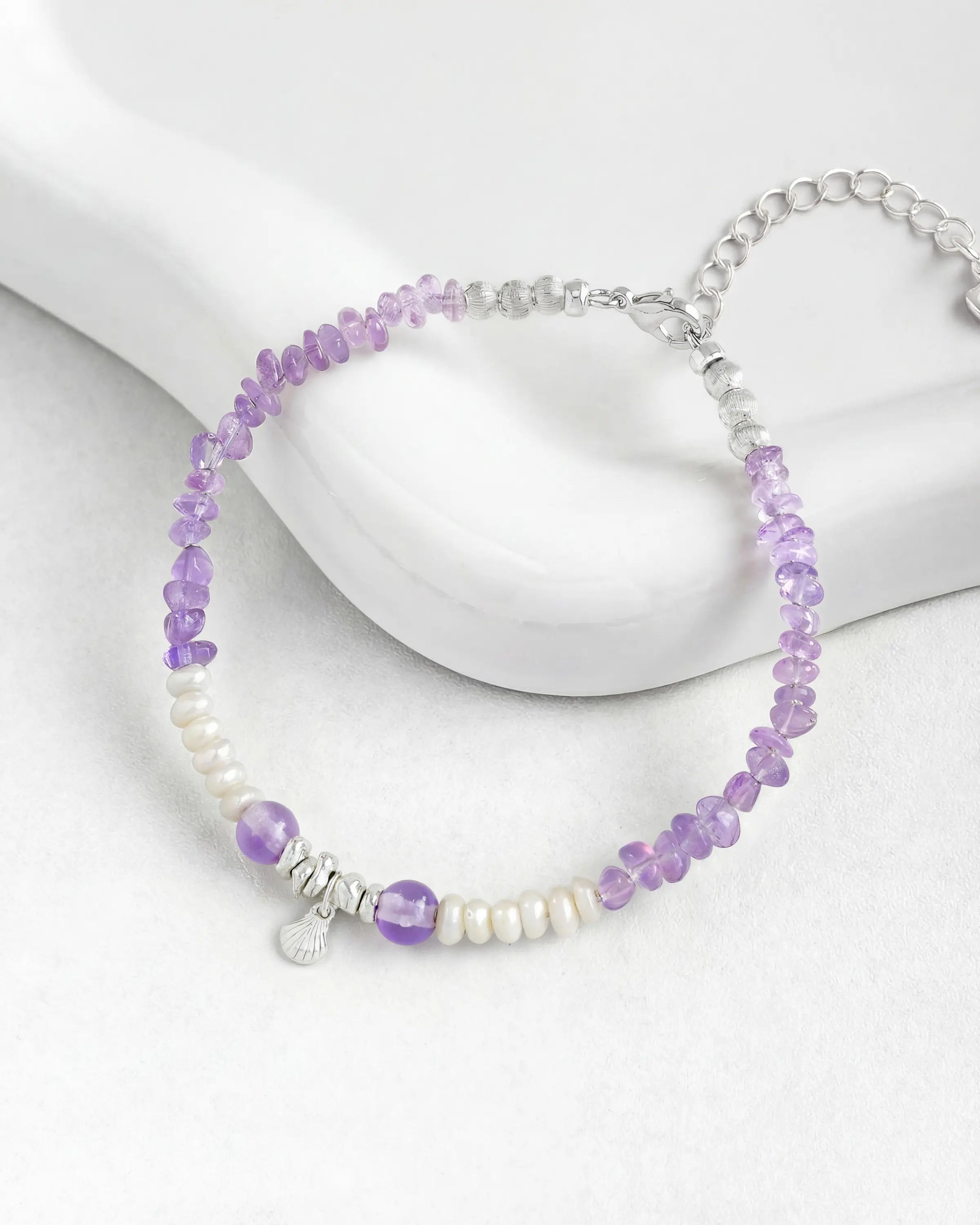 A rhythmic dance of sea and spirit. This bracelet layers the organic texture of natural Irregular Amethyst with the soft glow of Baroque pearls, anchored by a delicate S925 silver shell charm. The cool, silver-toned accents provide a refreshing contrast to the violet hues, creating a piece that feels like a dream found along the shoreline. It acts as a gentle talisman for your inner self, inviting you to quiet the noise and listen to the steady whispers of your intuition.