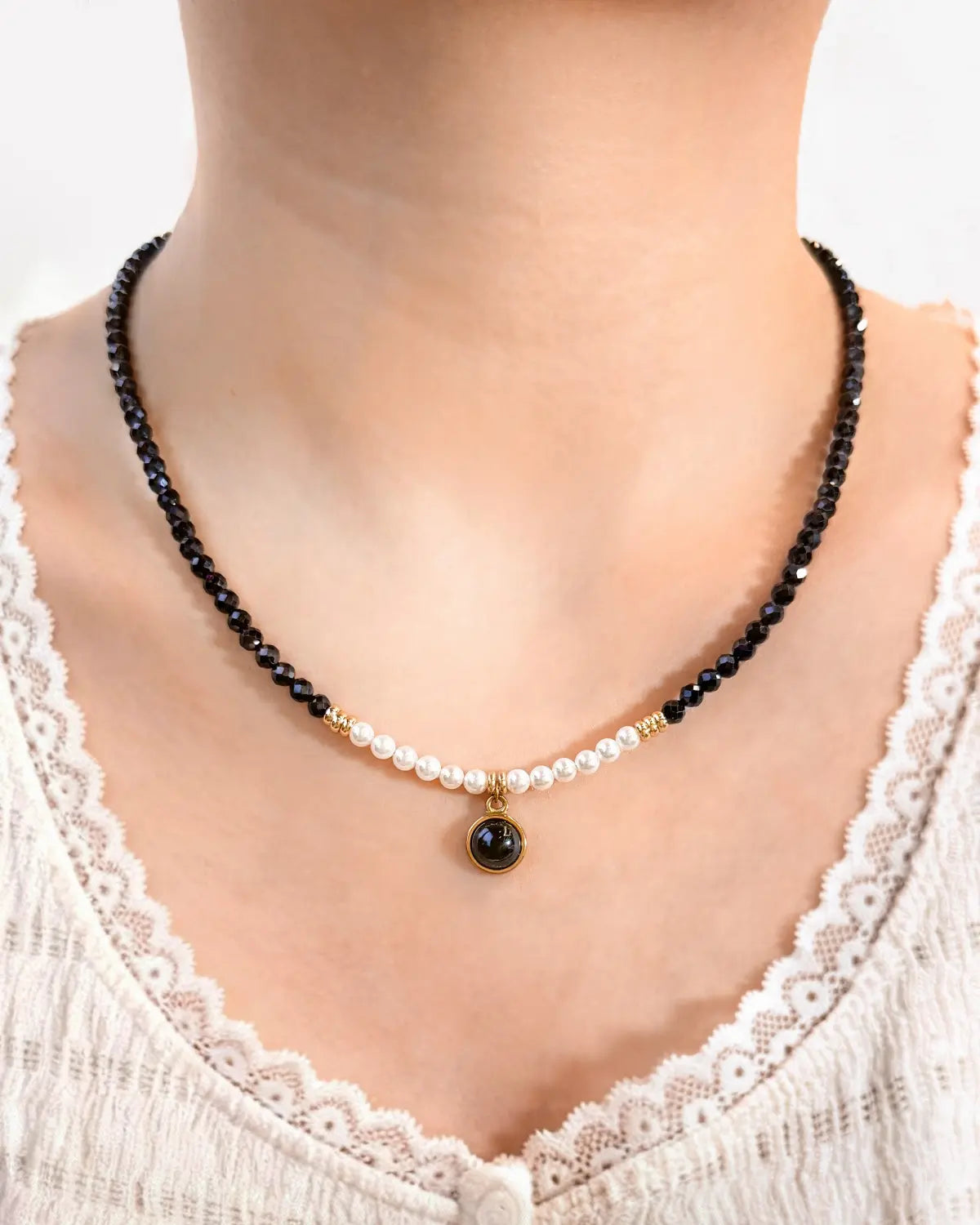 Inspired by a nighttime lantern pier, this necklace features faceted black tourmaline beads and freshwater pearls, finished with a single black onyx pendant at the center.