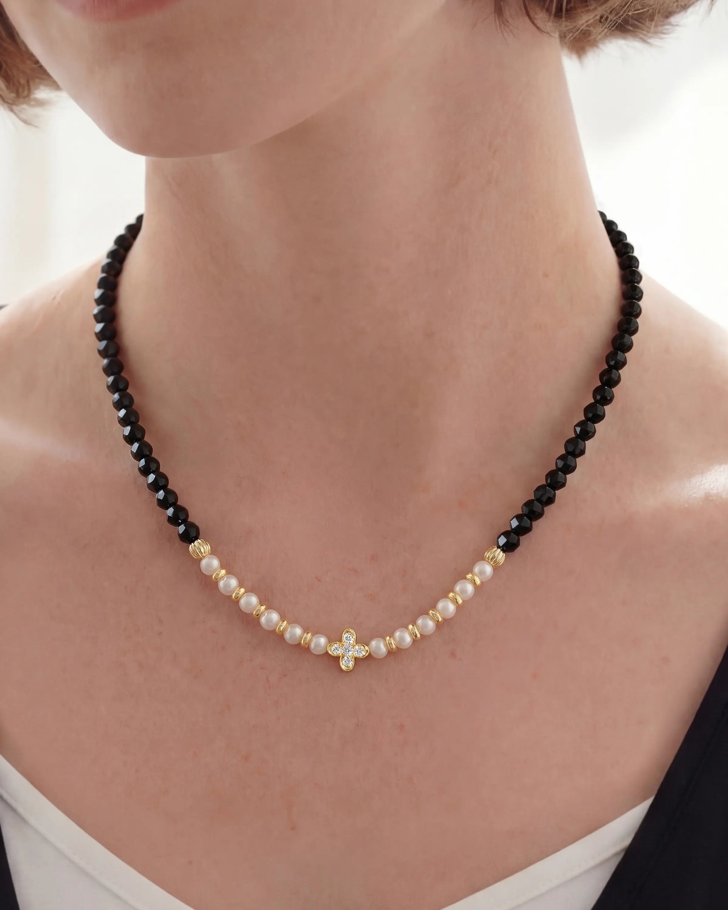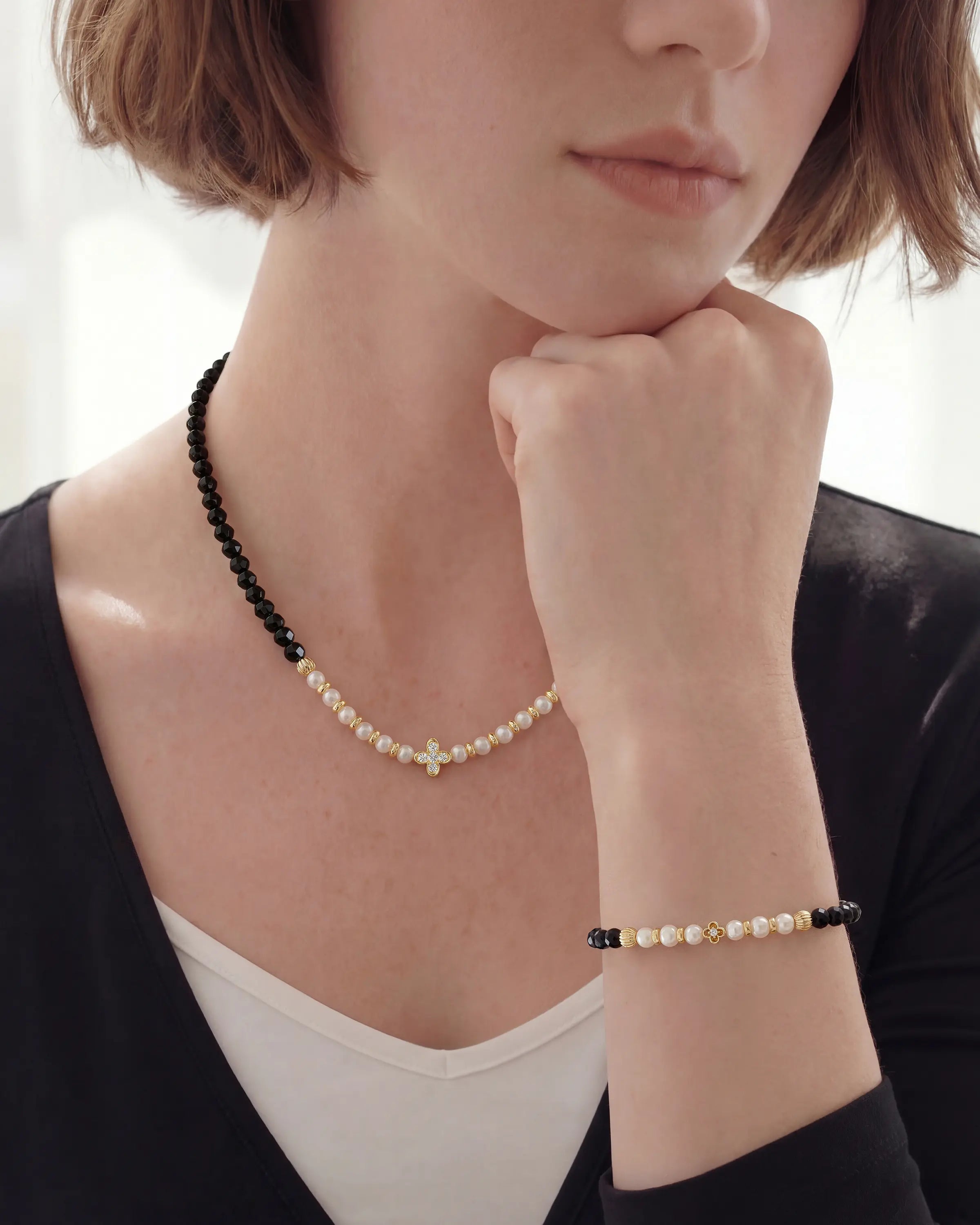 A striking balance of light and dark. This elegant set features a matching necklace and bracelet crafted from faceted black tourmaline. Both pieces beautifully highlight a row of luminous pearls and a delicate gold clover center. Worn together, they act as a quiet shield for your mind. This powerful duo helps you stay grounded, bringing calm and a touch of good fortune to your day.