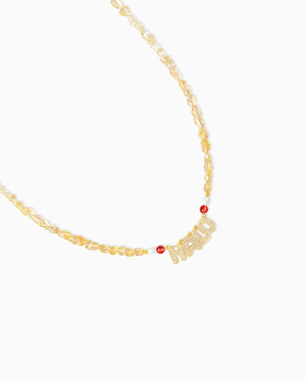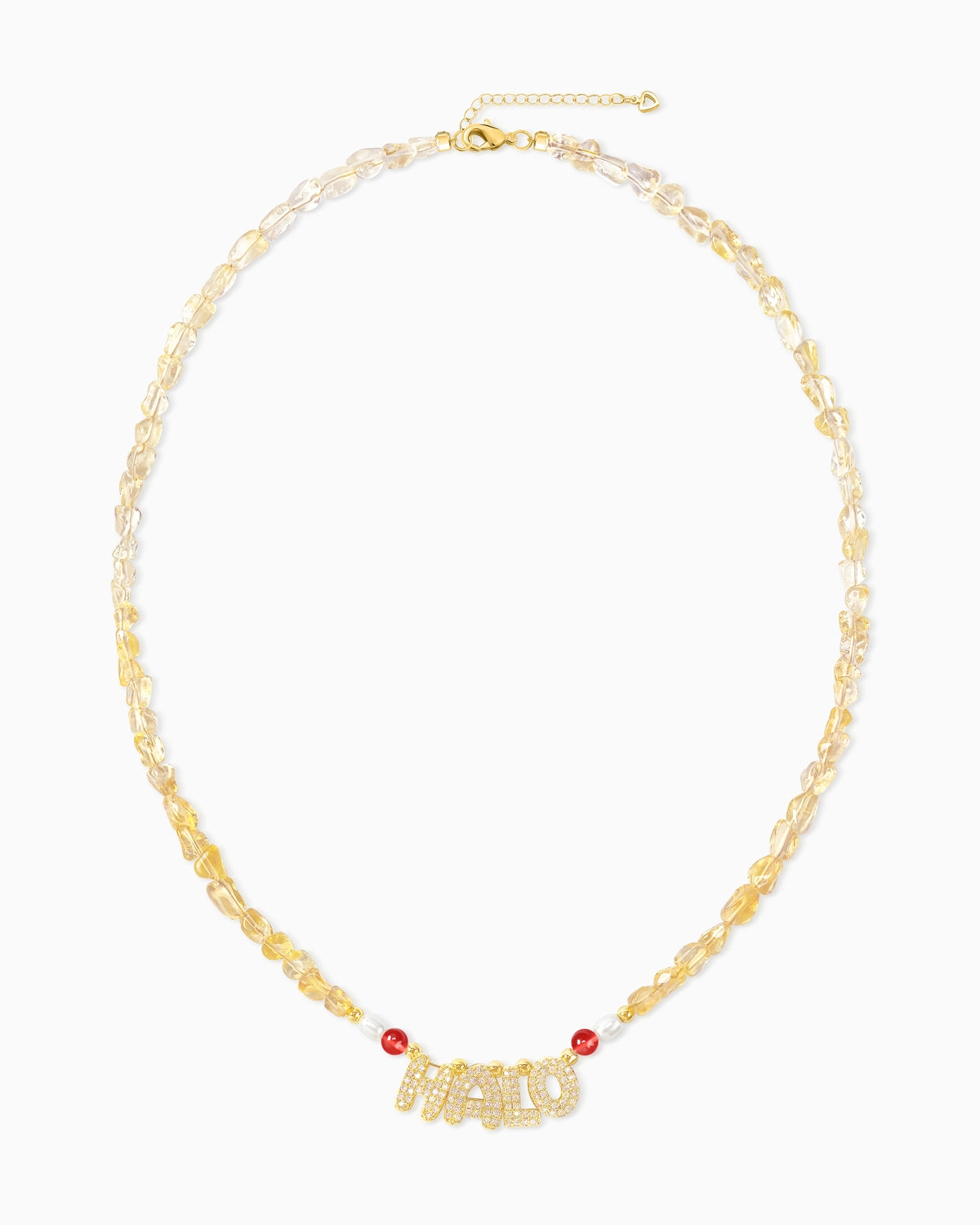Inspired by sunlight breaking through clouds, this beaded necklace features natural citrine with red agate and pearl accents. A HALO letter charm adds a modern touch, finished with sterling silver plated in 18K gold and 14K gold-plated copper. Designed to channel energy, courage, and warmth.
