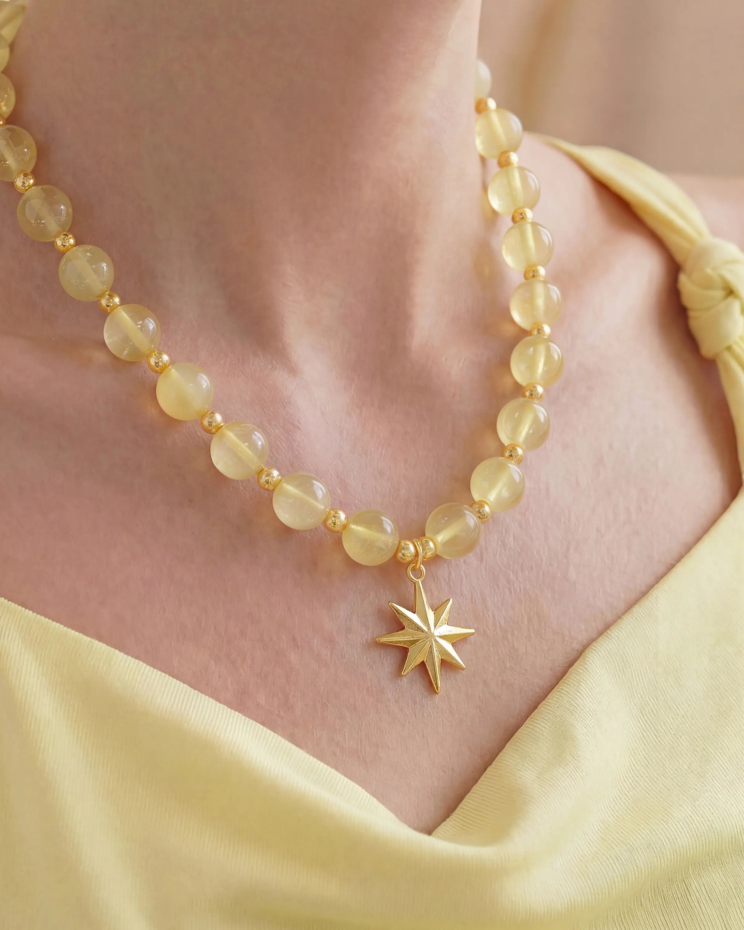 These 10mm citrine beads have a substantial feel and a soft, pale glow. Long associated with sunny optimism, this matched design is detailed with simple gold spacers and anchored by a gleaming star charm. It serves as a gentle reminder to stay open to the light and joy you carry with you every day.