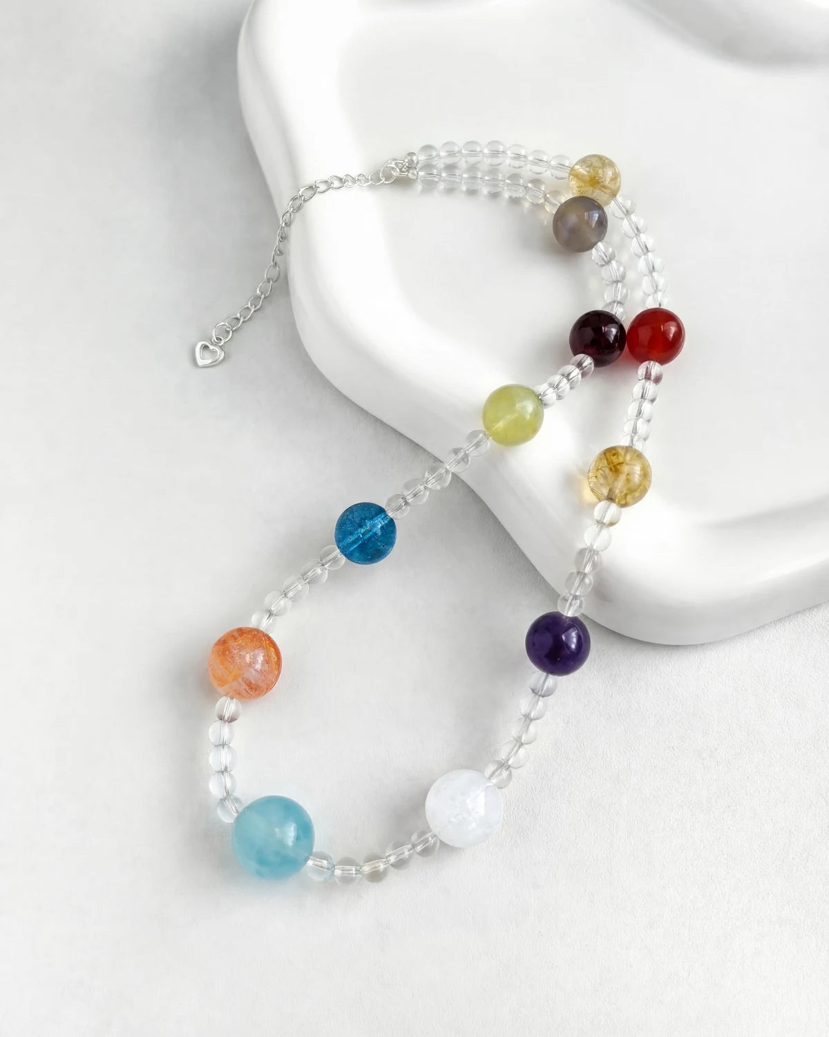 This handcrafted multi-gem beaded necklace features 4mm clear quartz and large beads of red agate, gray agate, garnet, citrine, aquamarine, and amethyst, accented with 14K gold-plated copper fittings that keep their shine and resist tarnishing.