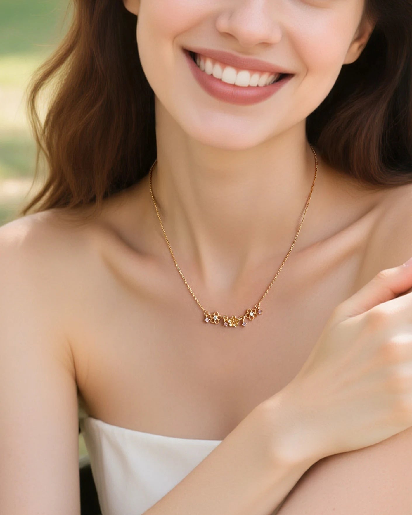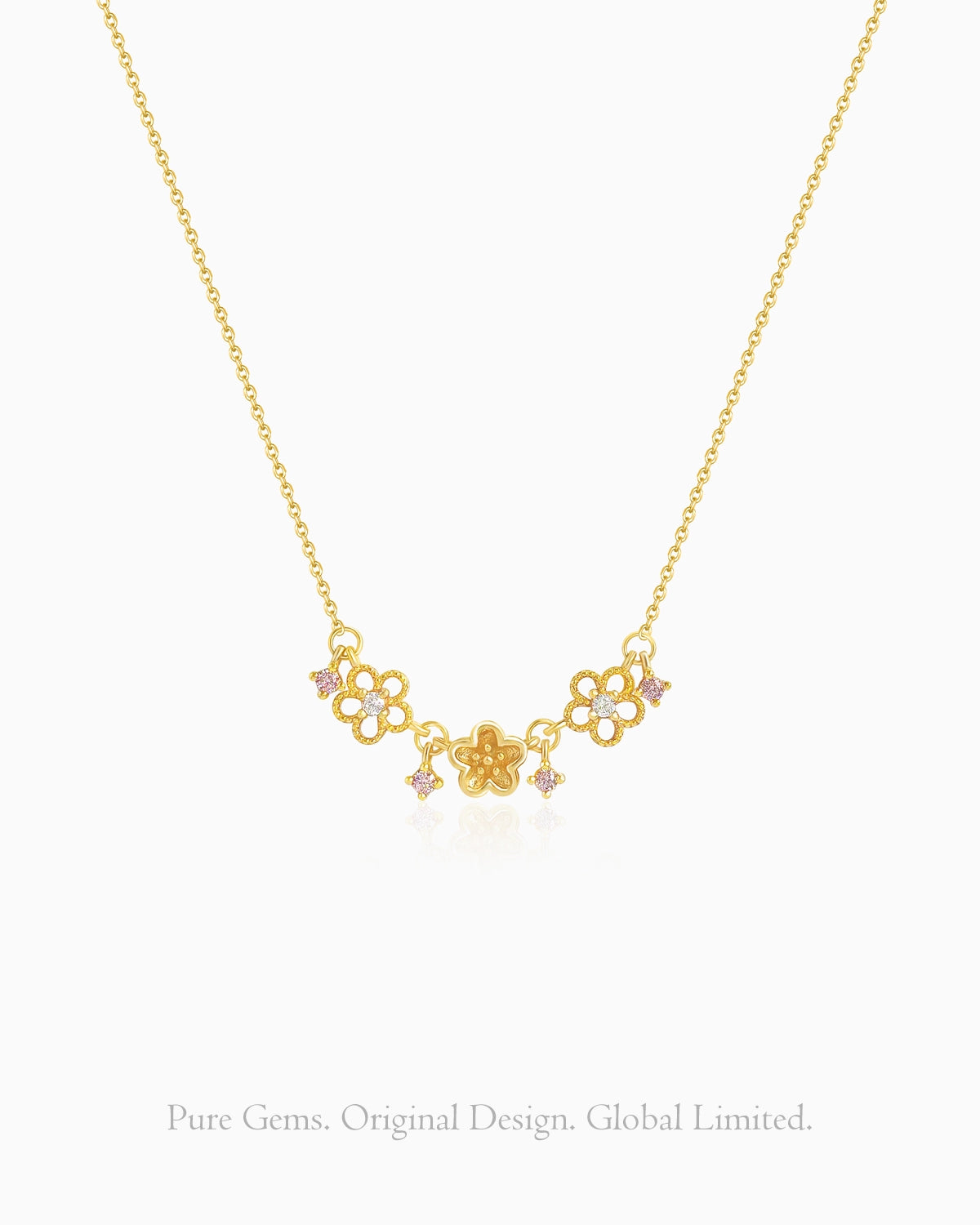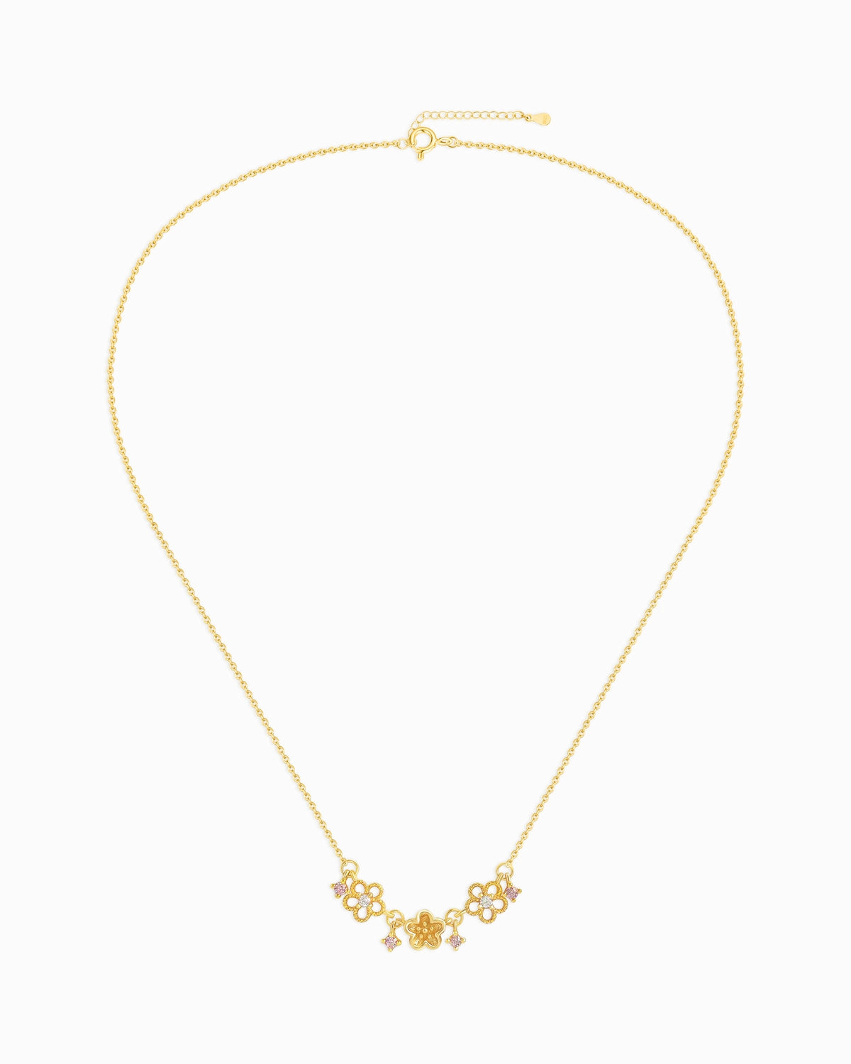 This necklace presents a fixed trio of floral motifs—one solid bloom flanked by two openwork blossoms—crafted in 14K gold-plated sterling silver.