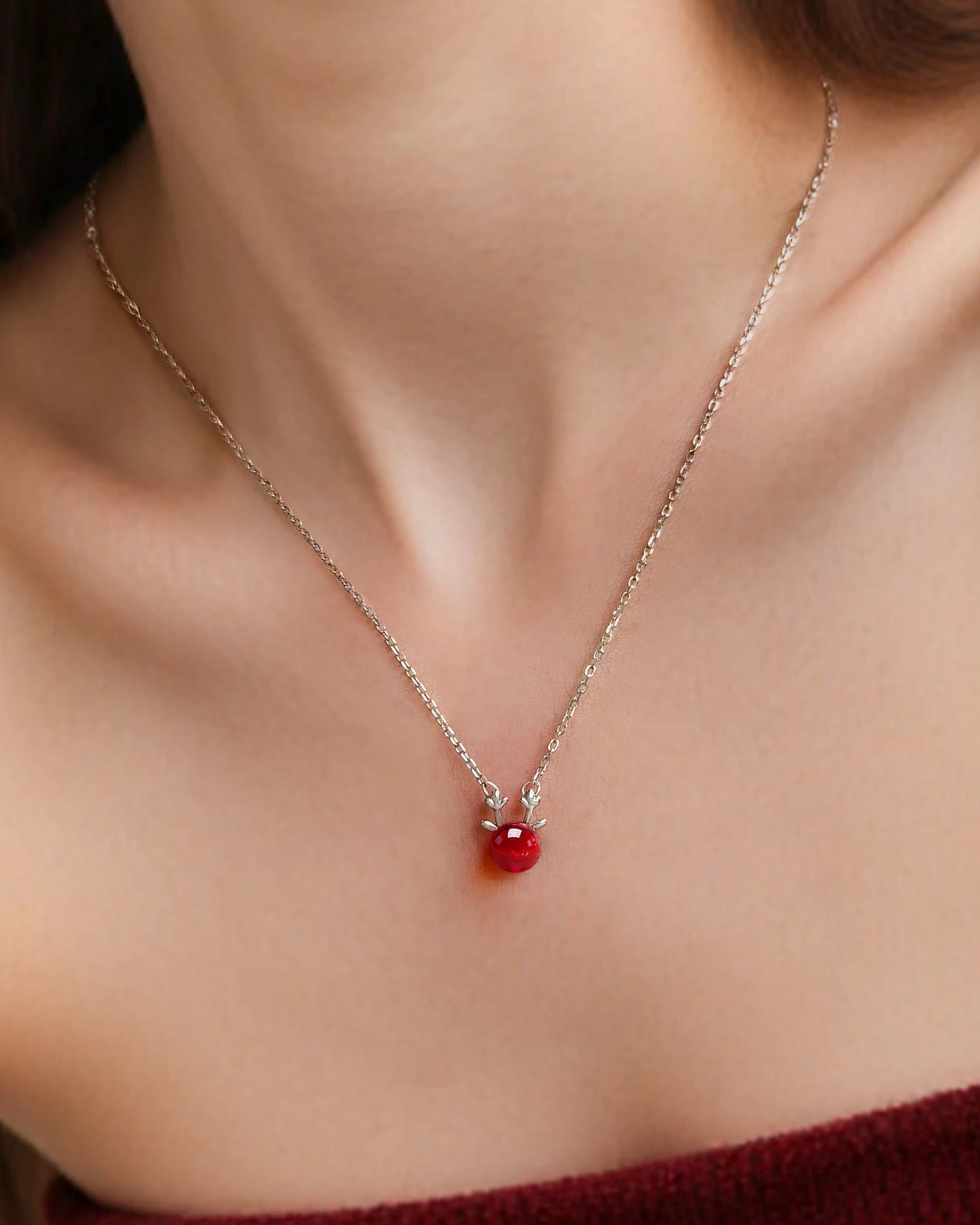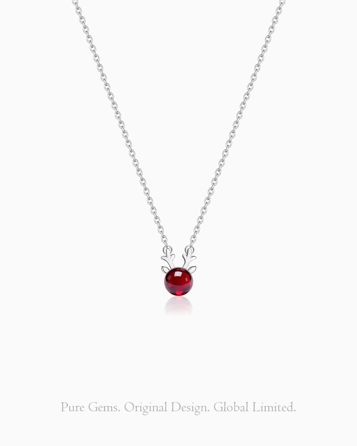 A single garnet bead pendant hangs delicately on a 14K gold-plated sterling silver chain, accented with tiny antler-inspired details. This charming piece evokes courage and festive cheer, perfect as a holiday gift or a subtle, cheerful addition to everyday style.