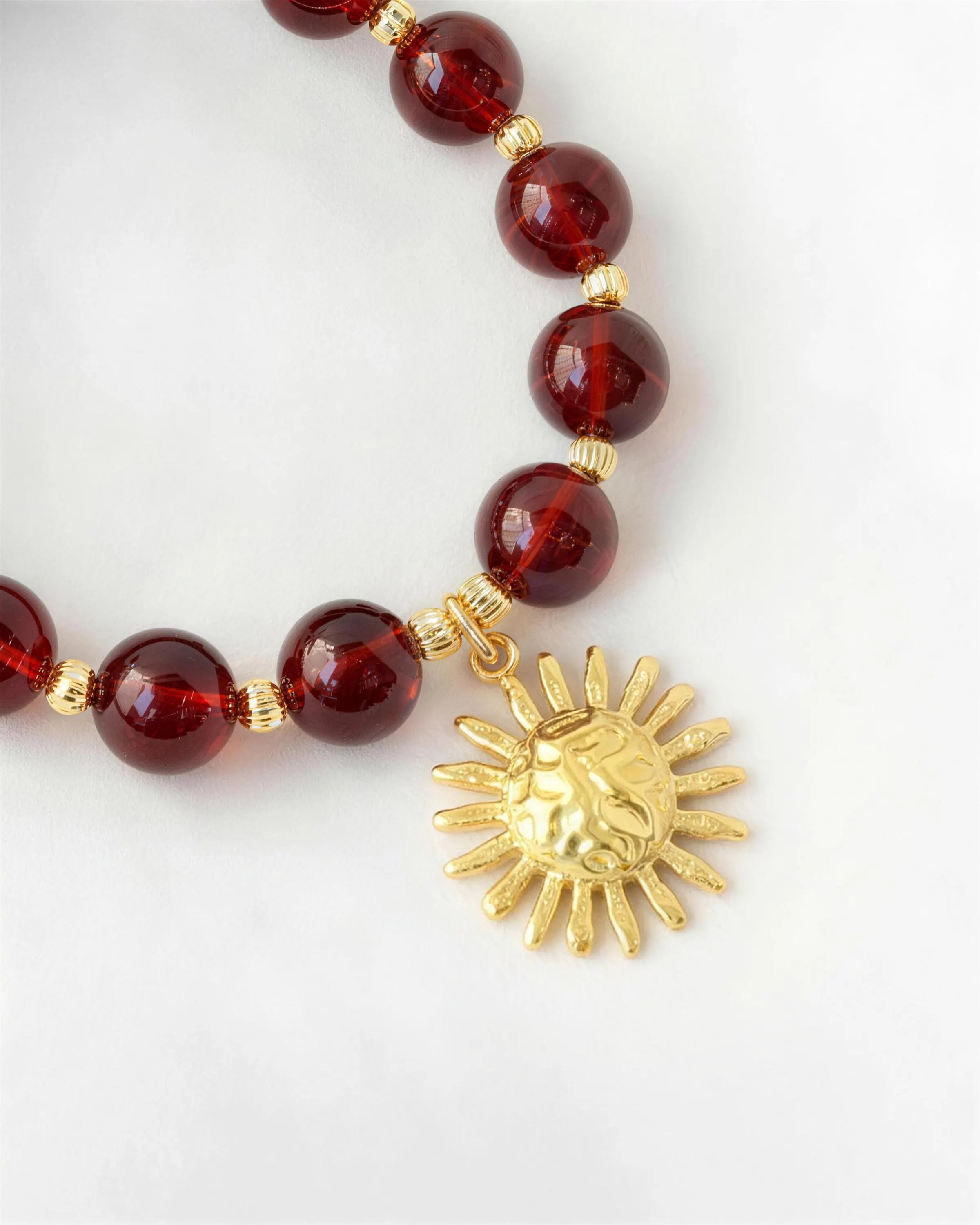 A slow-burning ember for your spirit. Unlike the bright flash of summer, these 10mm Garnet beads hold a deep, wine-red intensity that speaks of grounded power and resilience. Paired with the radiant gold sun—a promise of returning light—this necklace serves as a talisman of inner strength, offering a steady warmth whether you are navigating a challenging winter evening or simply standing firm in your own truth.