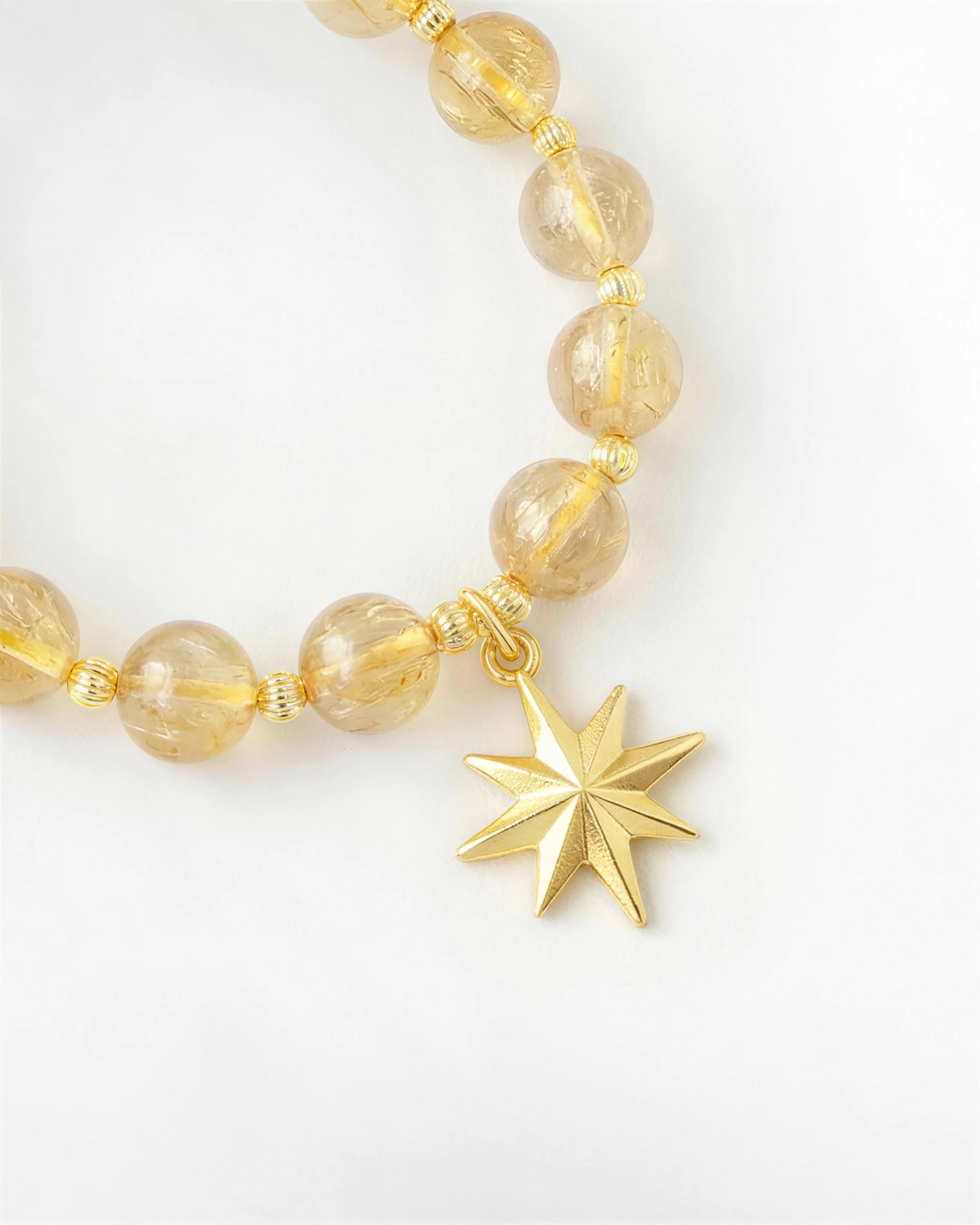 A spark of joy. These 10mm golden rutilated quartz beads feature unique golden threads that naturally catch the light. Strung with gold spacer beads and centered with a classic star charm, it adds a textured, premium weight to your look. It's a wearable reminder to keep your spirit bright.