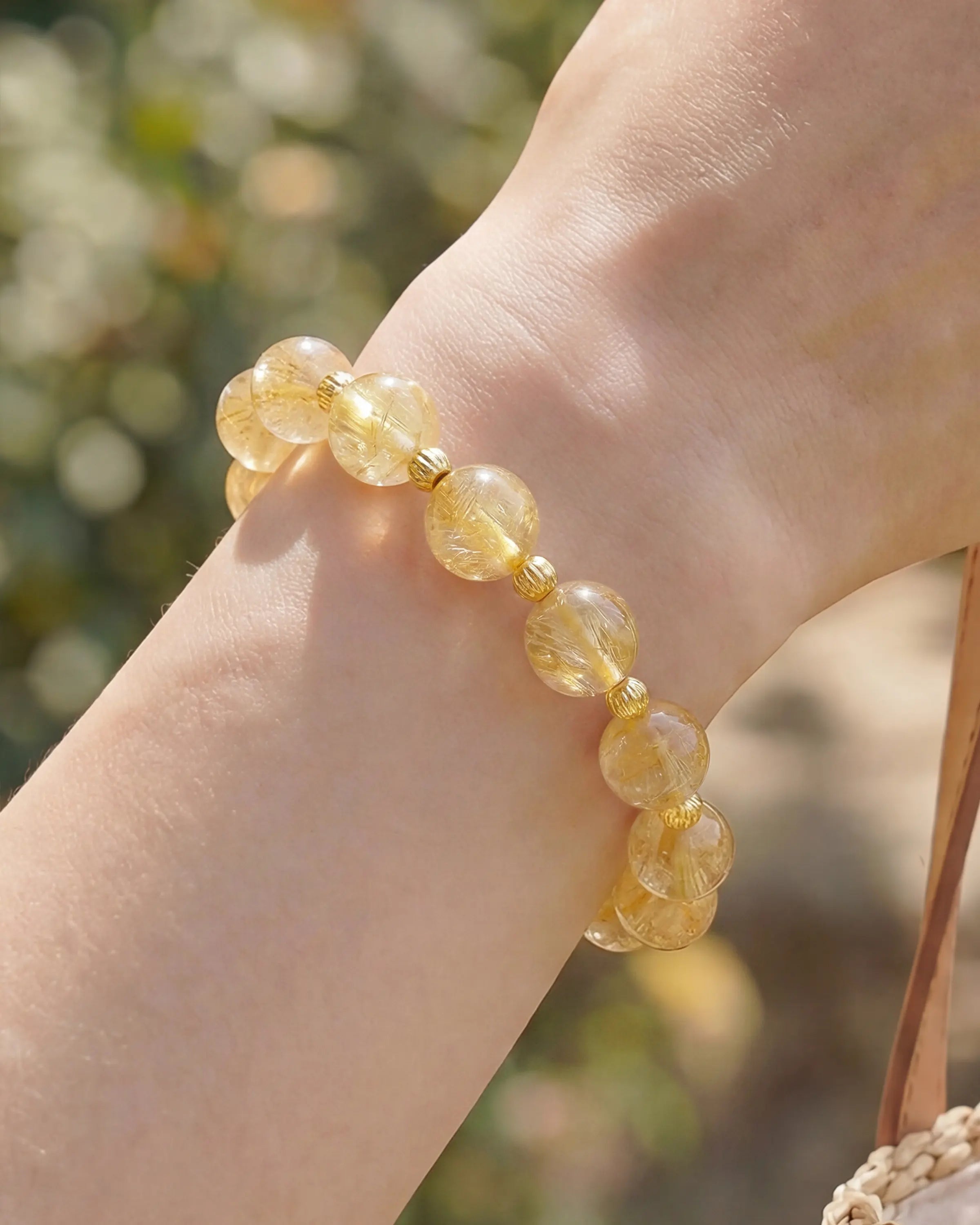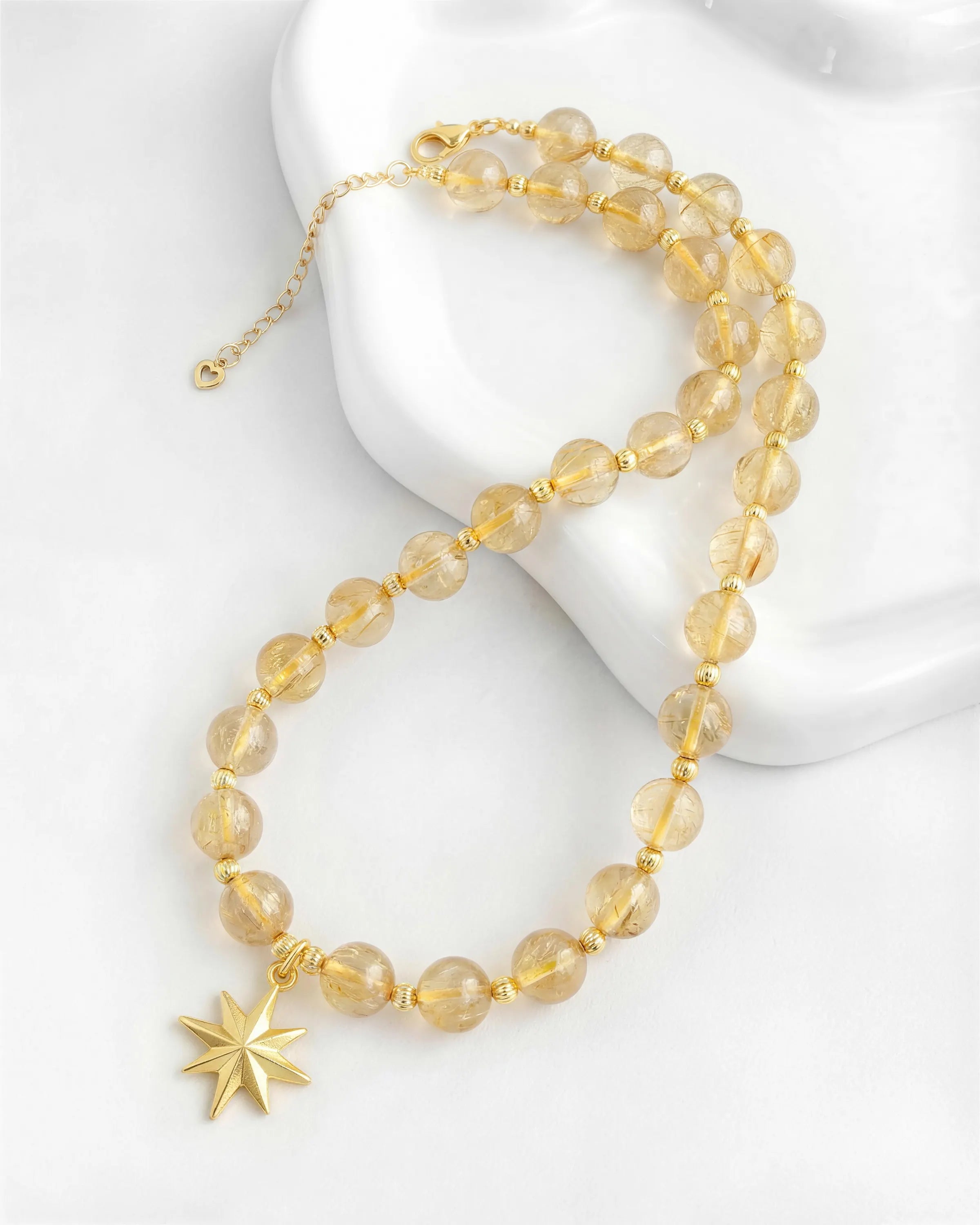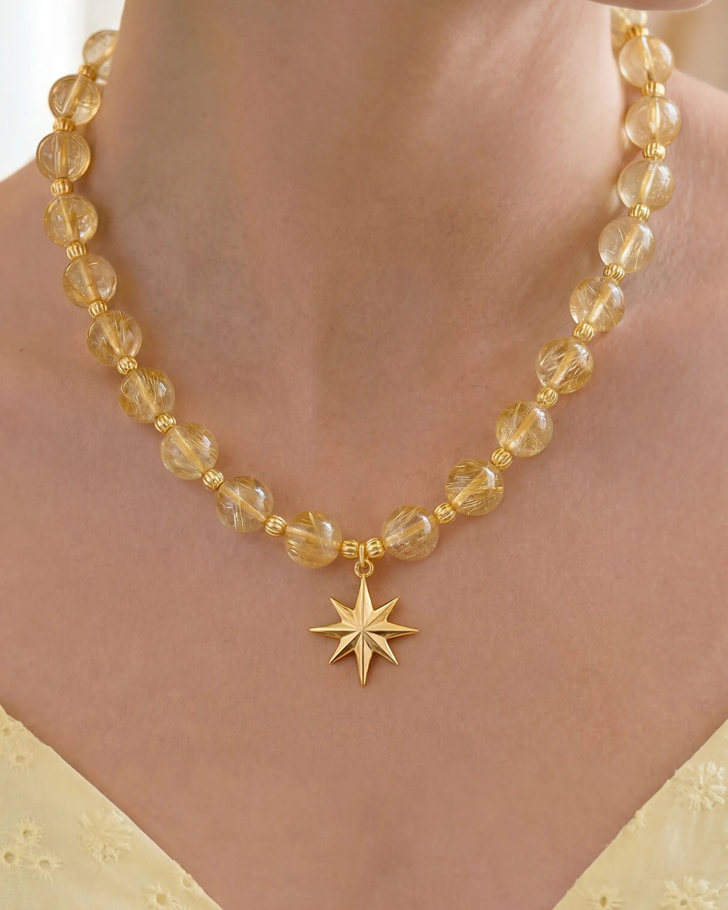 These 10mm rutilated quartz beads feature distinct golden threads and a clear, substantial feel. Known to bring focus, this matched set is cleanly detailed with simple gold spacers and anchored by a gleaming star charm. It provides a quiet sense of optimism, keeping your inner light bright all day.