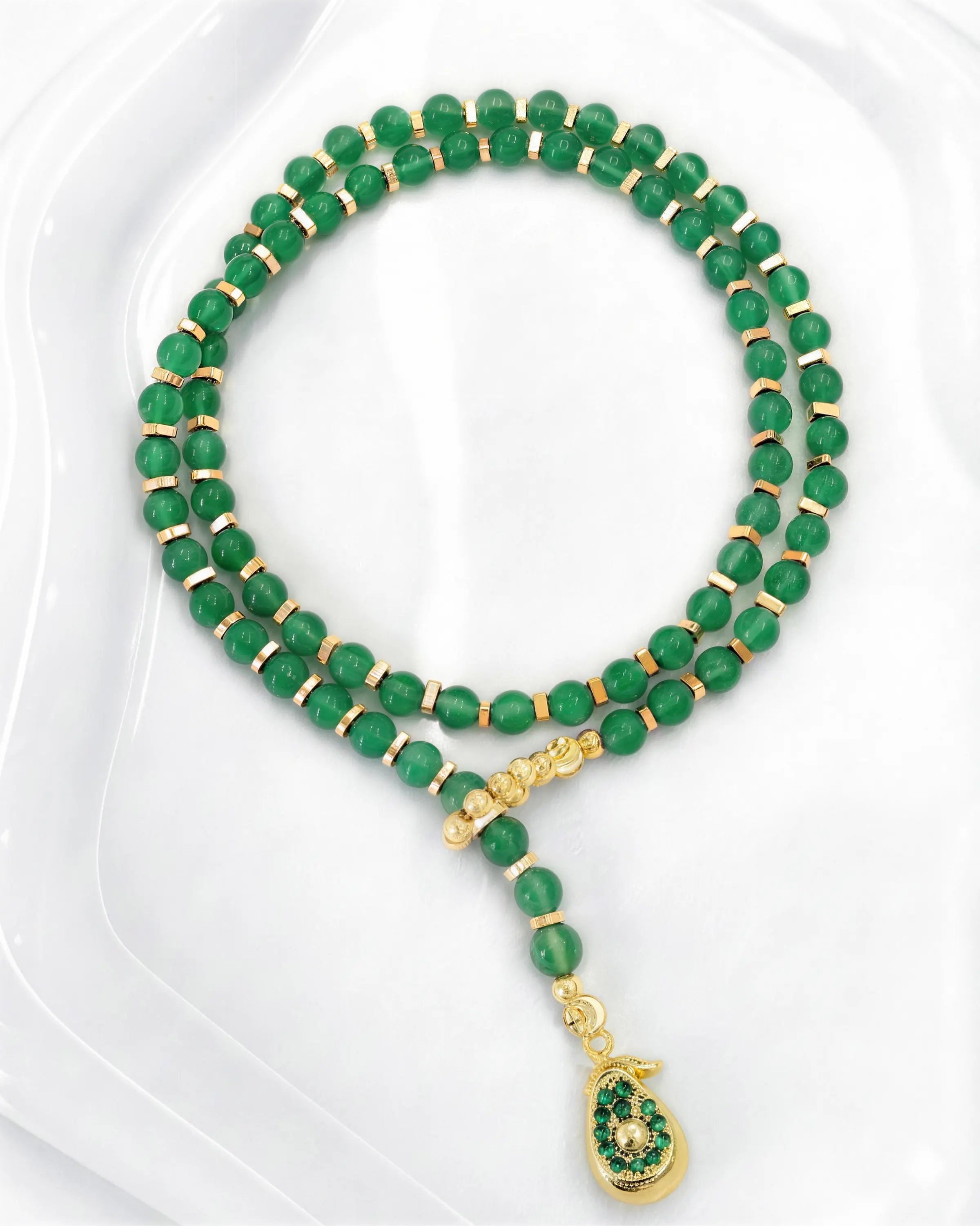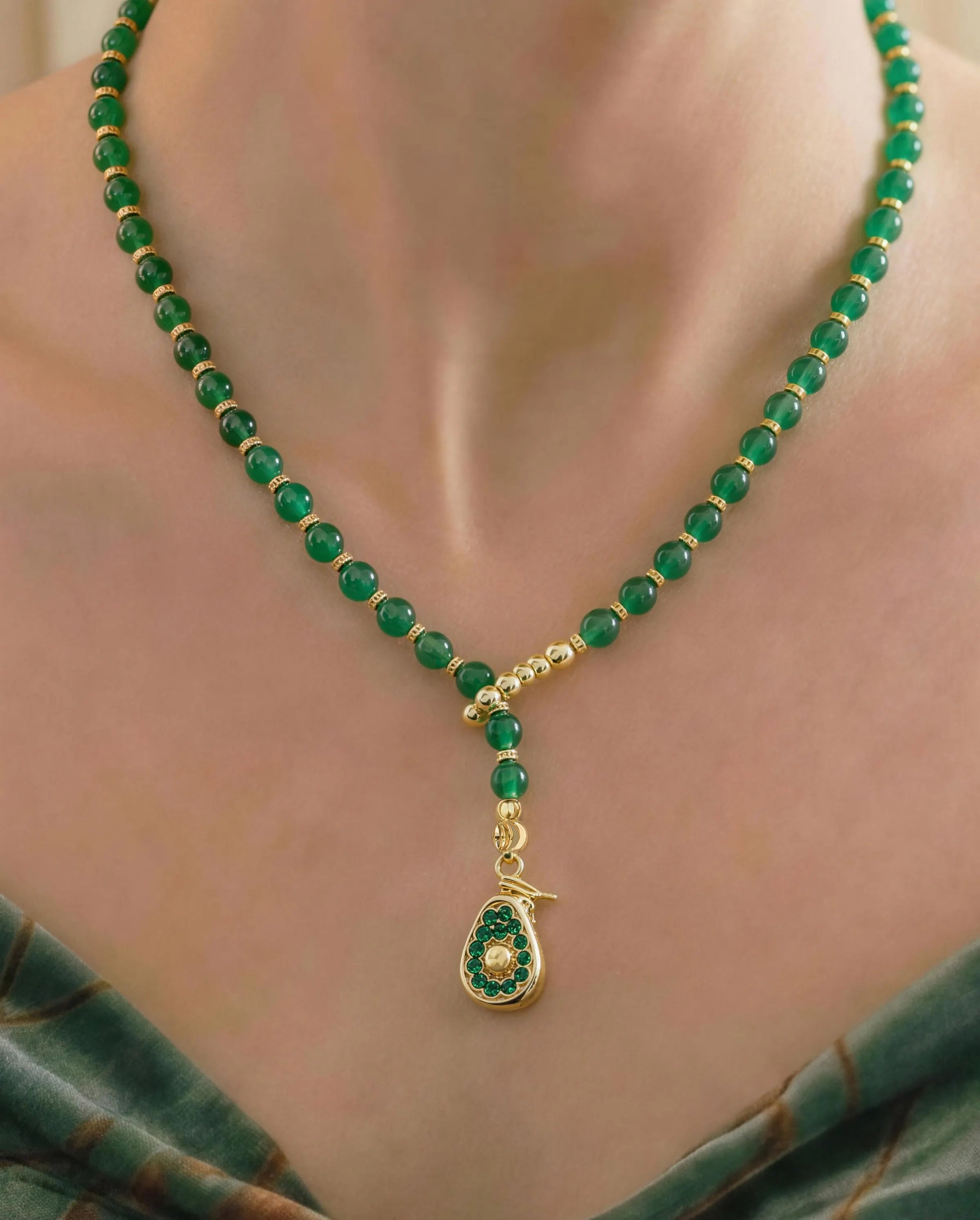 Draping like garden vines, smooth green beads rest gently against the skin. Balance, Harmony — a quiet breath of nature.