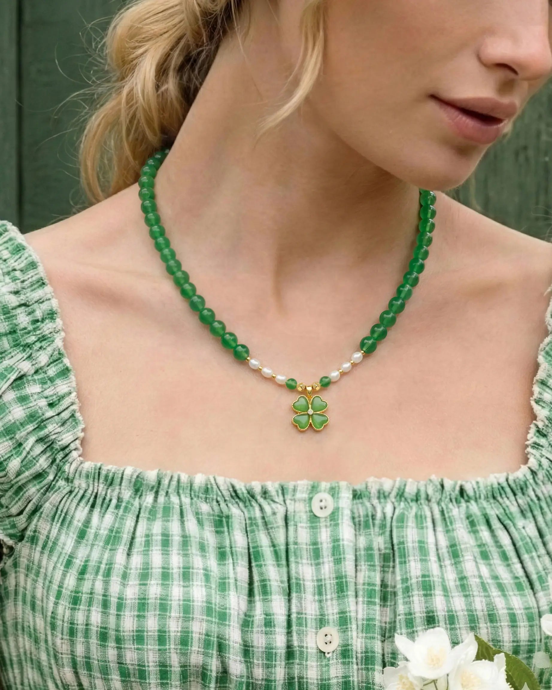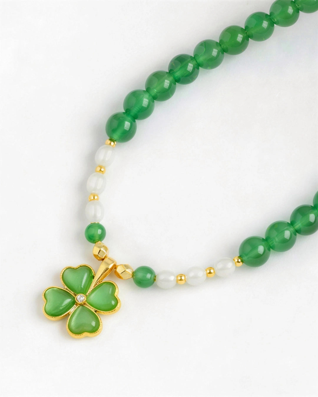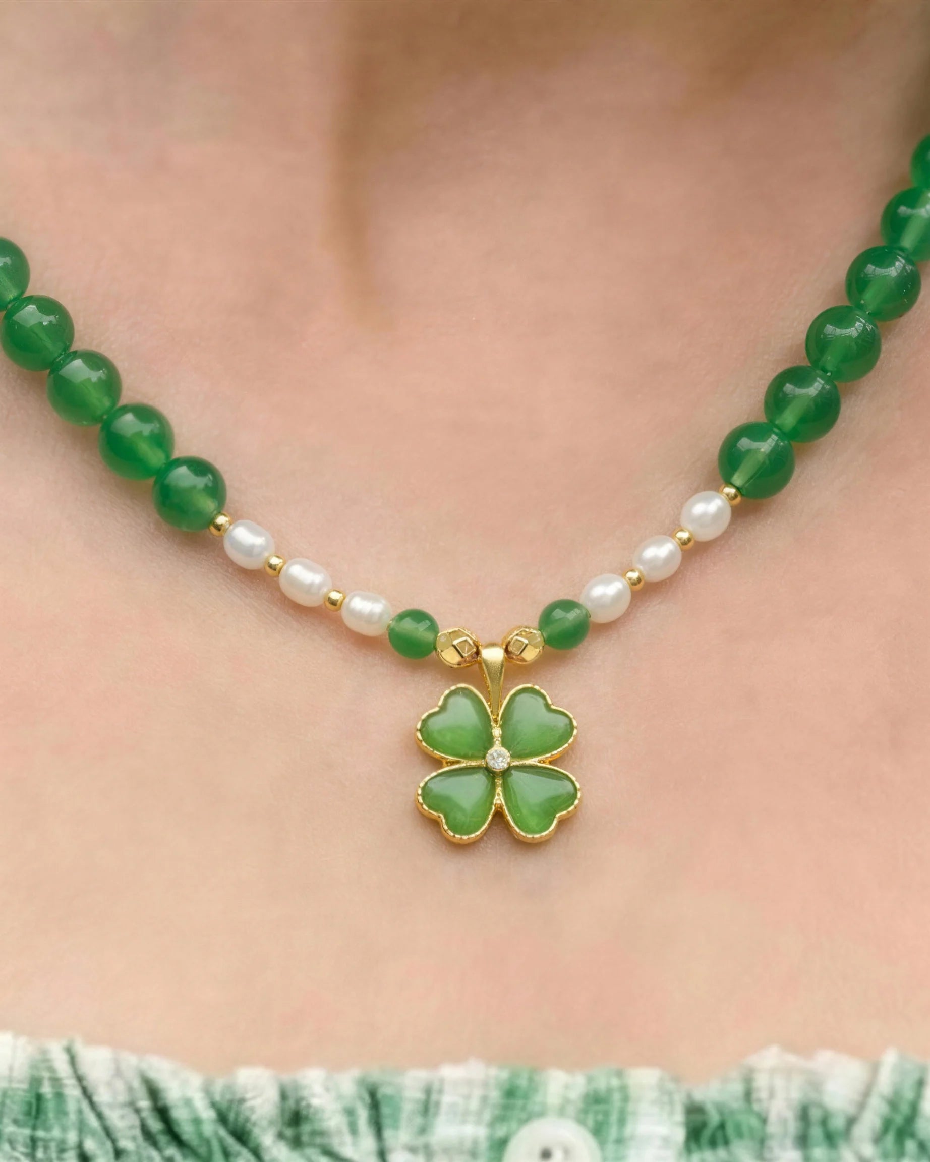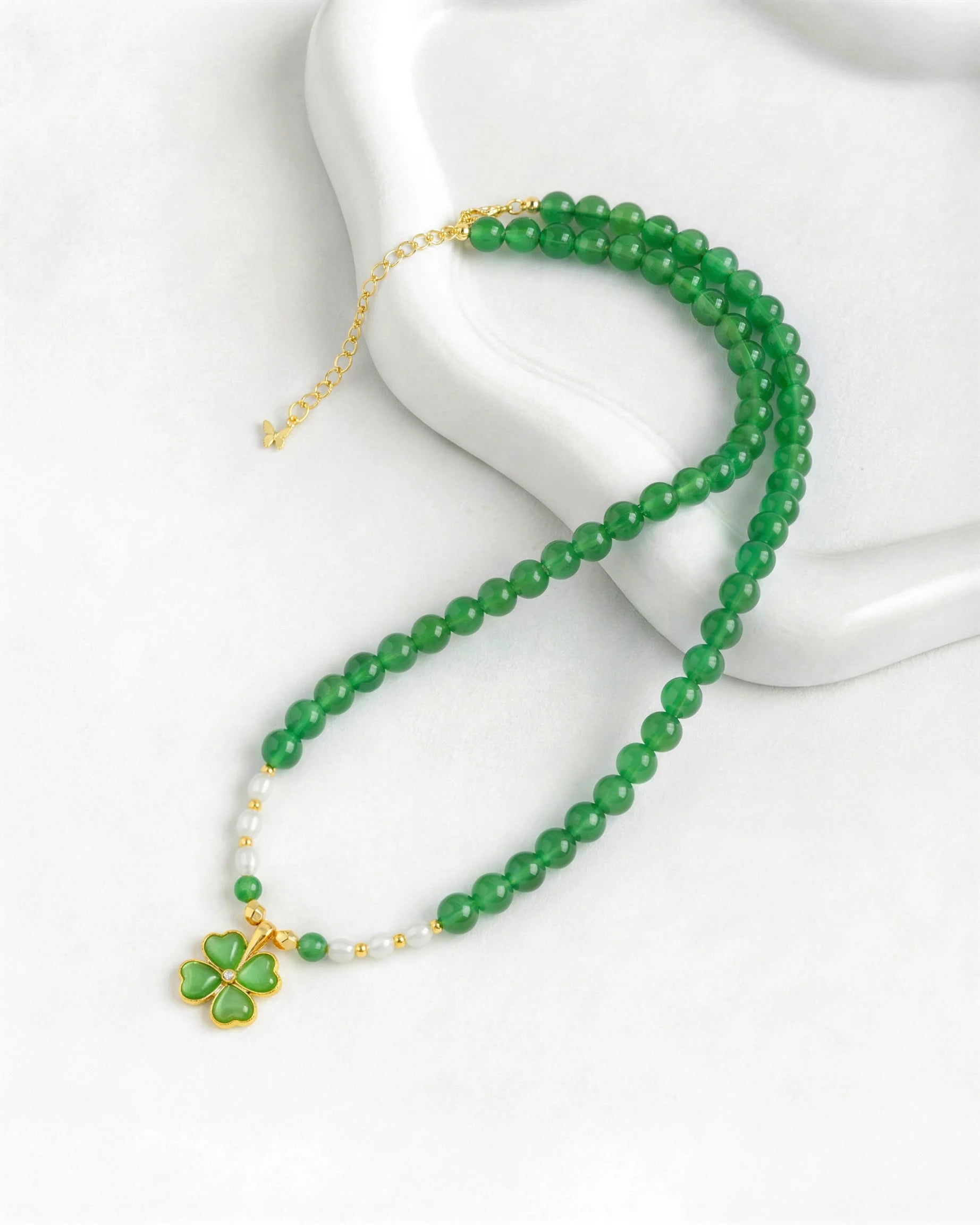 Anchored by a classic four-leaf clover, this design pairs vibrant 6mm green agate beads with tiny pearl accents and gold details. Known for its grounding energy, the delicate stones have a smooth, quiet presence. It offers a lasting sense of balance, like a quiet moment in an open field.