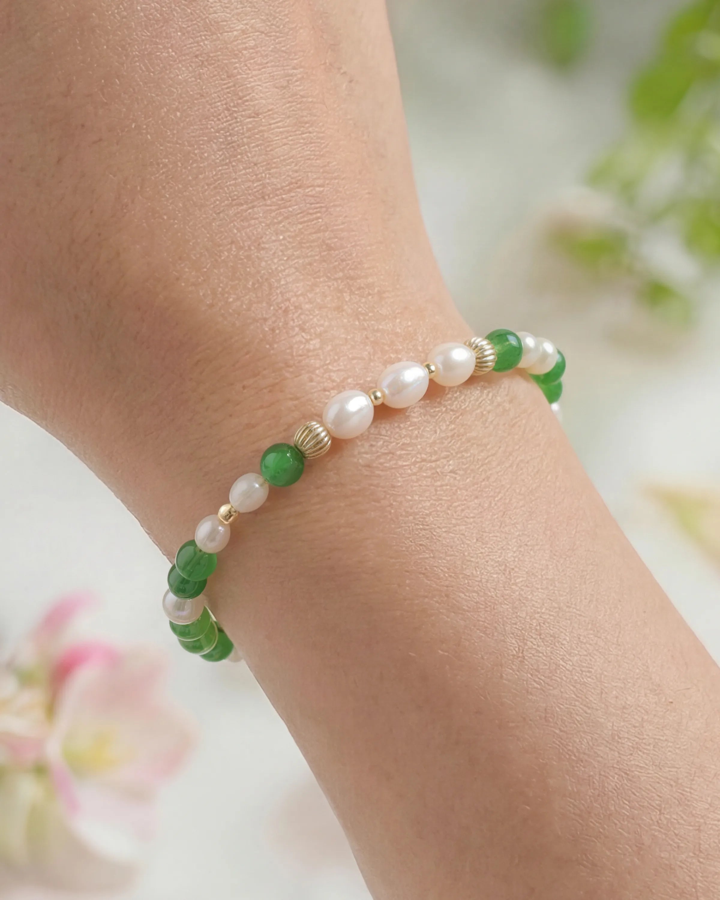 A personal sanctuary for your wrist. The vibrant green Agate beads ground your energy, while the organic luster of freshwater pearls adds a layer of soft elegance. Interlaced with golden accents, it serves as a daily reminder of balance and natural harmony in a busy world.