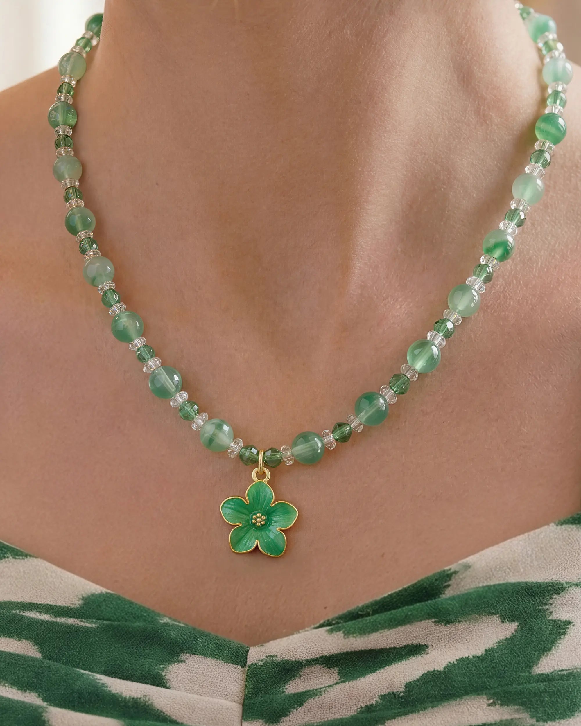 Rich green jade and faceted clear quartz converge at a detailed sakura charm. A cohesive jewelry pairing for balance and renewal.