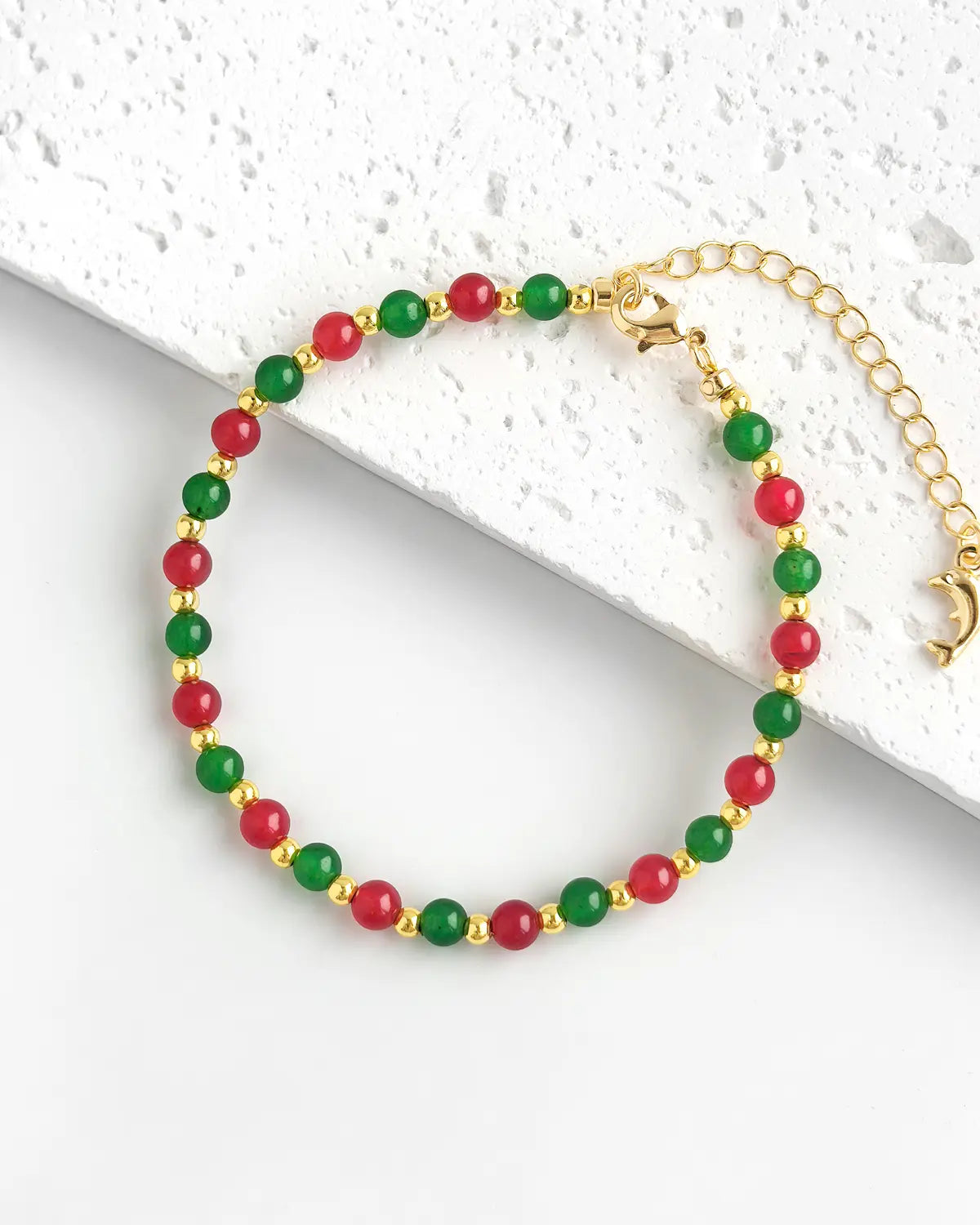 Inspired by a cactus blooming in the desert, this bracelet combines green and red agate beads, accented with gold-toned spacers for warmth and contrast.