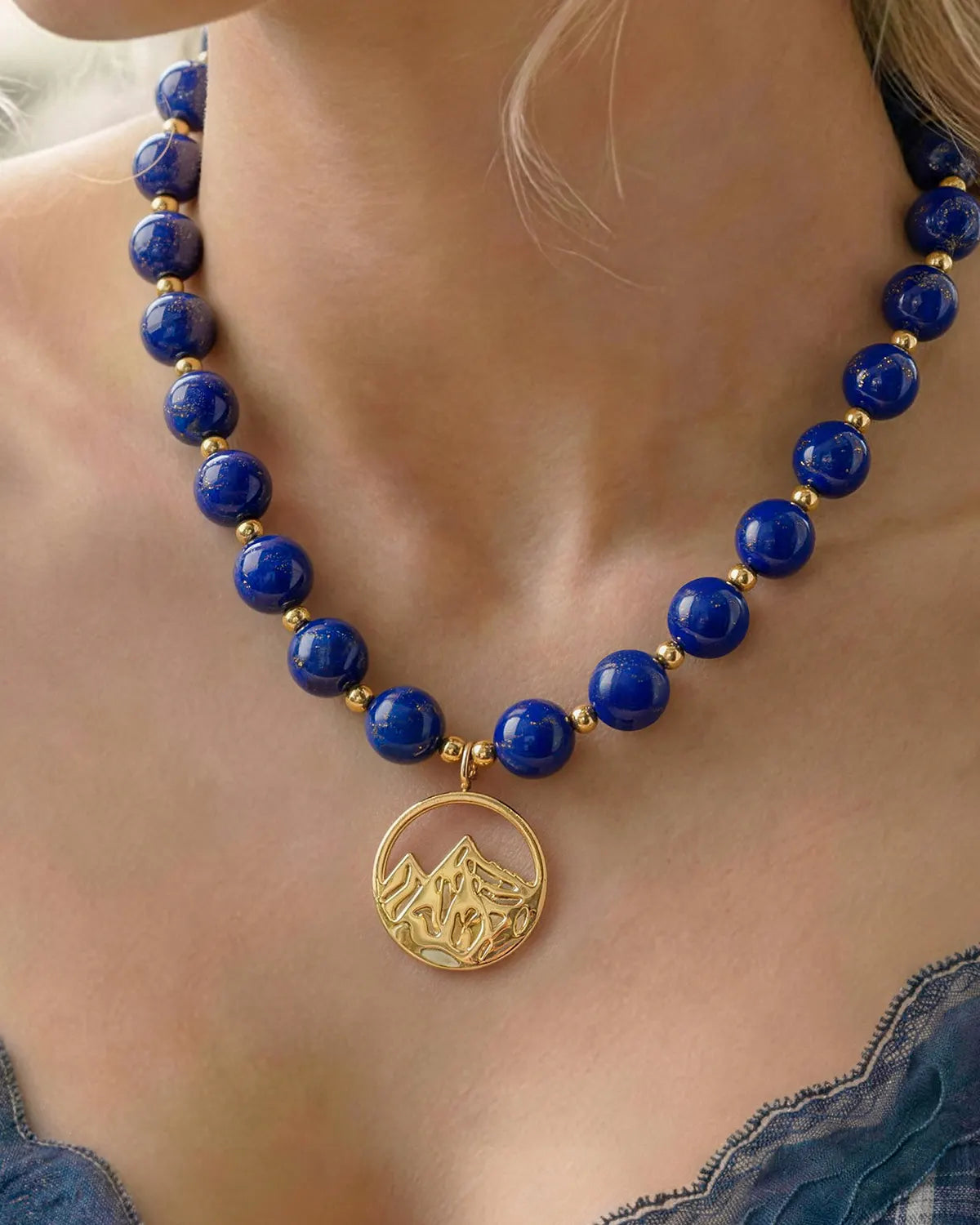 These 10mm lapis lazuli beads feature natural golden flecks and a real, polished weight. Long respected as a stone of deep wisdom, this matched set is cleanly accented by gold spacers and anchored by a detailed mountain pendant. It offers a continuous sense of calm, providing a quiet strength that keeps you grounded in any situation.