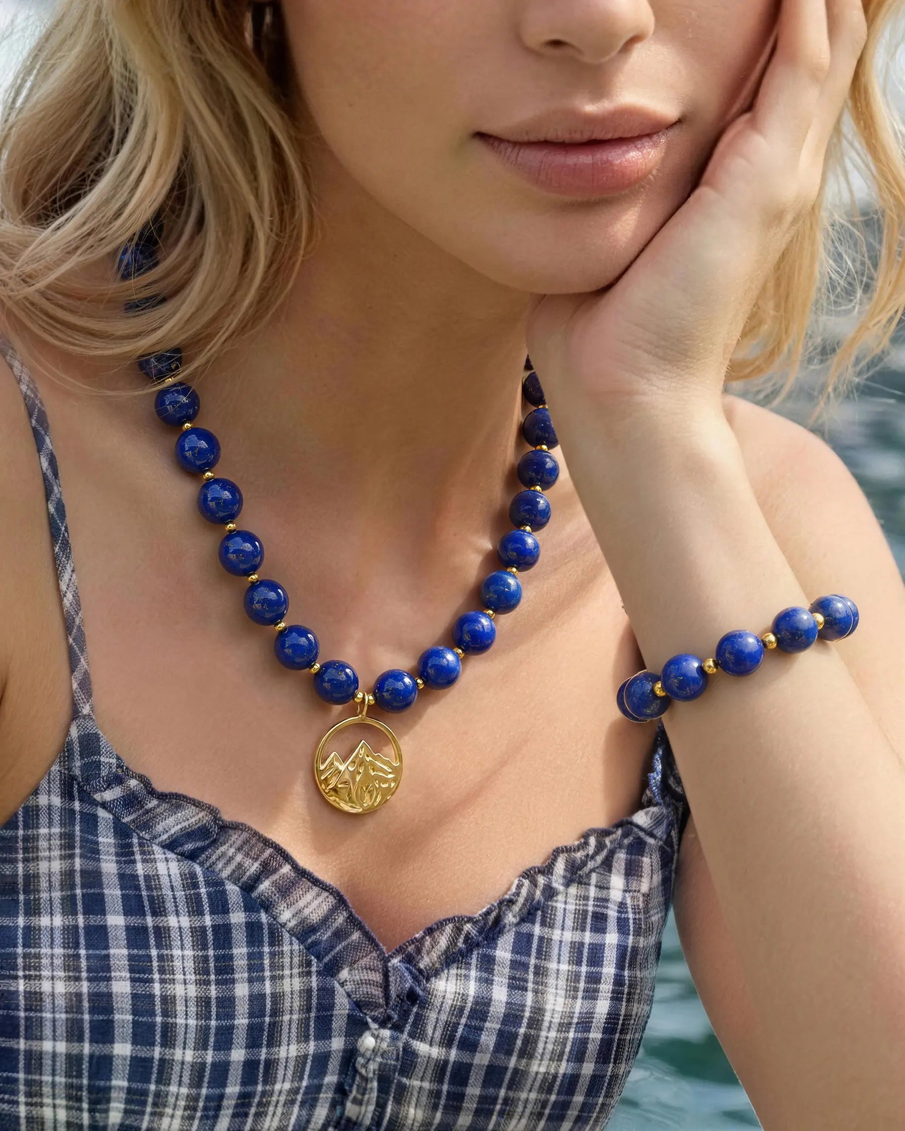 The Luminous Nature collection brings together the steady feel of 10mm gemstones, delicate gold details, and the beauty of natural symbols. Glowing in a deep, midnight Blue, this matched set creates a quiet space for Calm, Clarity, and Serenity.