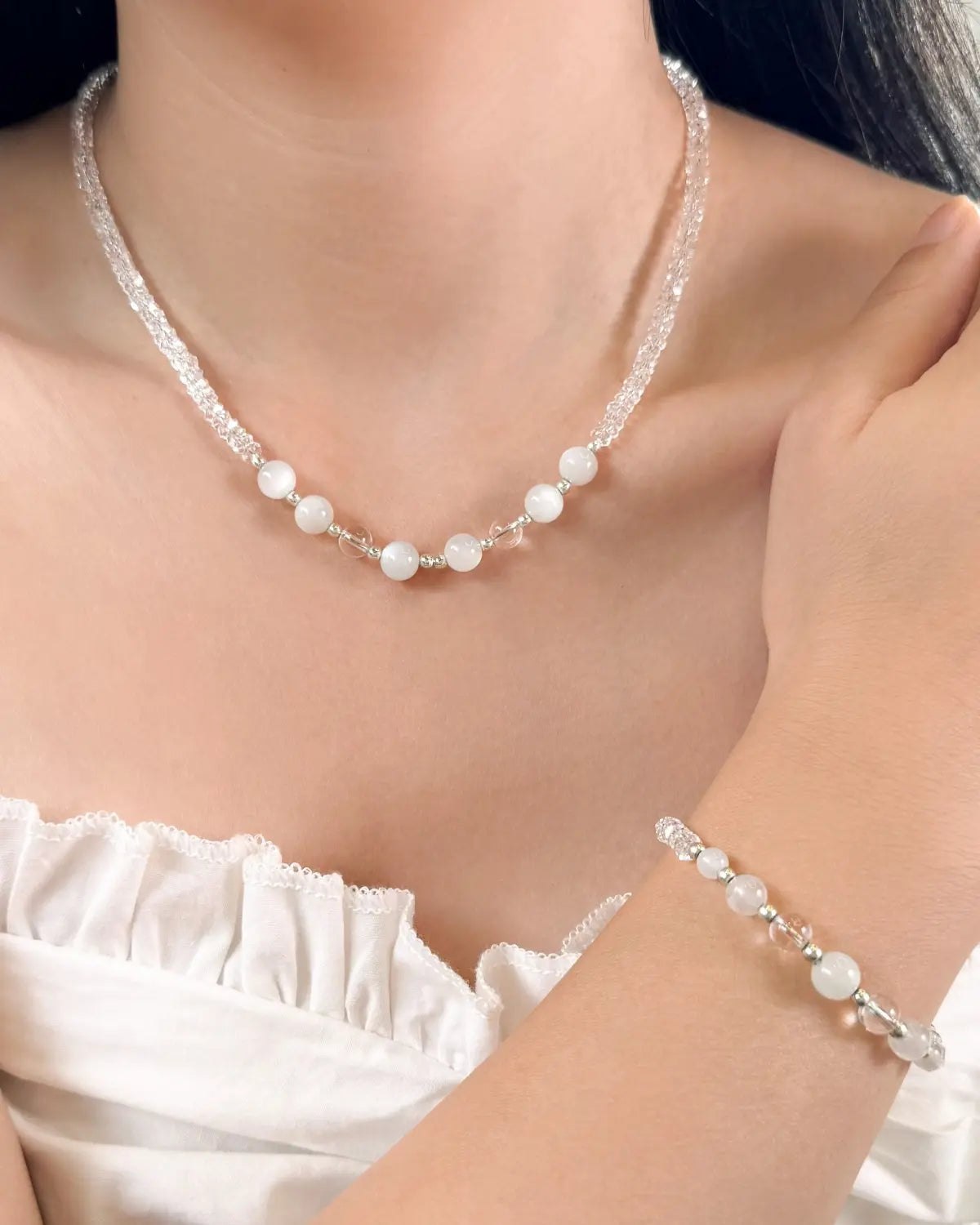 Inspired by white butterflies dancing over a sunlit spring creek, this bracelet features 4–5mm and 6–7mm natural moonstone beads, accented with precision-cut clear quartz chips that enhance their luminous adularescence.
