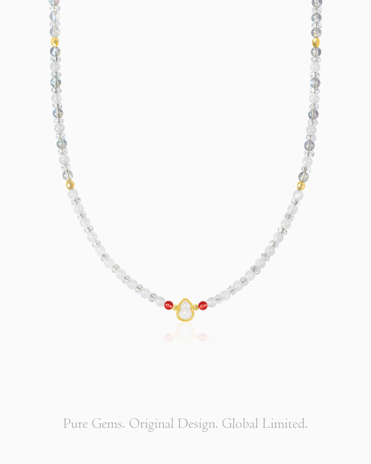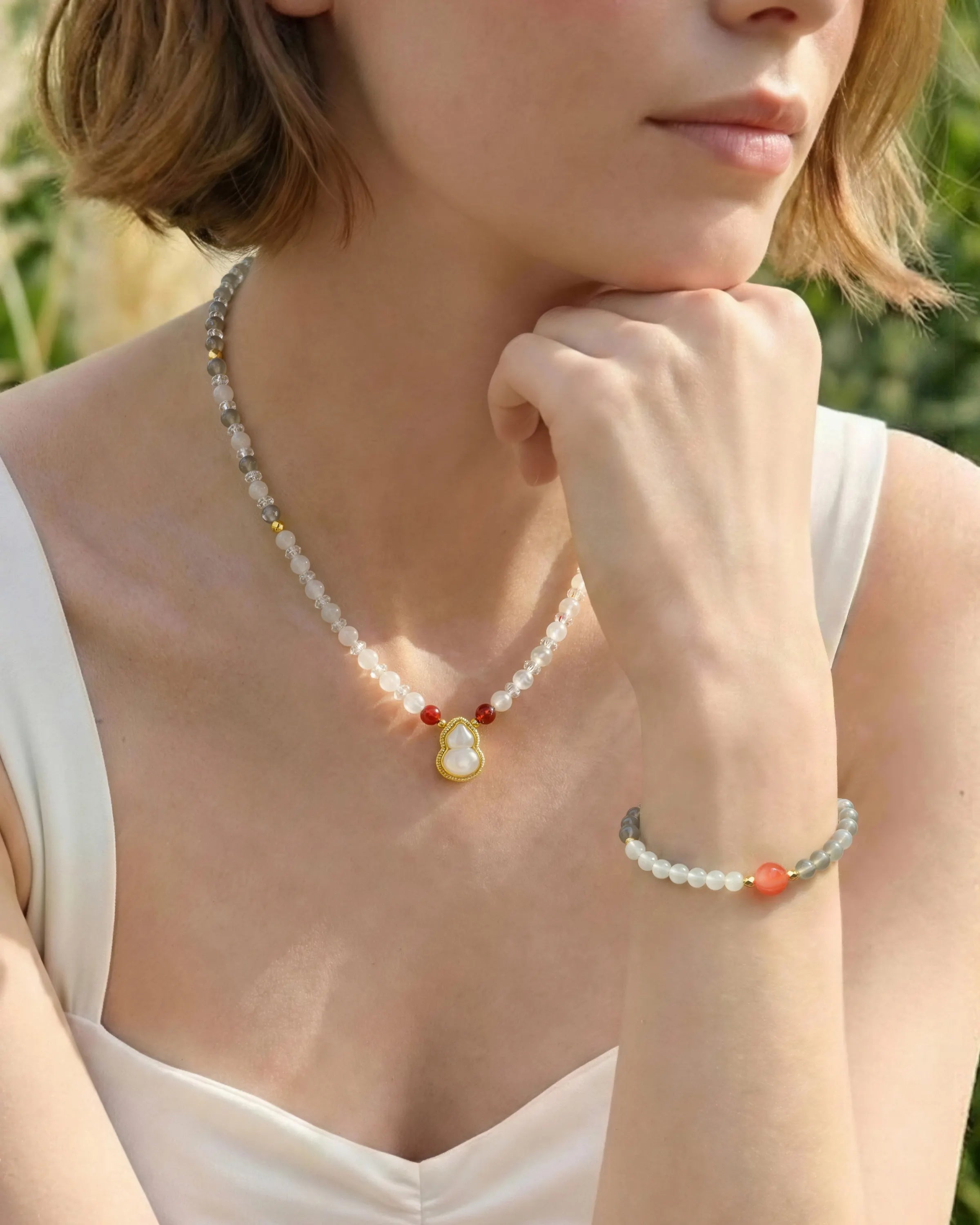 A complete circle of lunar clarity. The serene rhythm of the bracelet harmonizes with the sparkling texture of the necklace, where diamond-cut quartz leads to a creamy jade gourd. Cool milky tones flow seamlessly from wrist to neckline, creating a unified field of calm. Worn together, they wash away daily noise, centering your spirit and guiding you toward fresh beginnings.