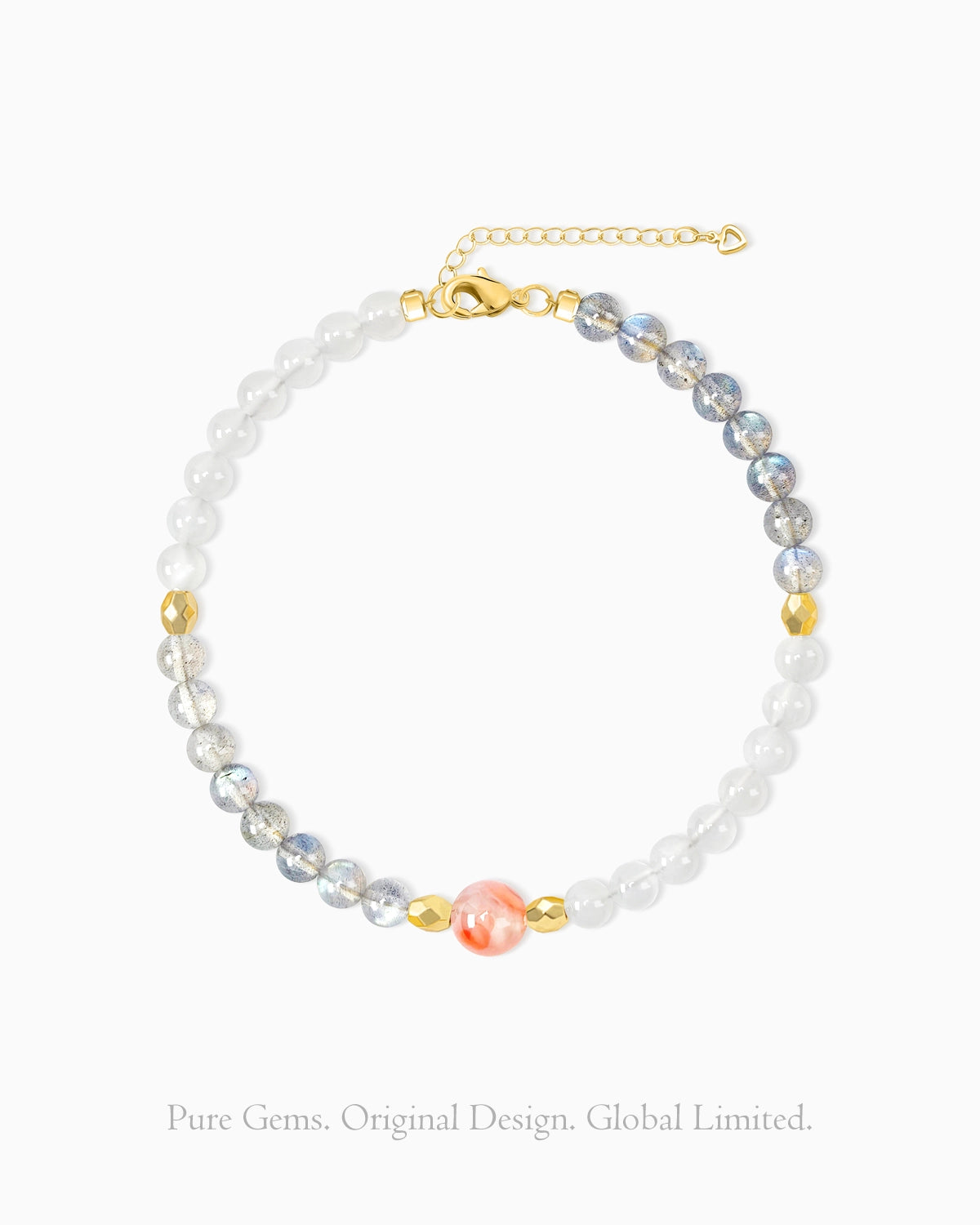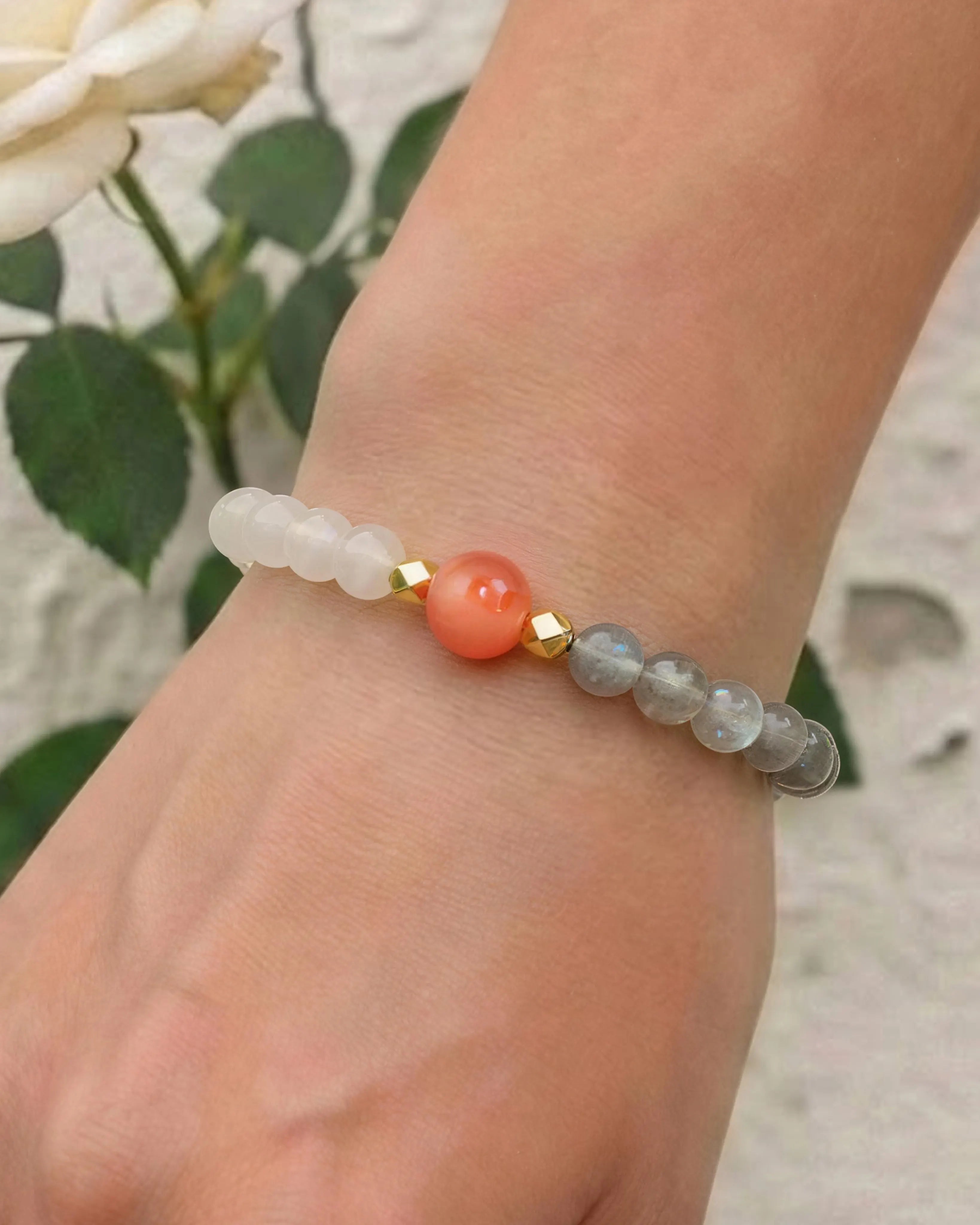 Bracelet: White & Gray Moonstone 4mm, Red Agate 6mm